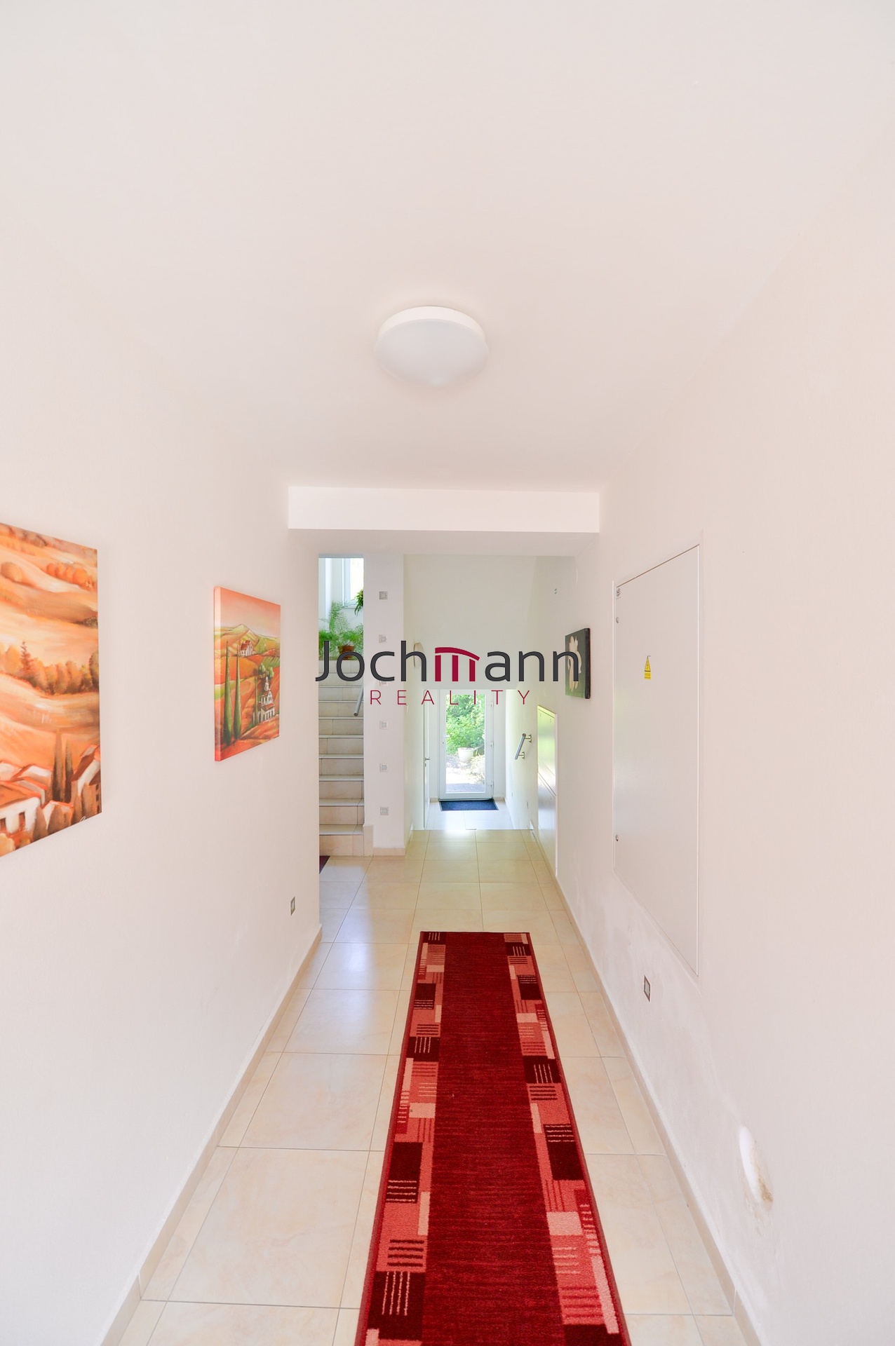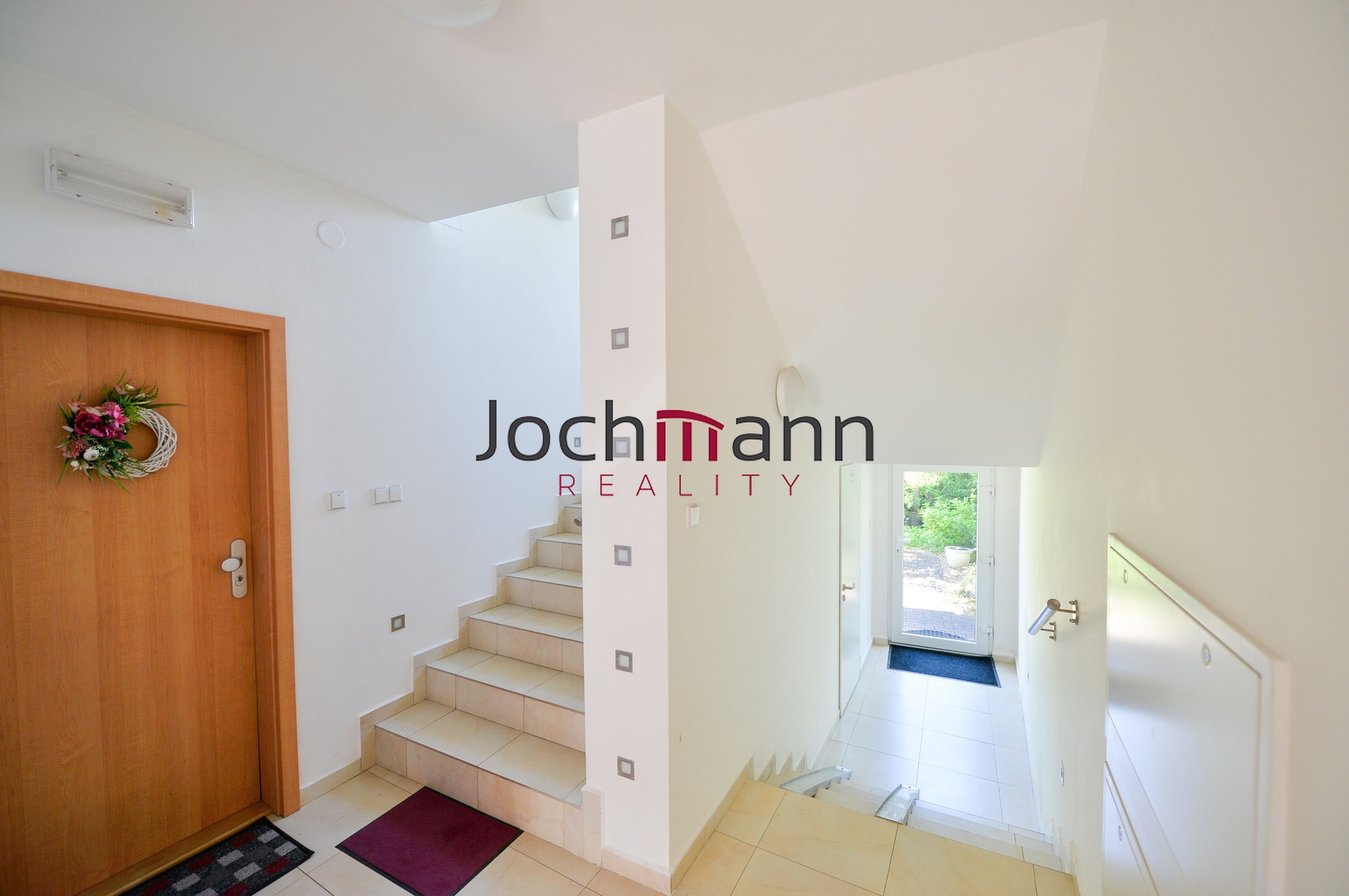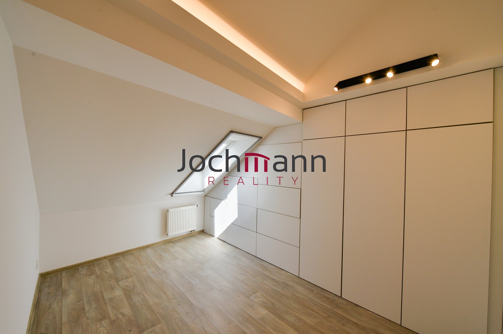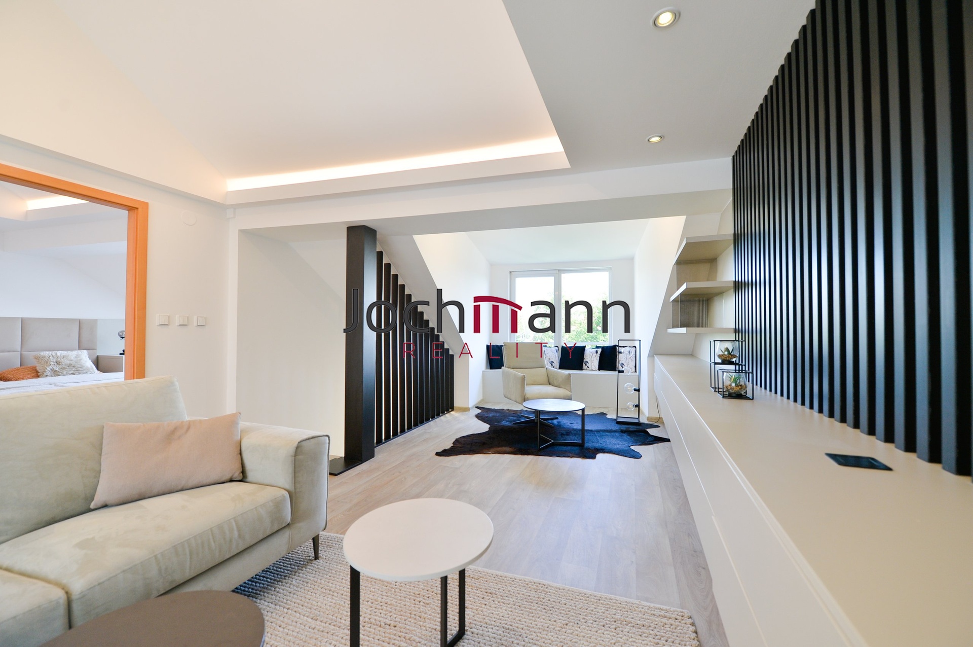 V patře bytu se nachází dva další samostatné kompletně vybavené pokoje (ložnice a druhý pokoj) a prostorná obývací místnost s designovými prvky. V neposlední řadě byt disponuje koupelnou se sprchovým koutem, toaletou a pračkou a sušičkou.