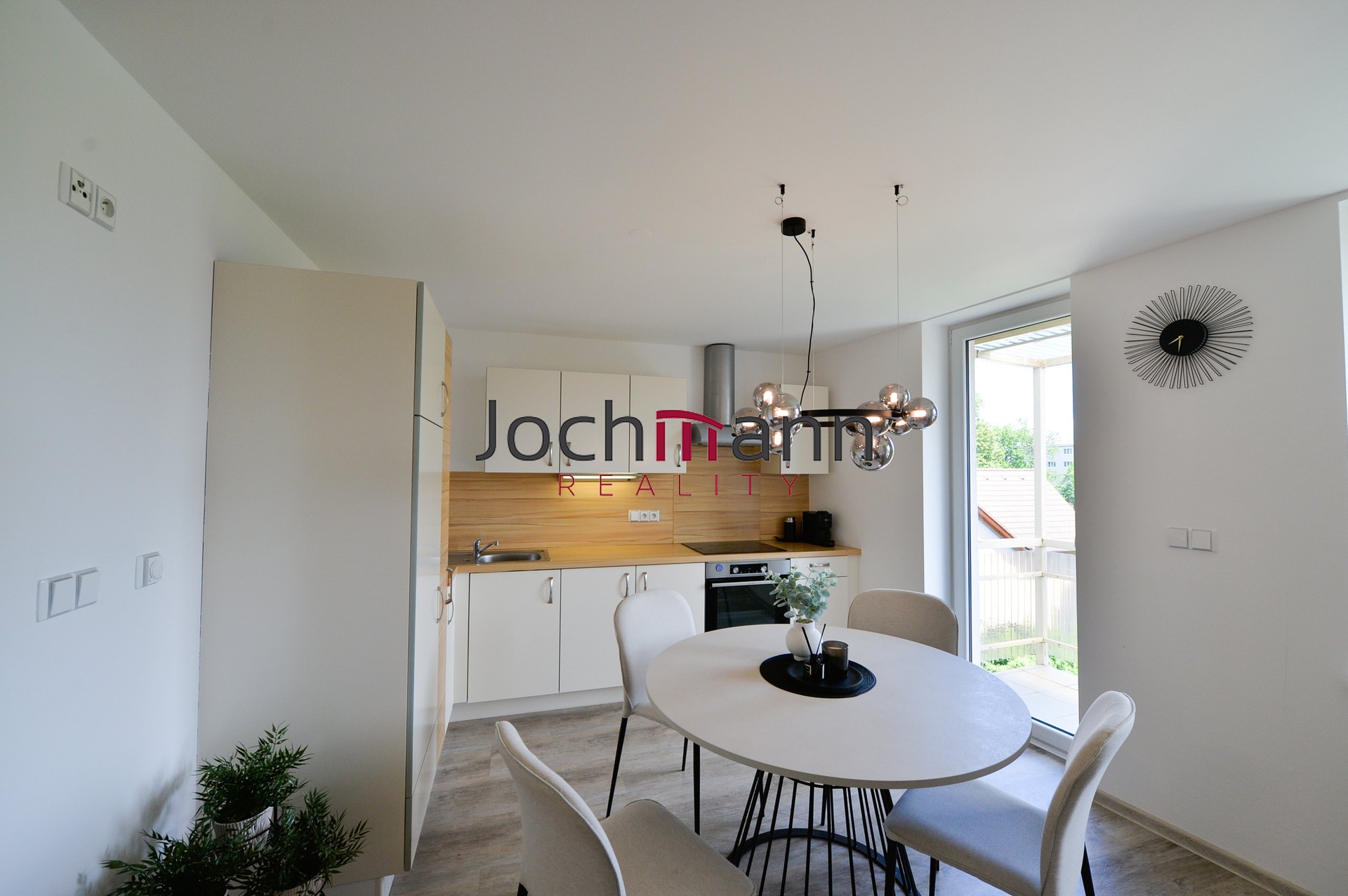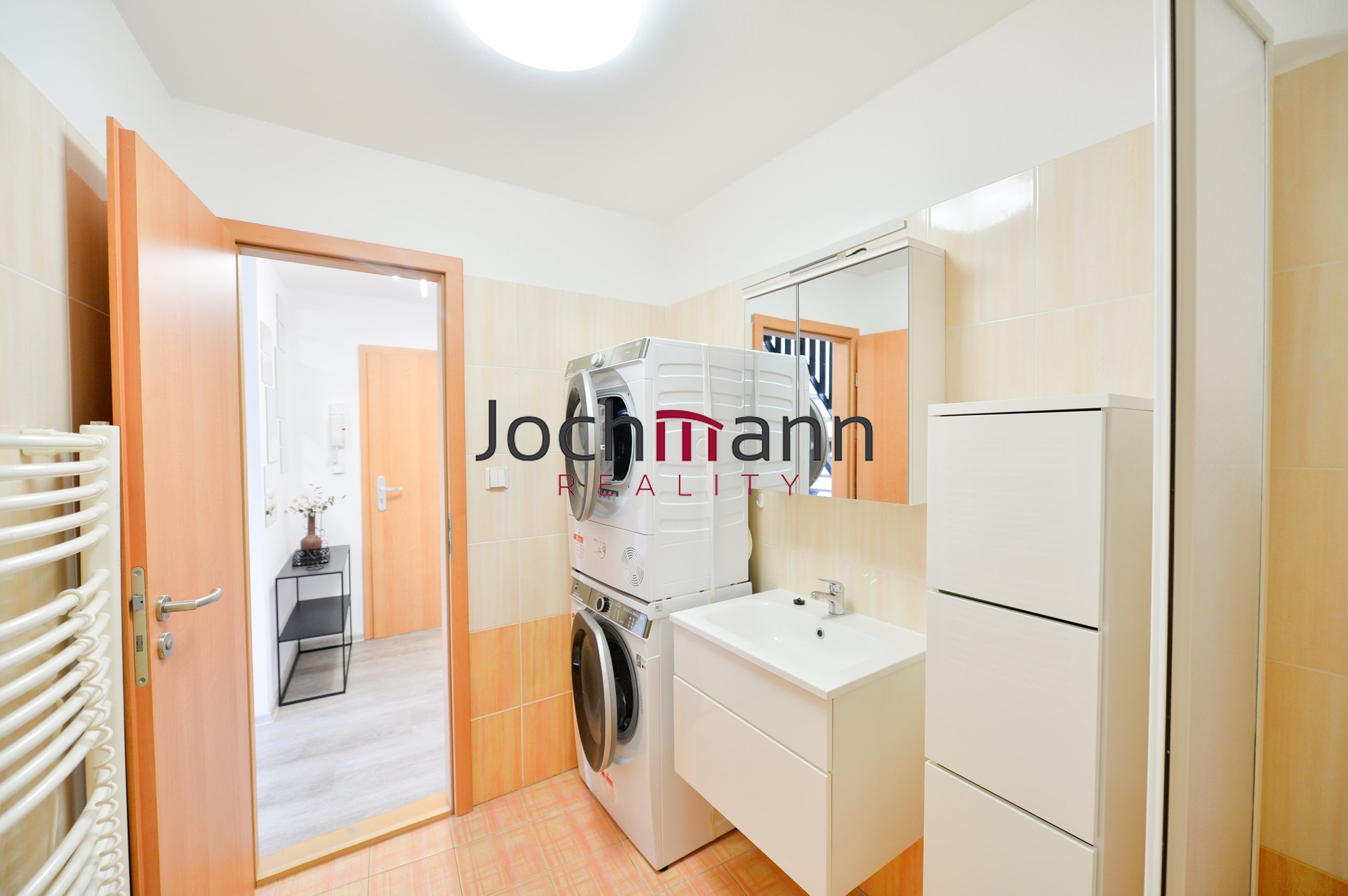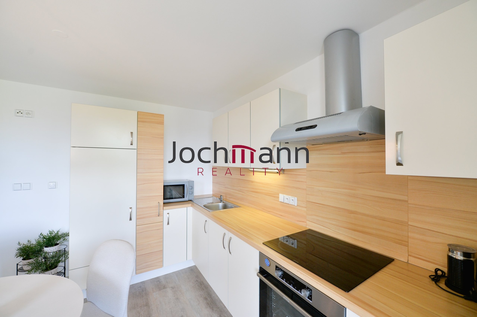 Moderní a vkusně zařízený byt disponuje vstupní částí s vestavěnou skříní na míru, dále pak kuchyní s plně vybavenou kuchyňskou linkou (elektrická varná deska, trouba, digestoř, vestavěná lednice s mrazákem), jídelní sestavou a výstupem na balkon, který nabízí krásný výhled na řeku.