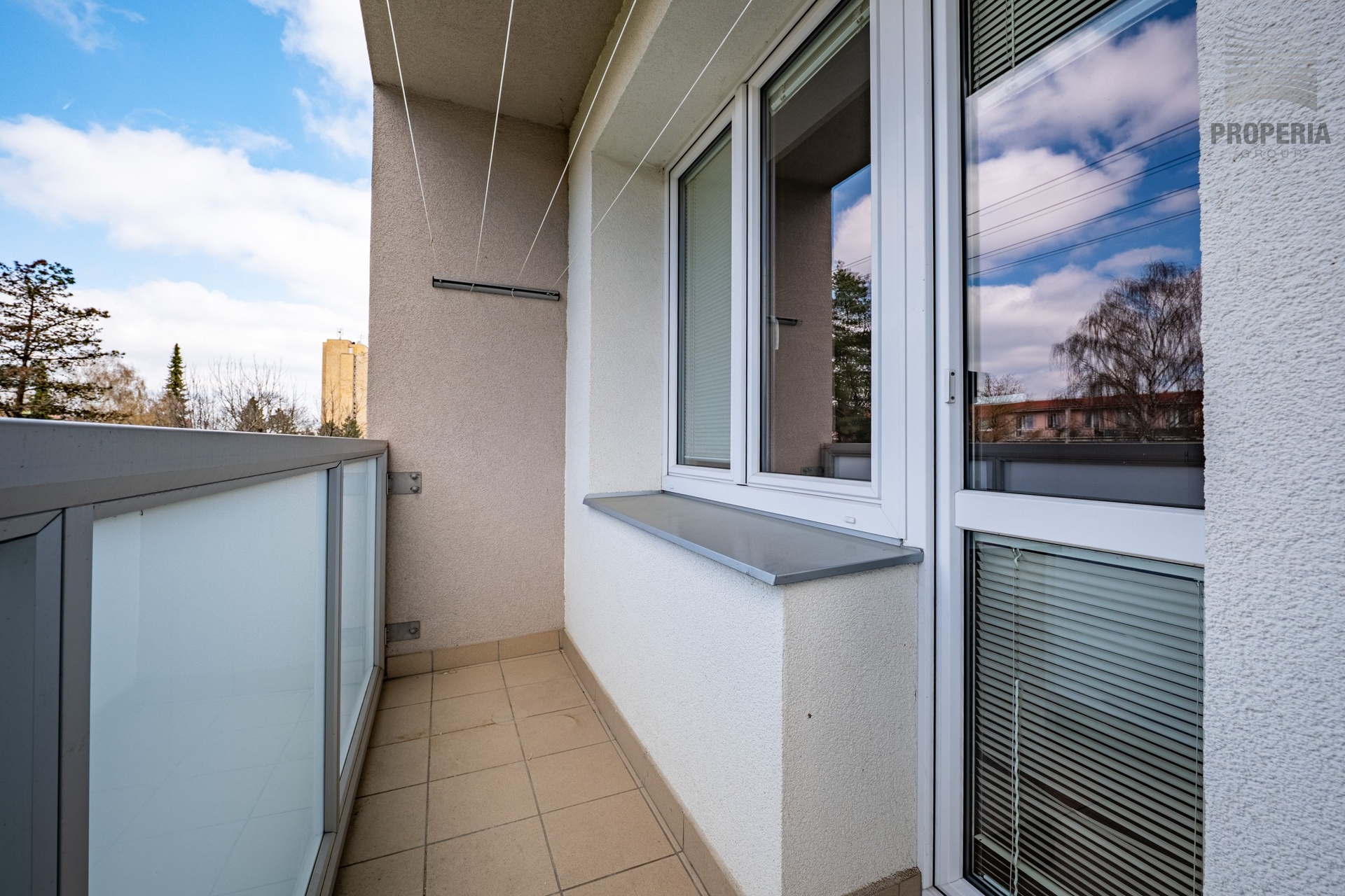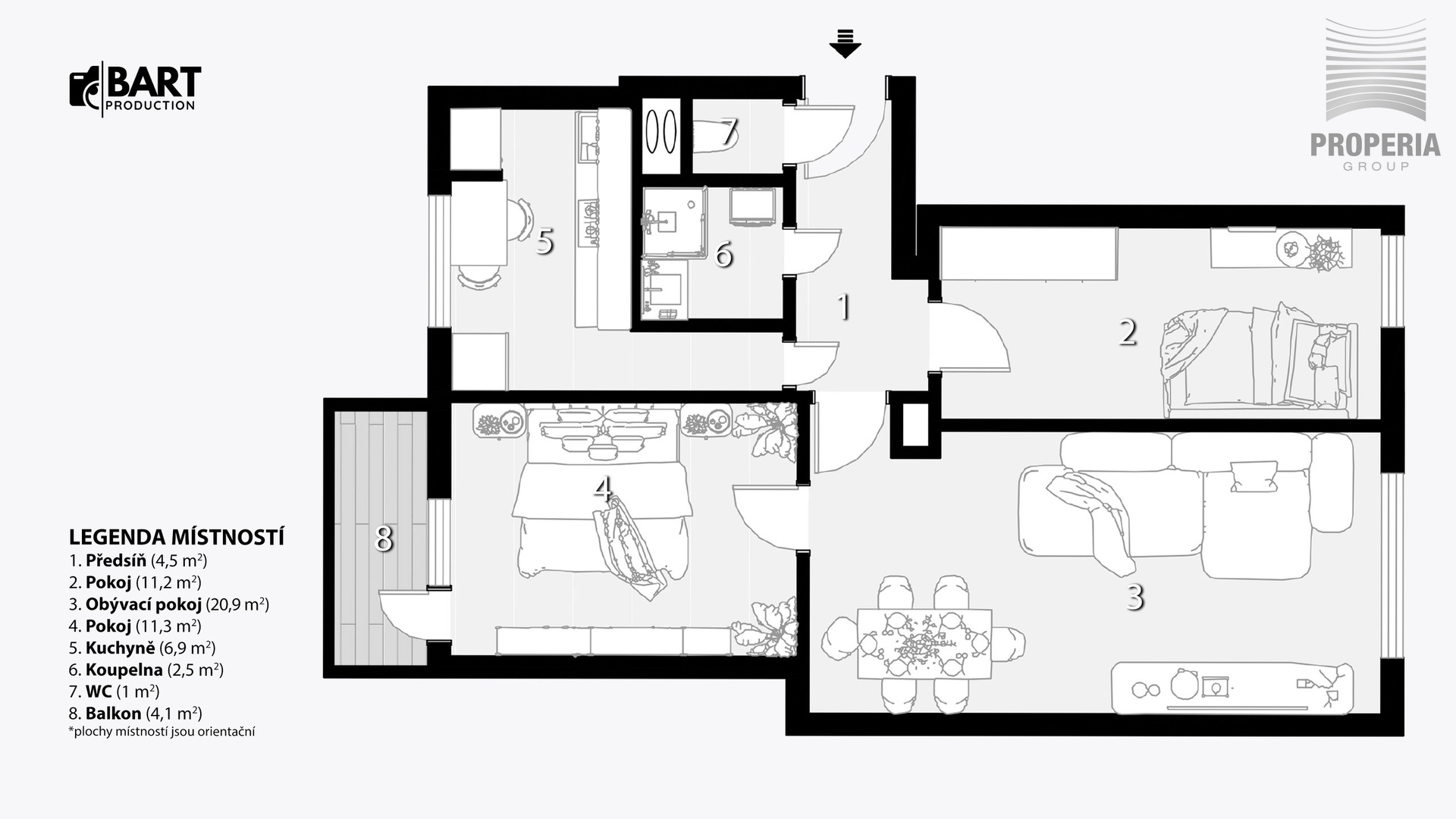 Dispozice bytu tvoří prostorný obývací pokoj o velikosti 20,9 m², dvě samostatné ložnice o velikosti 11,3 m² a 11,2 m², samostatná kuchyně o velikosti 6,9 m², koupelna, samostatné WC, předsíň a lodžie o velikosti 4,1 m². Velkou výhodou bytu je právě lodžie orientovaná do klidného zeleného prostoru, která zvyšuje celkový komfort bydlení.