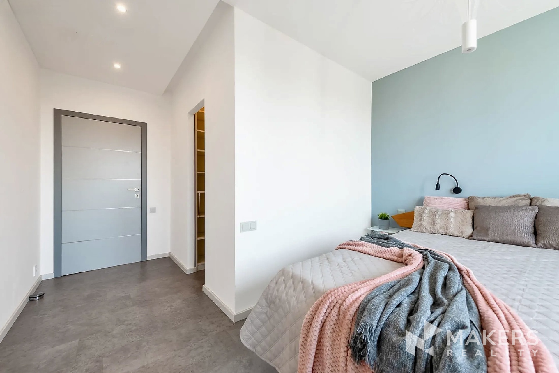 Dispozice bytu zahrnuje obývací pokoj s lodžií orientovanou na západ, ideální pro večerní posezení, dále novou sedací soupravu s elektrickým výsuvem, která může sloužit i pro příležitostné spaní, hlavní ložnici s vlastní walk-in šatnou a druhou ložnici či pracovnu orientovanou na severovýchod – ideální pro práci z domova.