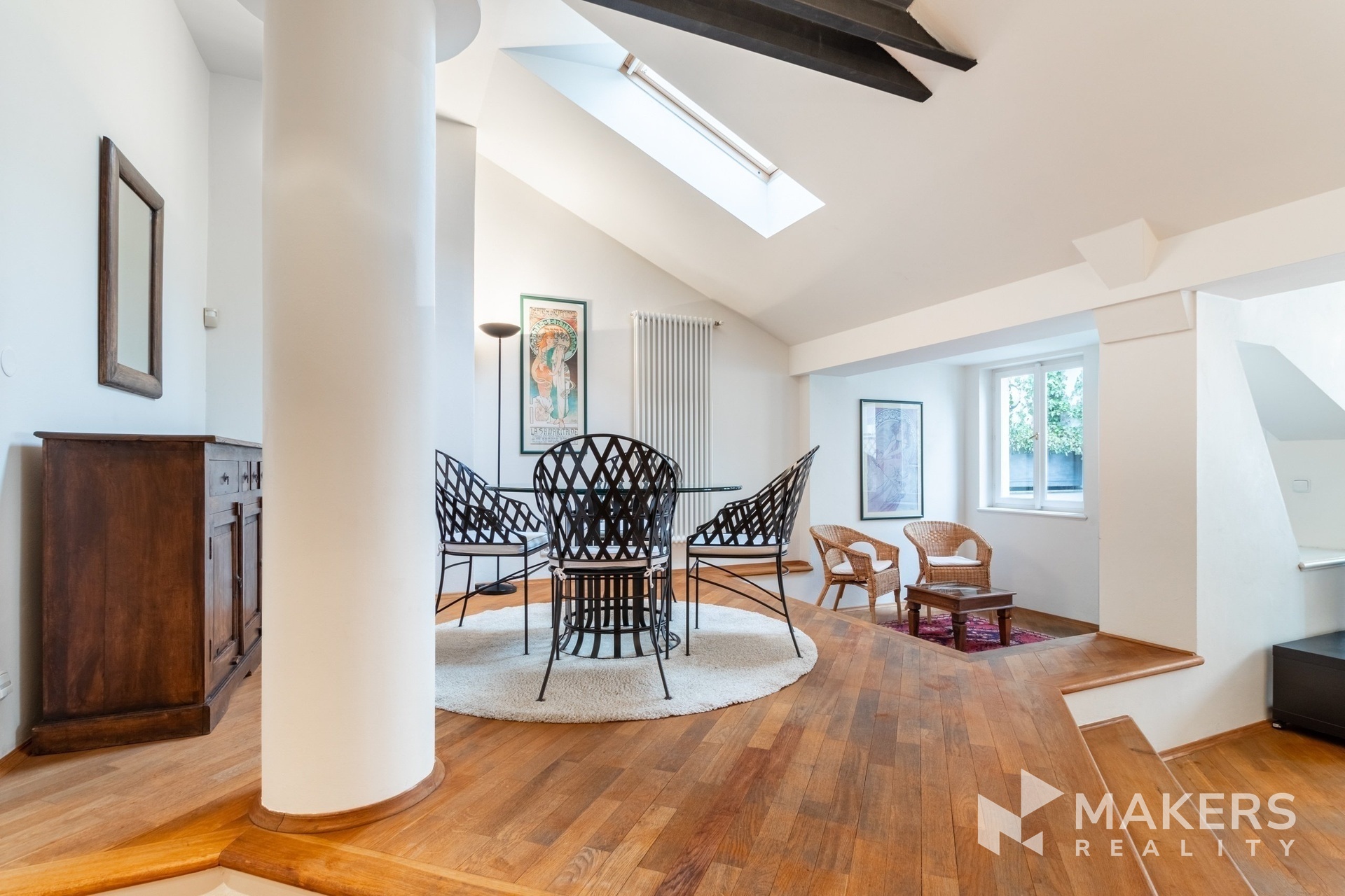 Nabízíme jedinečný dvoupodlažní půdní byt o rozloze 96 m² v 5. a 6. patře cihlového domu. Byt poskytuje magický výhled na pražské střechy a malý balkón s břečťanem u obývacího pokoje. Je plně vybaven luxusním nábytkem a vhodný pro 4 dospělé osoby.