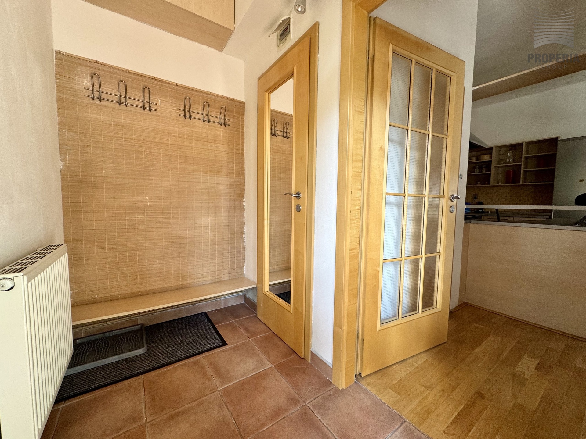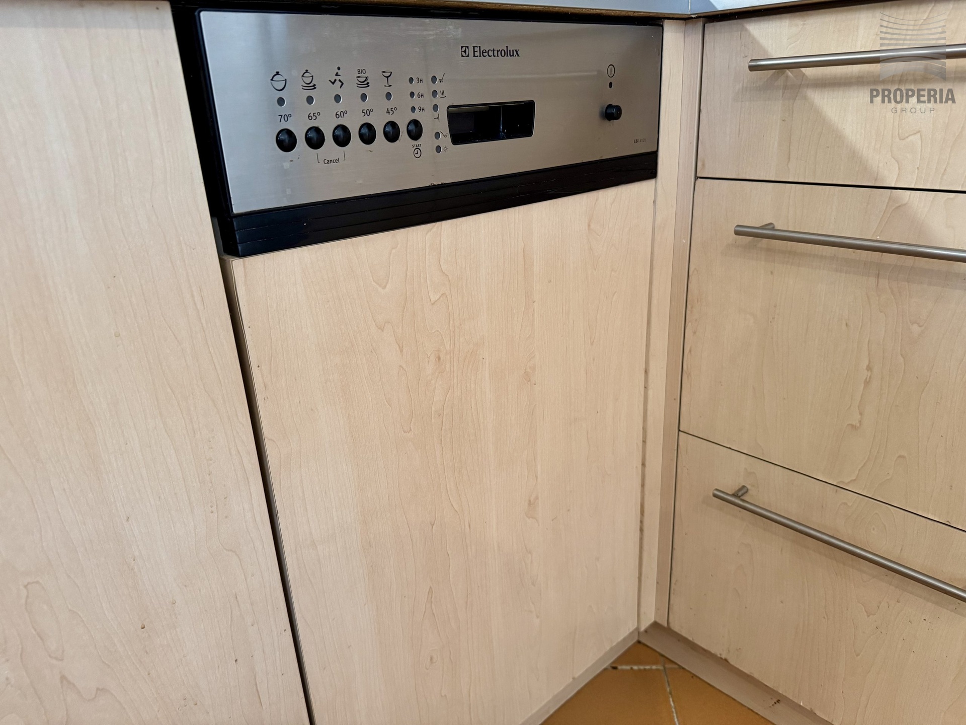 Velkorysý obývací pokoj s kuchyňským koutem (západ) je orientovan do vnitřního bloku se zahradou a je vybaven jídelní nábytkovou sestavou, sedací soupravou, ledničkou s mrazničkou, myčkou nádobí a kombinovaným sporákem s plynovou varnou deskou. V koupelně s vanou je k dispozici automatická pračka. Toaleta je samostatná. Obě ložnice jsou orientovány východním směrem do klidné ulice a jedna z nich má prostornou šatnu.