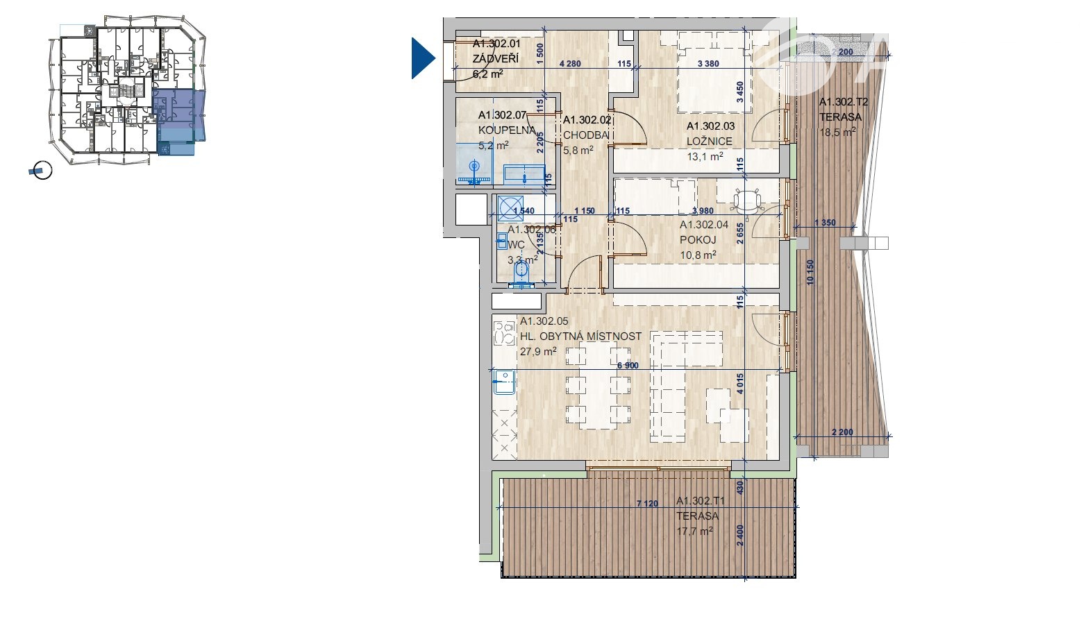 Nabízím k pronájmu byt 3kk v atraktivní lokalitě o celkové ploše 130 m² - terasami o velikosti 17,7 m² a 18,5 m², umístěný v 3. nadzemním podlaží novostavby Allrisk MERIDIEM na ulici Komárovská.