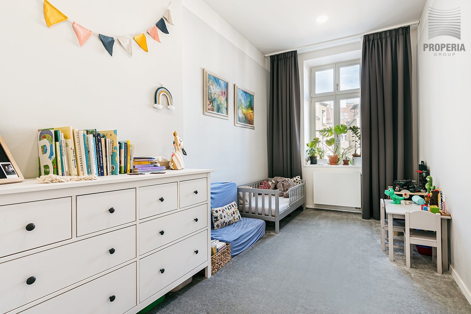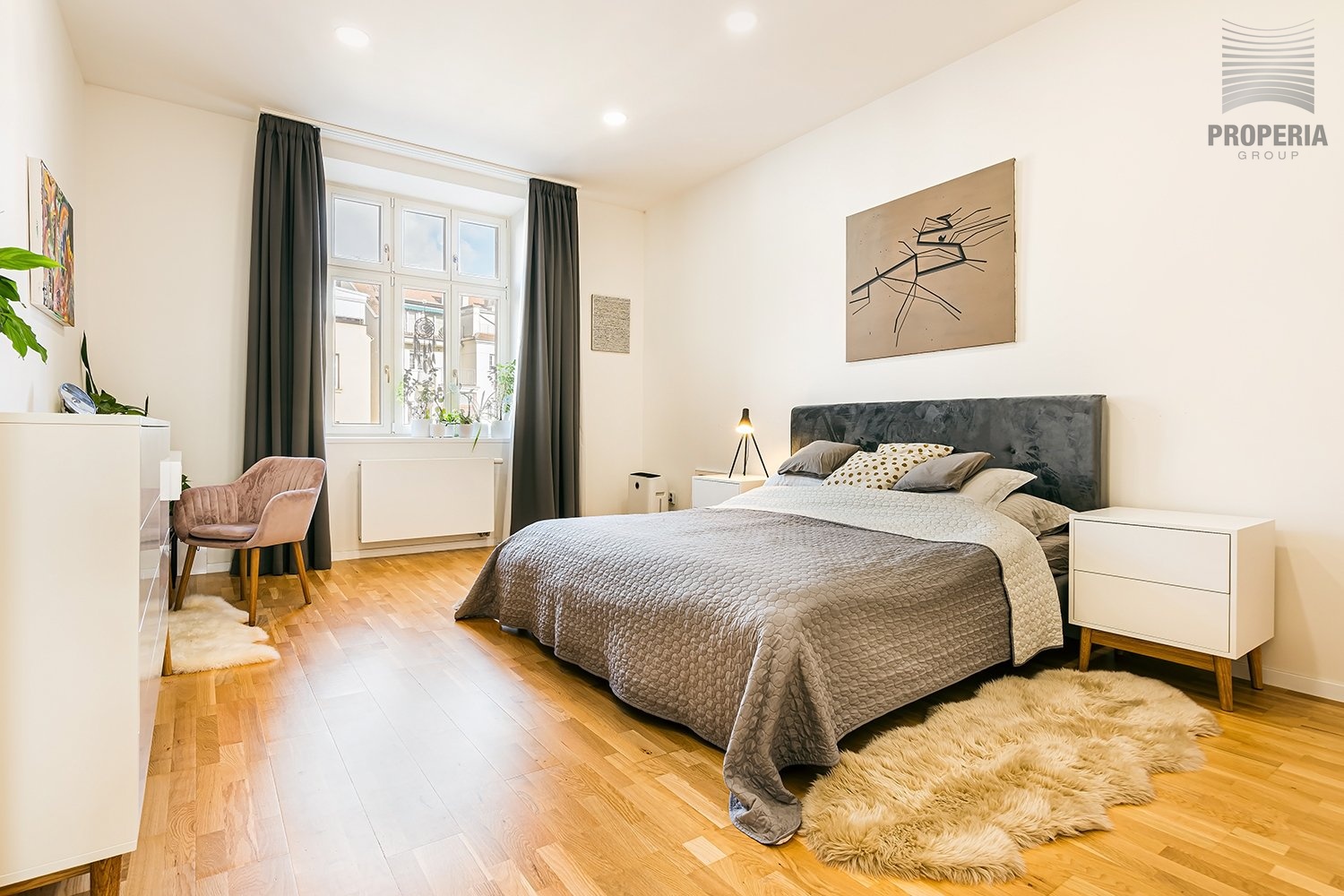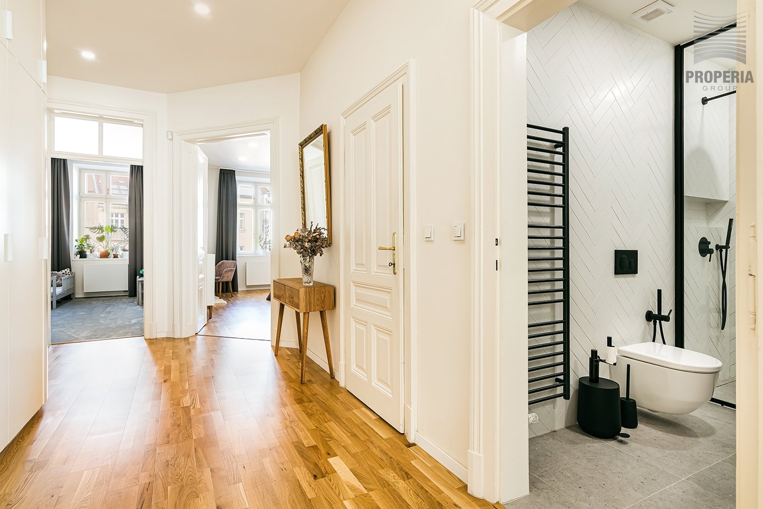 Dominantou bytu je velkorysý obývací pokoj propojený s kuchyní a jídelnou. Atmosféru podtrhuje přirozené světlo proudící skrze vysoká okna, doplněná o elegantní textilie. Dubové podlahy a světlé tóny stěn vytvářejí klidný, nadčasový základ, který padne každému stylu. Komfort v letních měsících zajišťuje klimatizace.