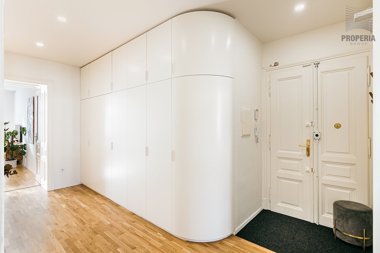 Vstupní hala vyniká chytře řešeným úložným prostorem v podobě velkých vestavěných bílých skříní s oblými hranami, které maximalizují prostor a zachovávají minimalistický styl.