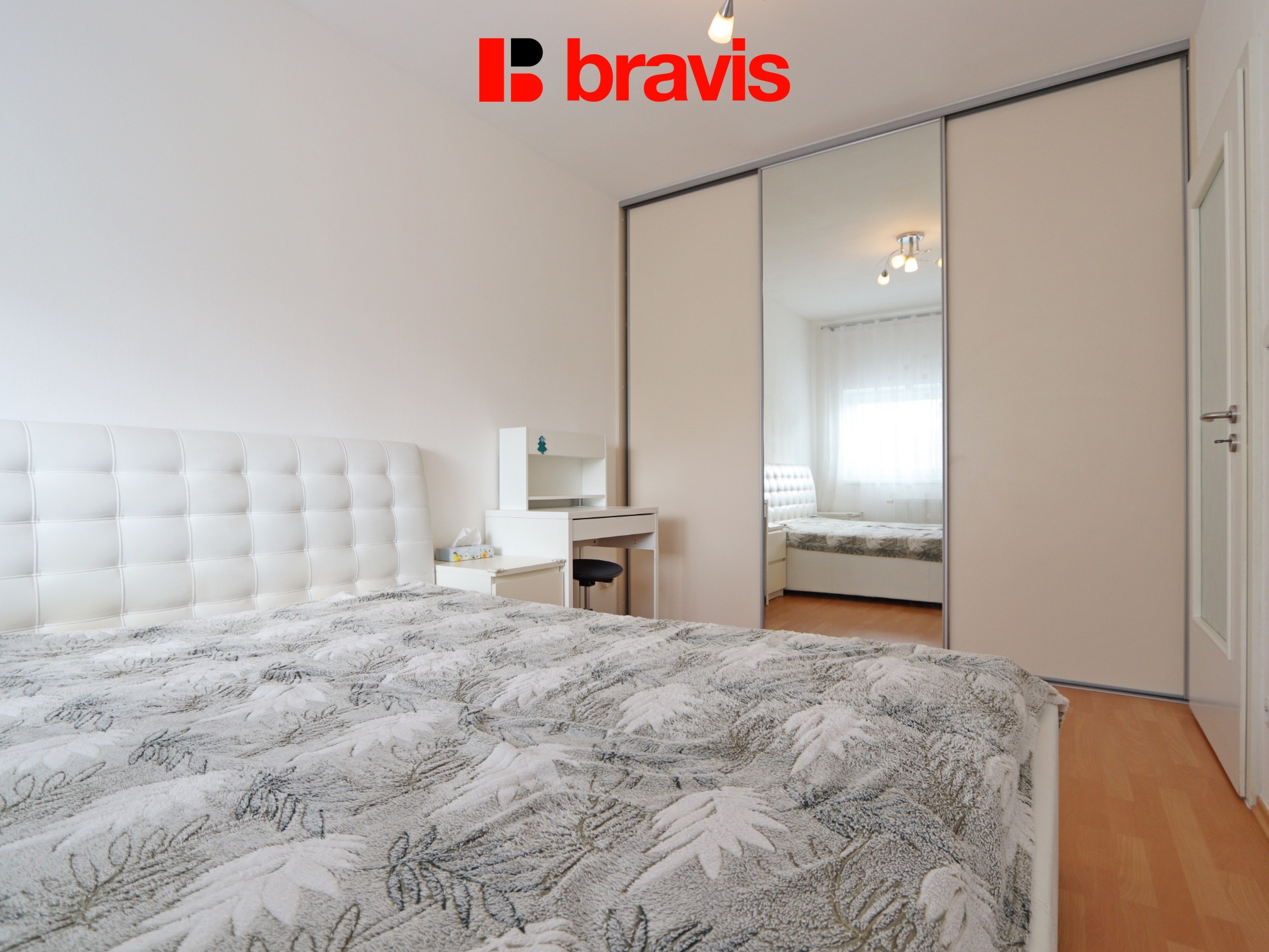 Ložnice nabízí manželskou postel, noční stolky a zrcadlovou skříň.