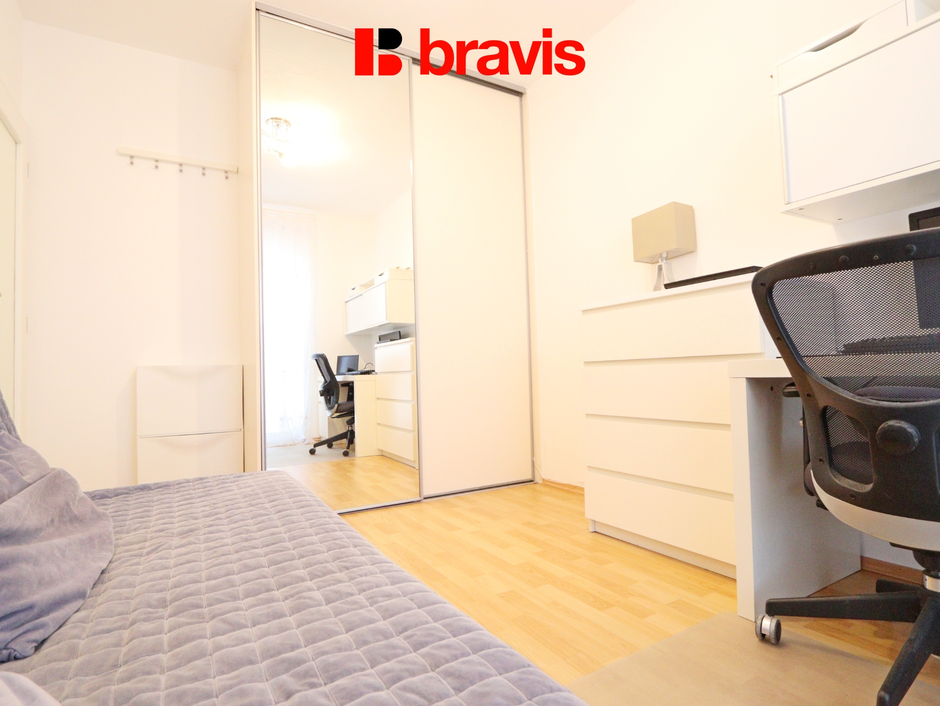 Menší pokoj je zařízen jednolůžkem, psacím stolem a úložnými prostory.