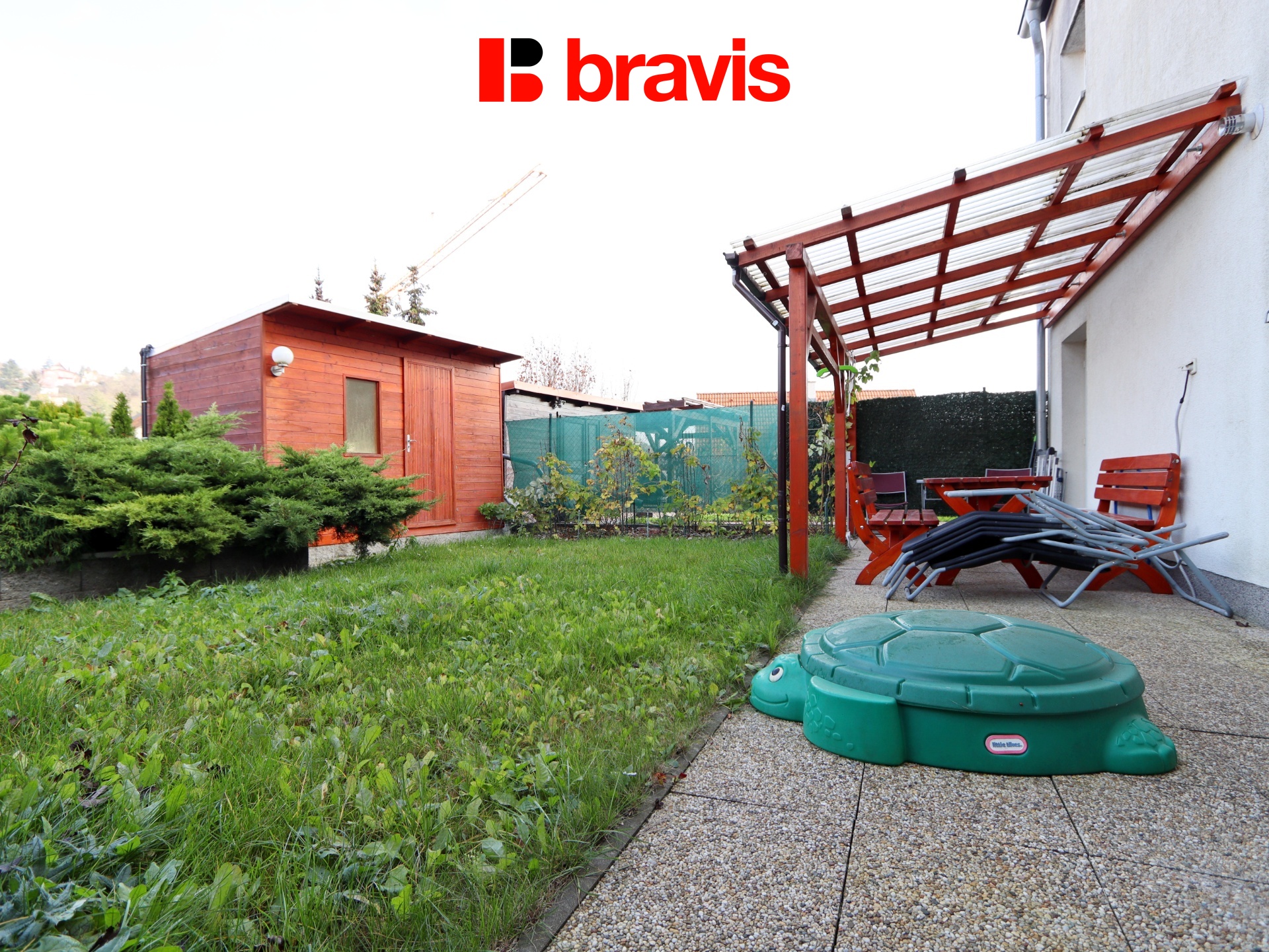 Velkou výhodou je zahrádka za domem, kde se nachází venkovní posezení pod pergolou, zahradní domek a menší bazén.