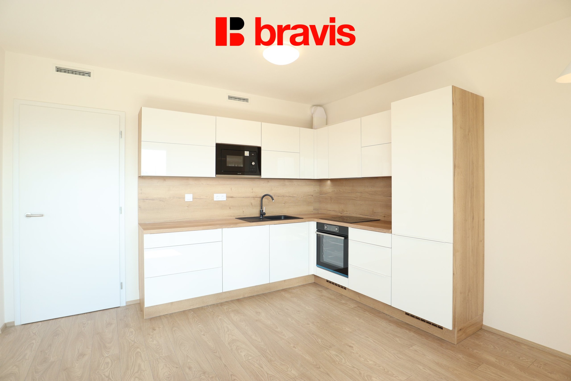 Kuchyňský kout je vybaven linkou na míru včetně všech spotřebičů - trouba, indukční varná deska, lednice s mrazákem, vestavná mikrovlnná trouba, myčka.