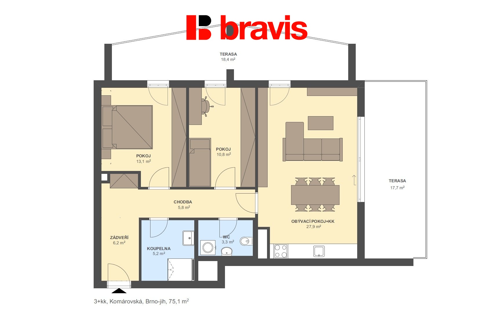 Z obývacího pokoje je vstup na dvě terasy, z nichž jedna je přístupná ze všech tří pokojů. Terasy poskytují dostatek prostoru pro posezení a příjemný odpočinek.