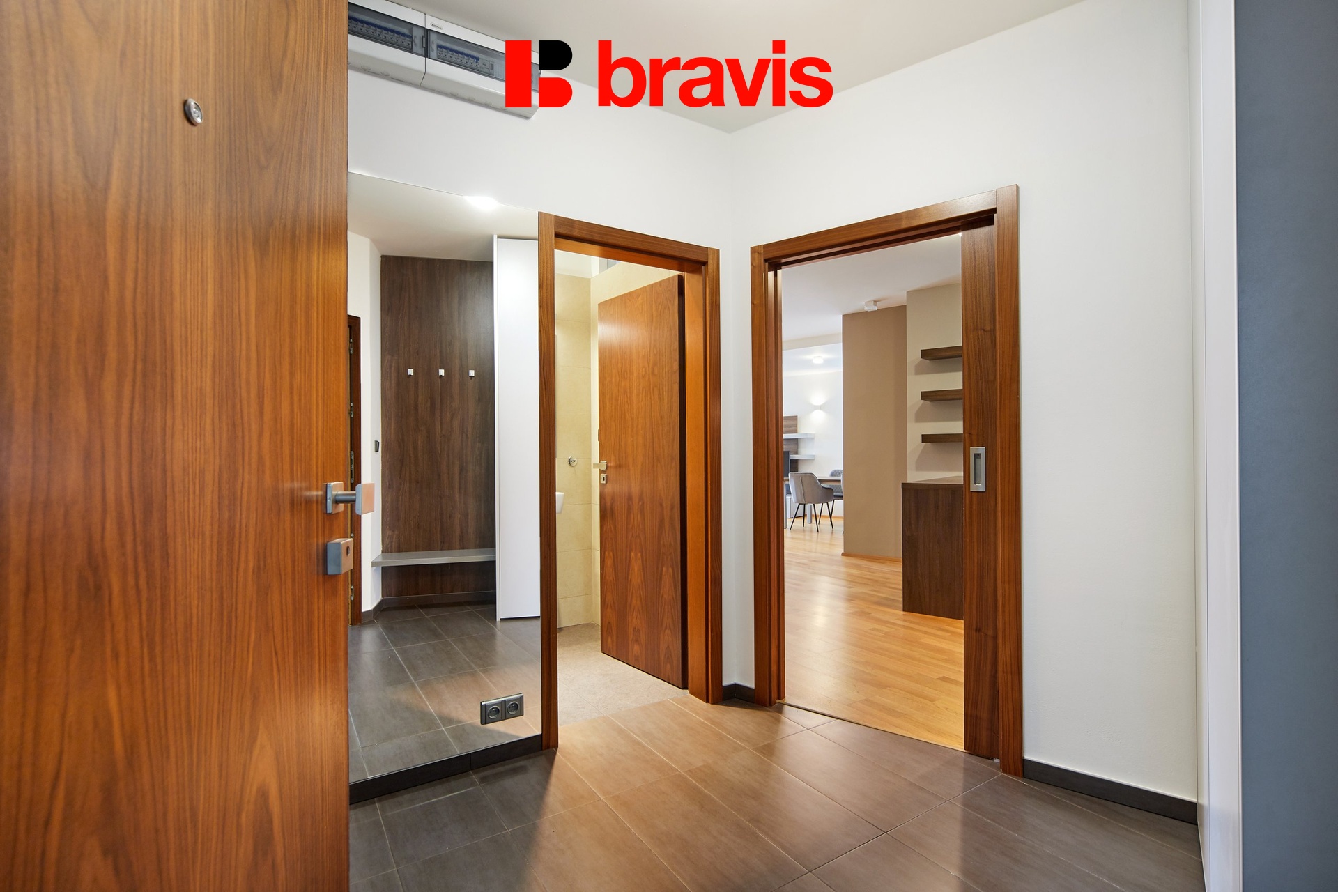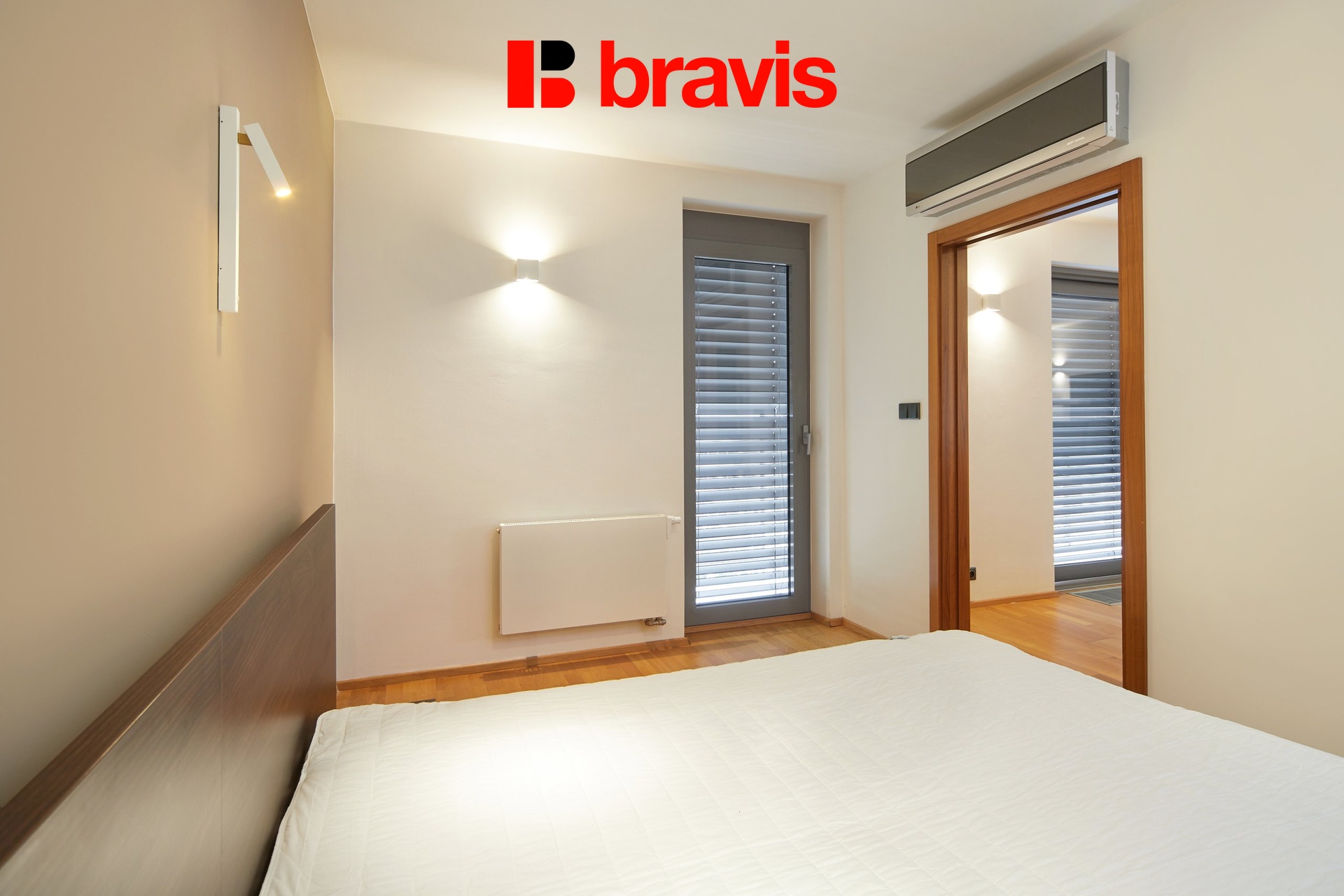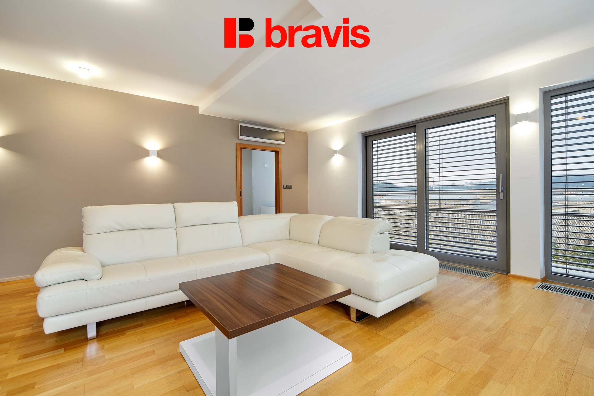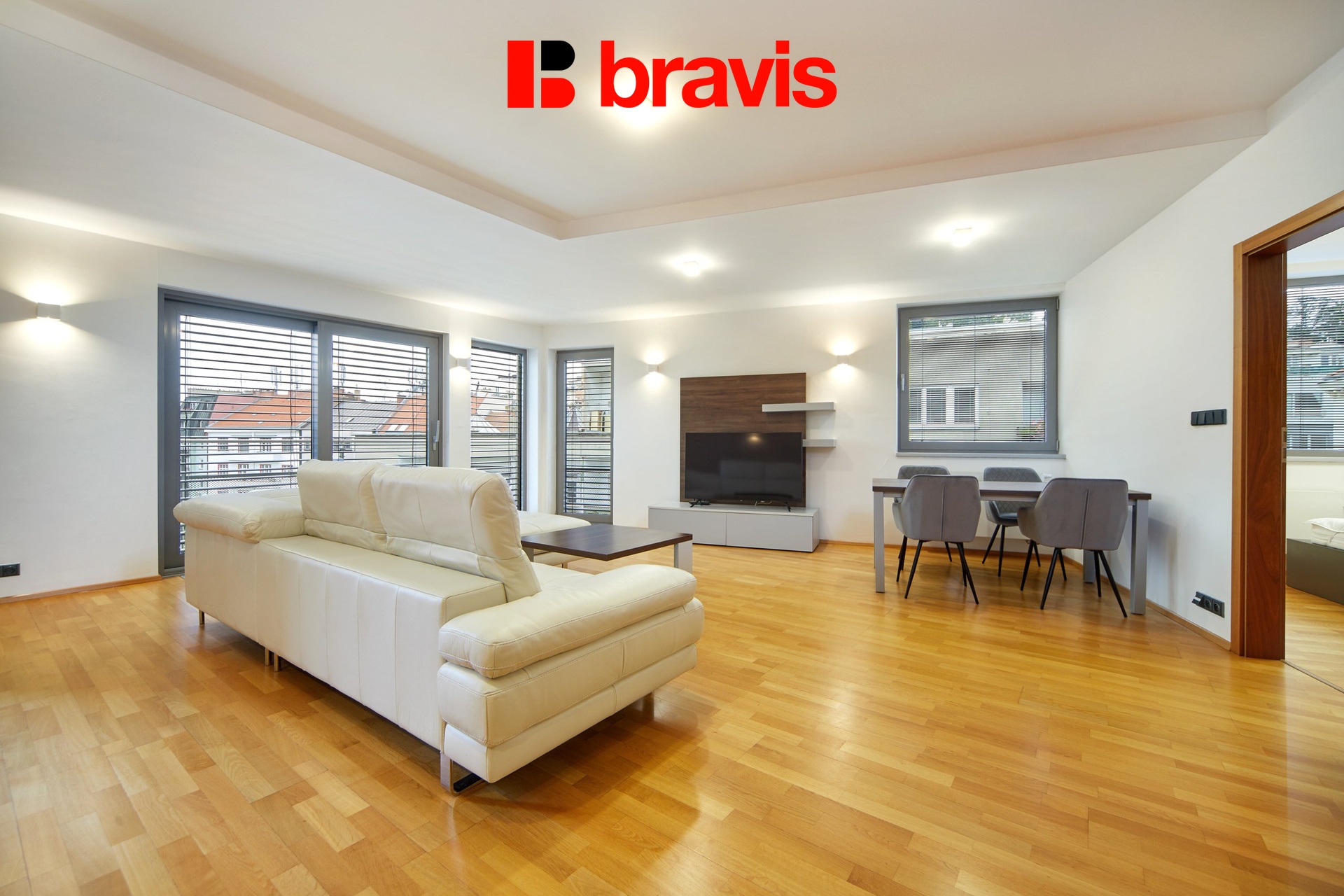Všechny detaily, jako jsou dřevěné podlahy, interiérové dveře a venkovní žaluzie, zvýrazňují kvalitu a luxus tohoto bytu.