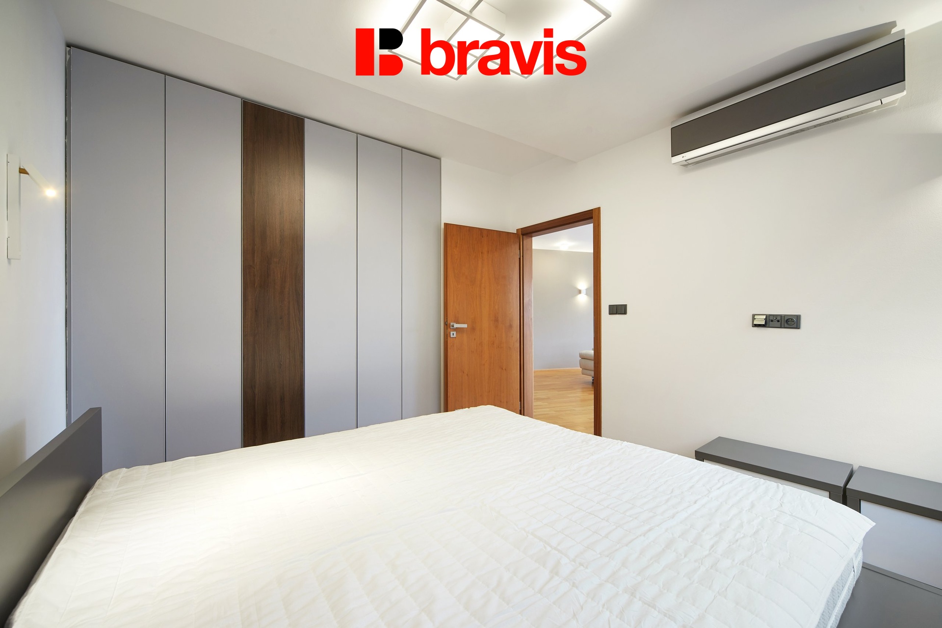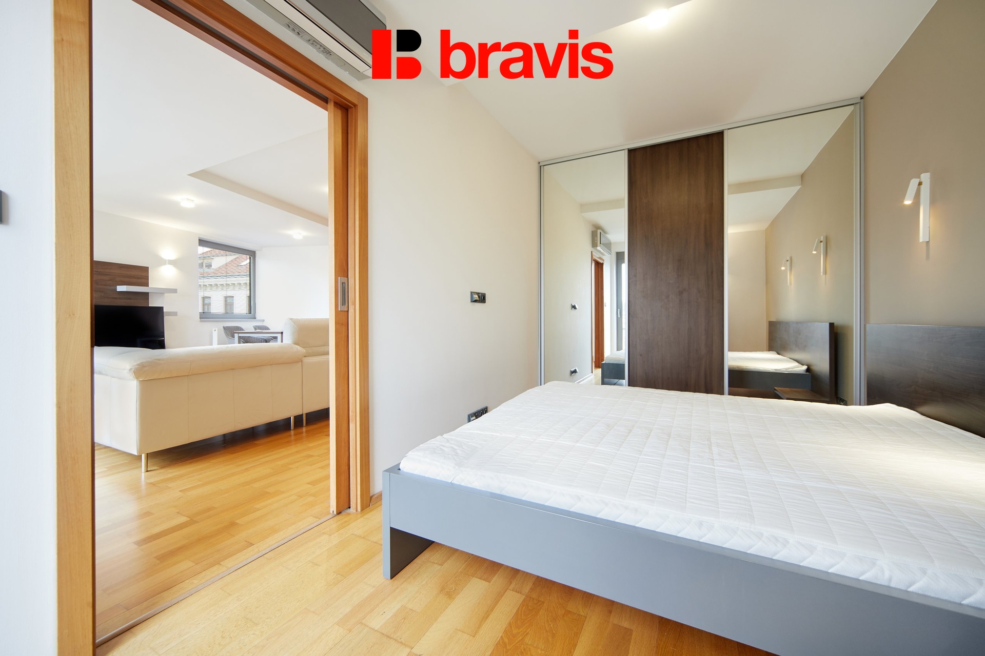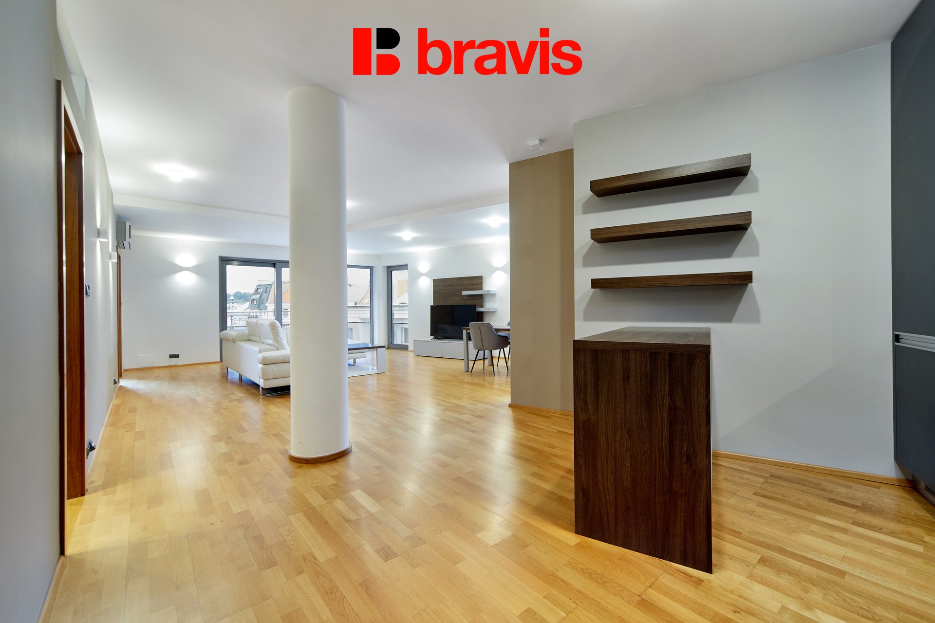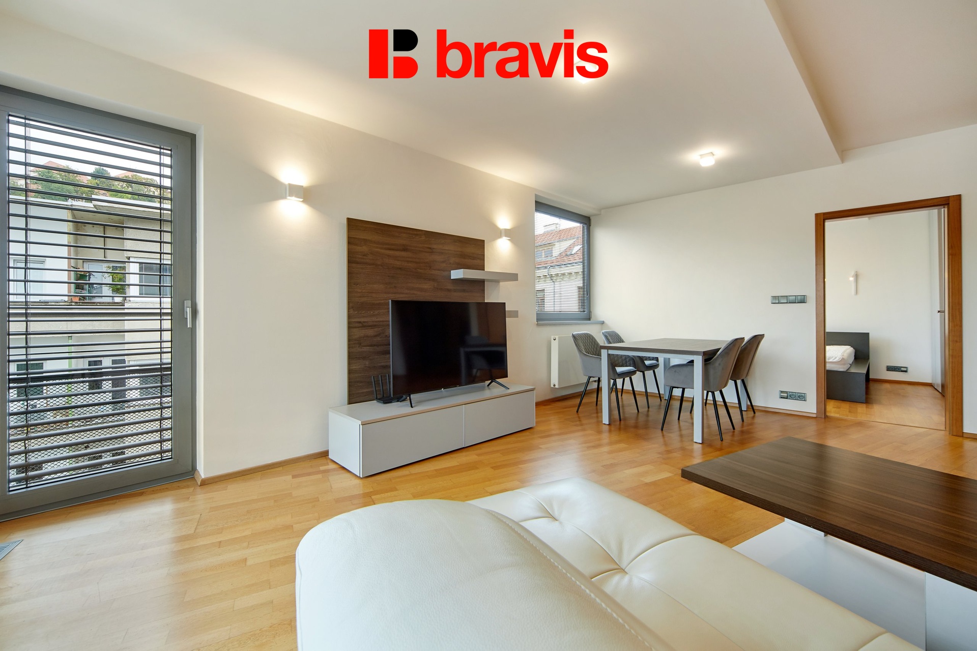 Všechny detaily, jako jsou dřevěné podlahy, interiérové dveře a venkovní žaluzie, zvýrazňují kvalitu a luxus tohoto bytu.