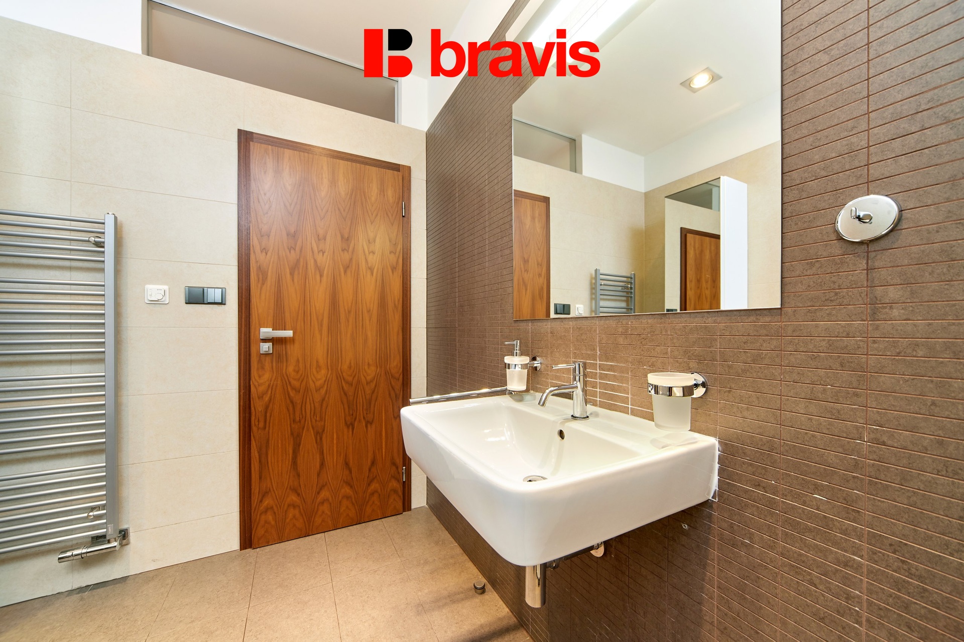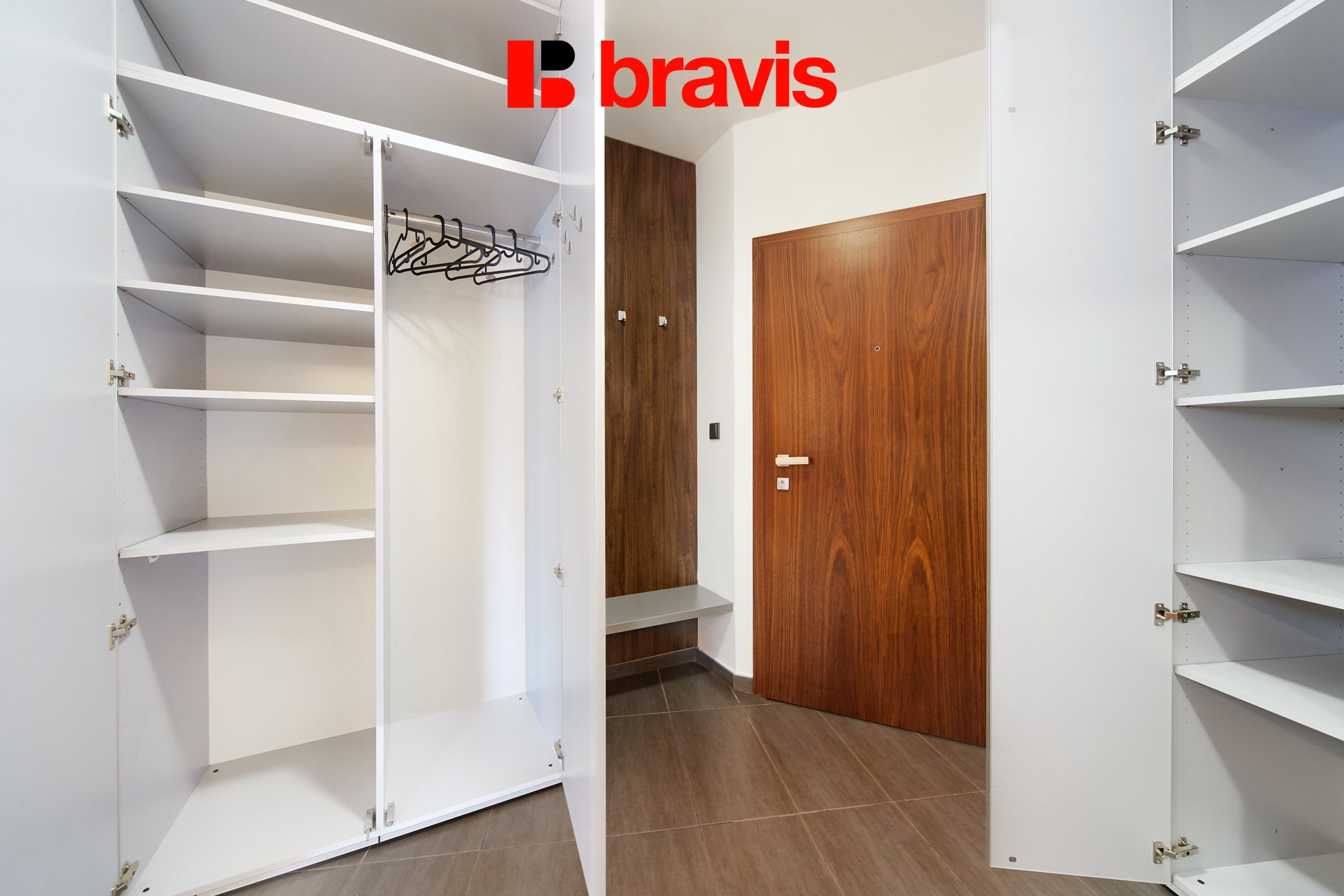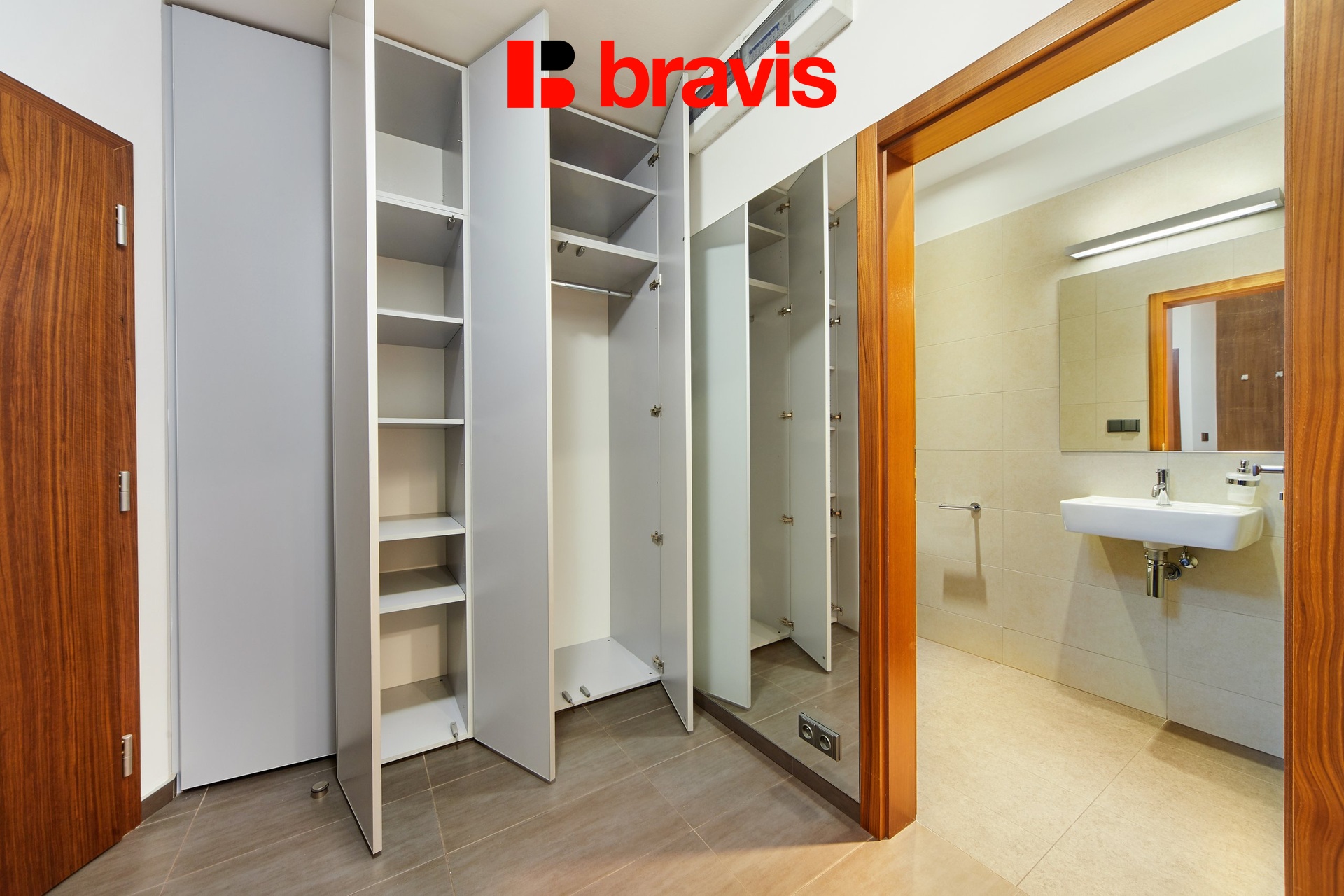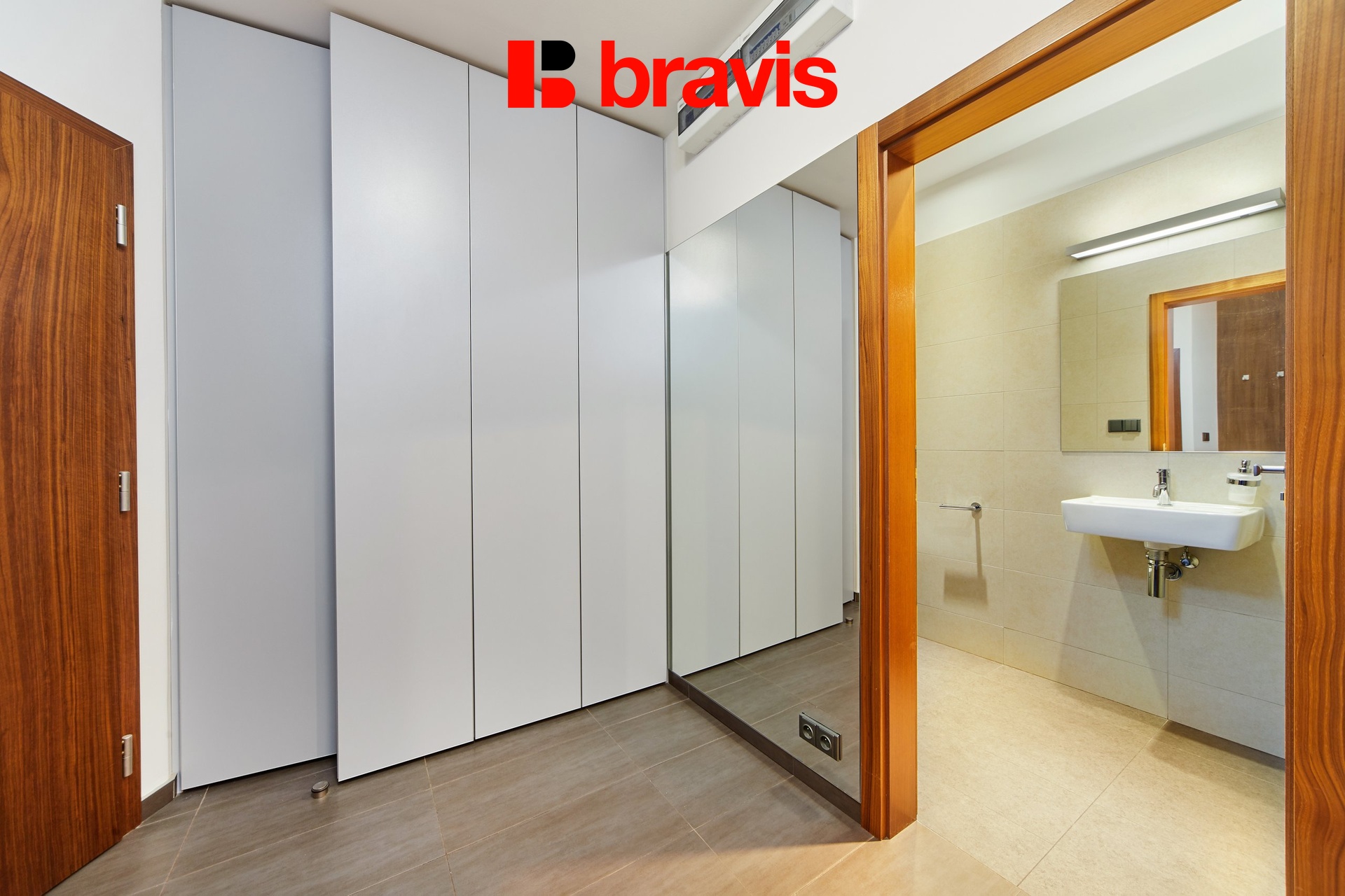 Všechny detaily, jako jsou dřevěné podlahy, interiérové dveře a venkovní žaluzie, zvýrazňují kvalitu a luxus tohoto bytu.