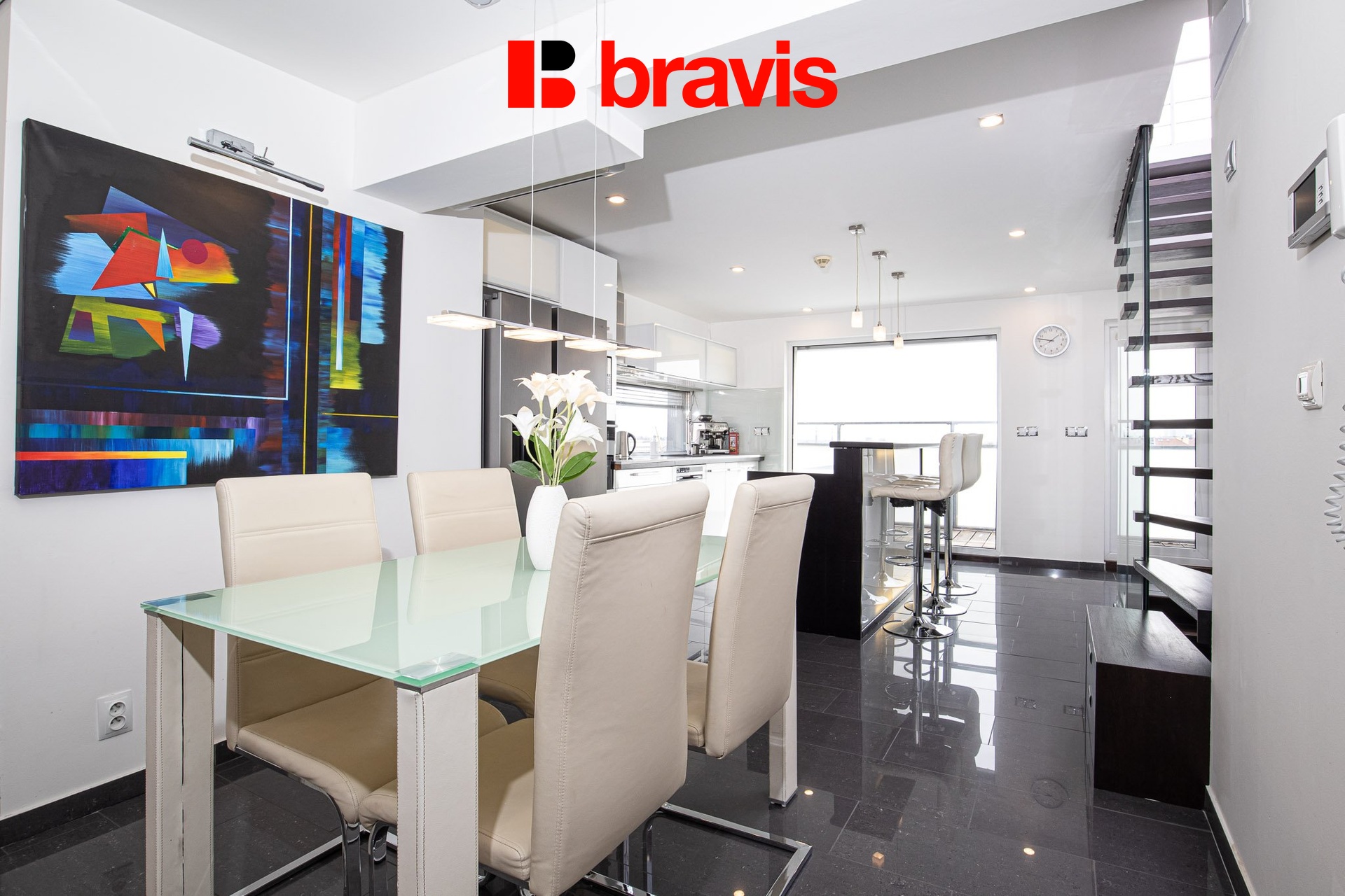 Srdcem bytu je otevřená kuchyně s obývací částí v prvním patře – vybavena kuchyňskou linkou na míru se spotřebiči (americká lednice se zásobníkem ledu, mikrovlnka, rychlovarná konvice, myčka, varná deska, el. trouba) a barovým pultem s židlemi.