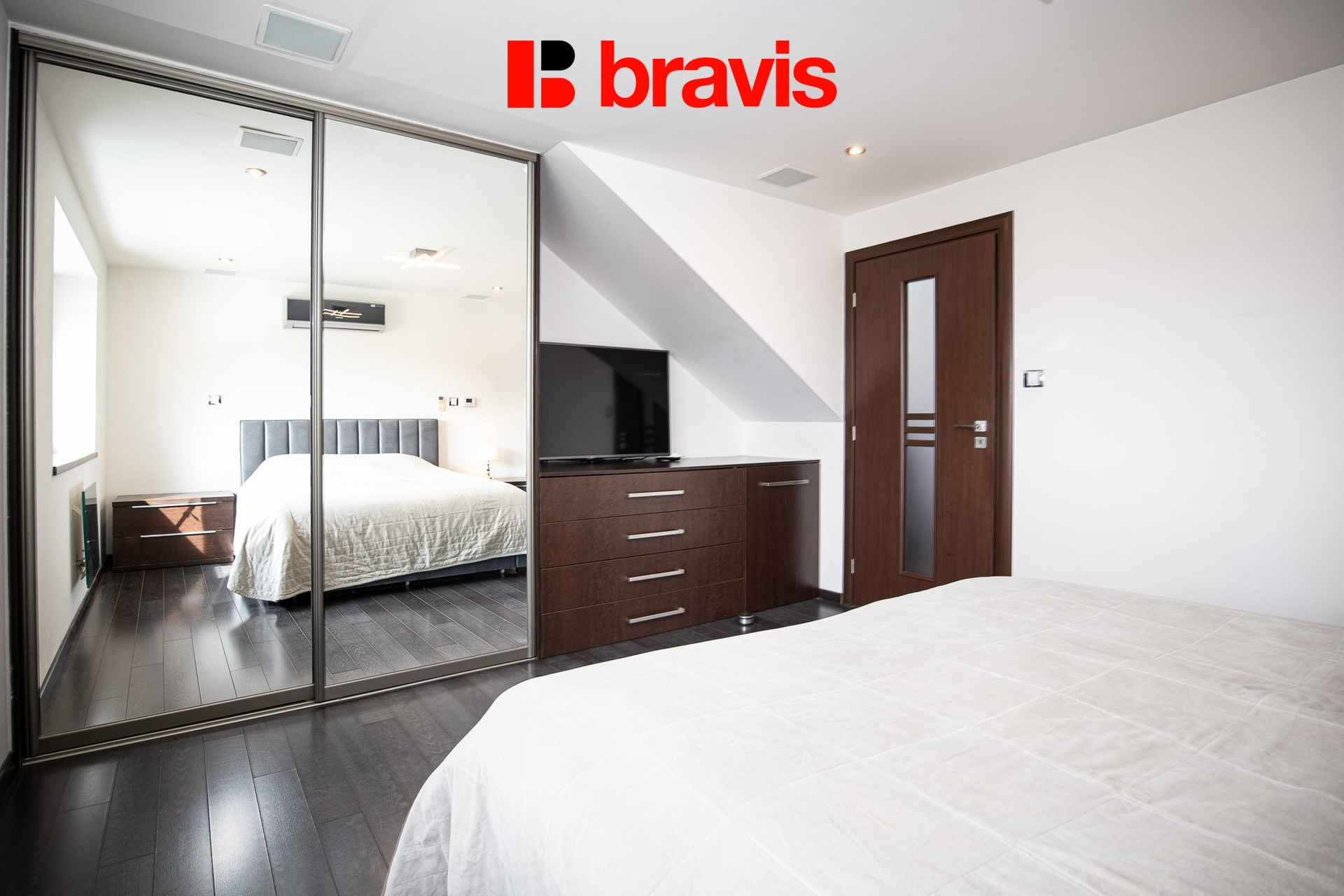 Byt je rozložen přes dvě podlaží s přístupem na střešní terasu a nabízí pocit soukromého bydlení uprostřed centra města. Vstupní dveře jsou bezpečnostní se zvonkem s kamerovým systémem. V přízemí bytu jsou dvě ložnice, koupelna a úklidová místnost. První ložnice je vybavena dvoulůžkem, matracemi, úložnými skříněmi a televizí. Druhá ložnice je v současnosti využívána jako domácí kancelář s rozkládací pohovkou a šatnou - ideální jako pokoj pro hosty nebo pracovna. V koupelně je umyvadlo, toaleta, vana i sprchový kout. Úklidová místnost nabízí spoustu úložného prostoru včetně pračky, sušičky a vlastního elektrického boileru.