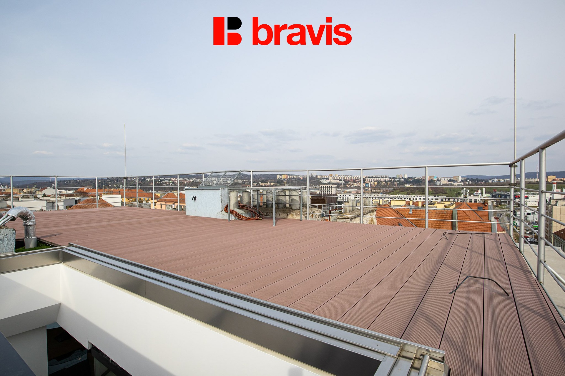Z kuchyně je přístup na prostornou střešní terasu 39 m2 s možností posezení a výhledem na panorama Brna – skutečná rarita v centru města.