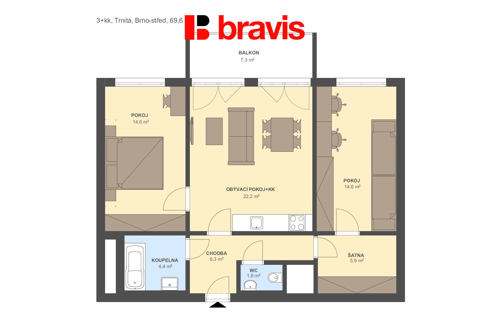 Dominantou bytu je prostorný obývací pokoj s kuchyňským koutem a vstupem na balkon o velikosti 7 m².