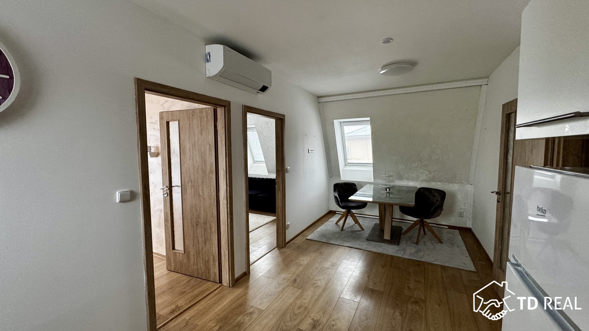 Dispozice bytu je praktická a nabízí komfortní bydlení pro jednotlivce či pár.