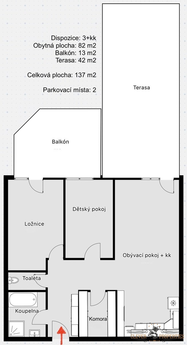 Součástí bytu je balkón o velikosti 14 m² a prostorná terasa o rozloze 42 m². Parkování je zajištěno pro dva automobily přímo u domu.