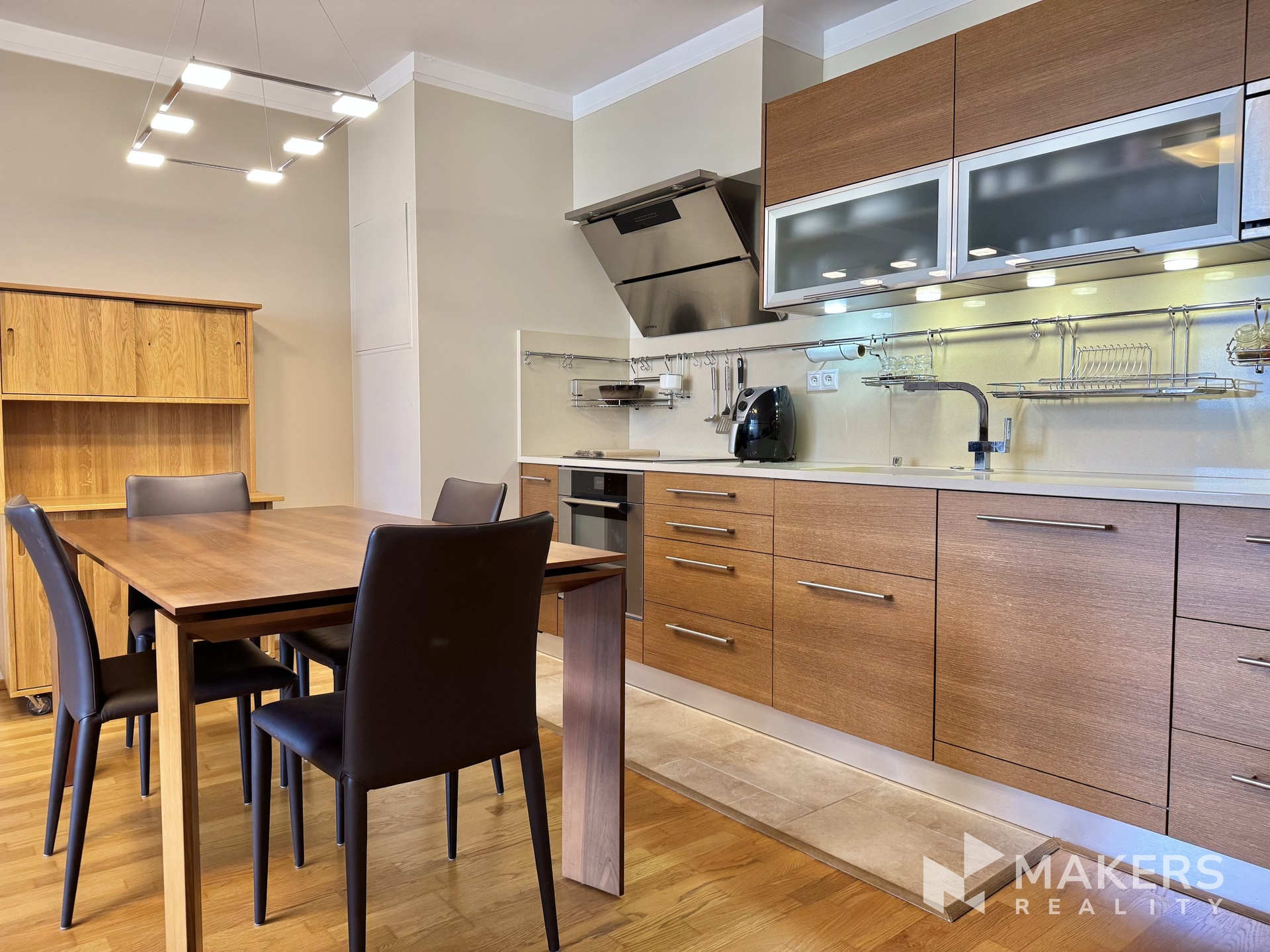 • Plně vybavená kuchyňská linka: indukční deska, trouba, mikrovlnná trouba, myčka, digestoř, horkovzdušná fritéza