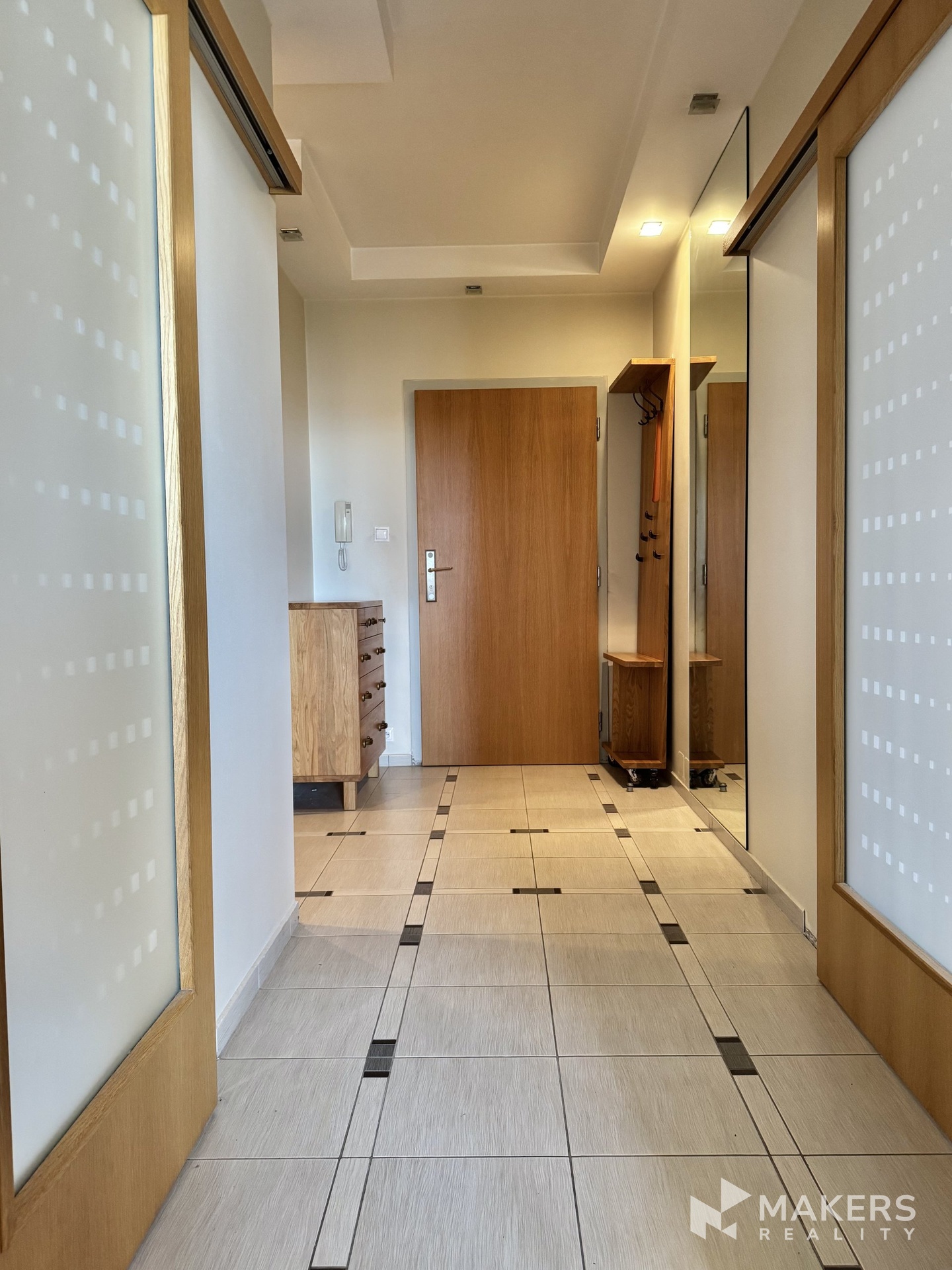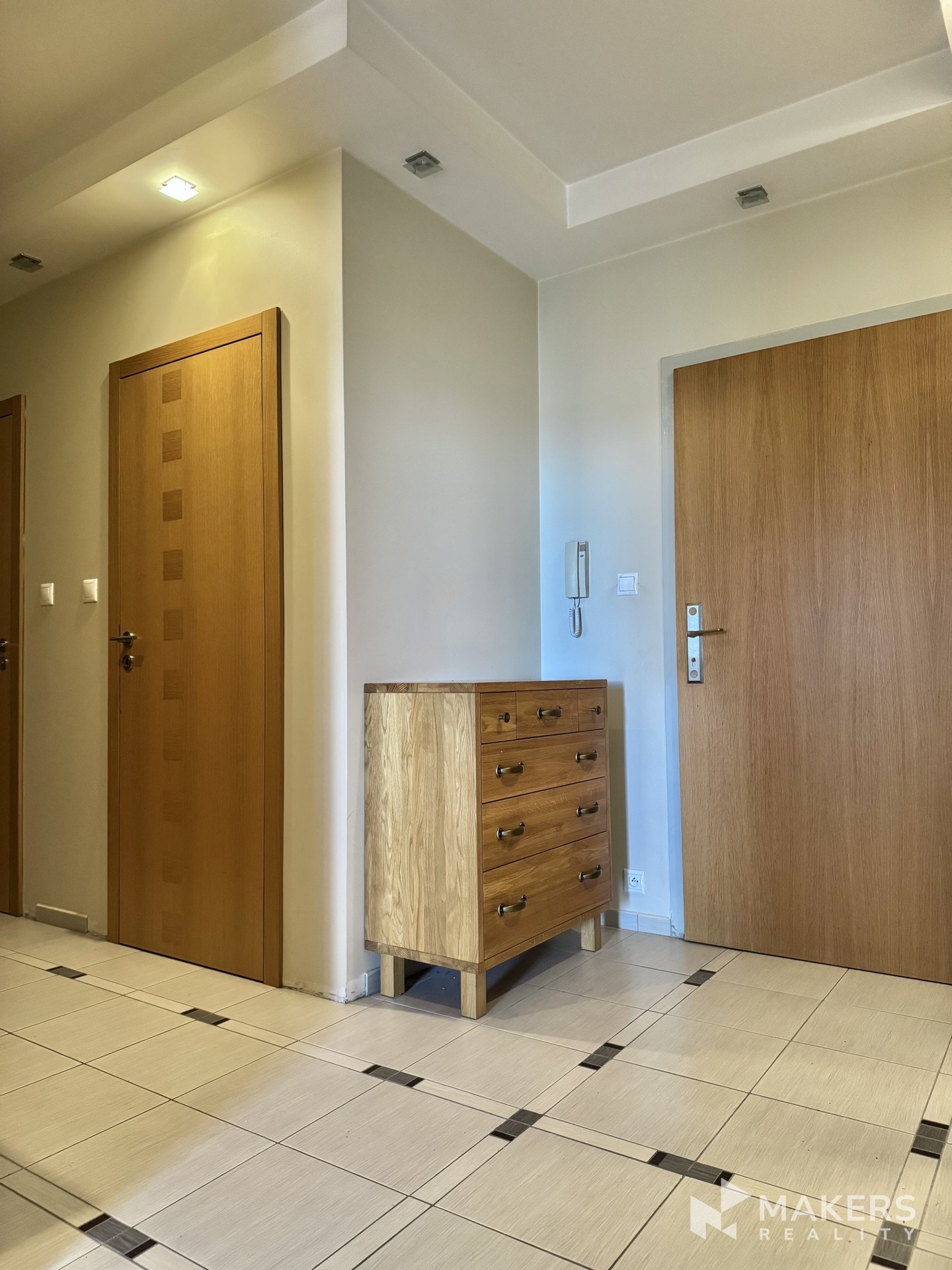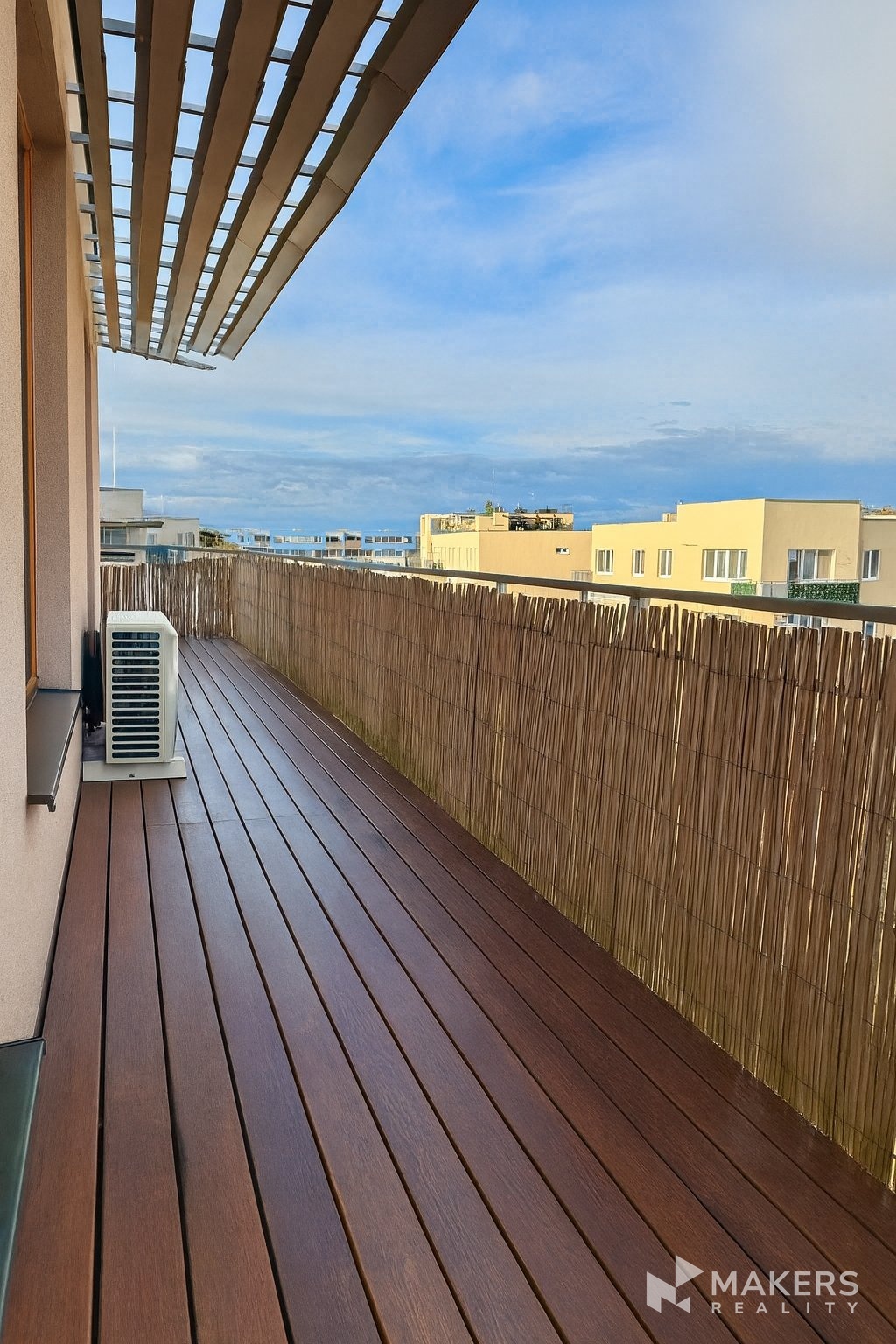 Dispozice nabízí prostorný obývací pokoj s kuchyňským koutem, dále dva neprůchozí pokoje, koupelnu s vanou, samostatnou toaletu, komoru a velkorysou terasu, která obchází celý byt.