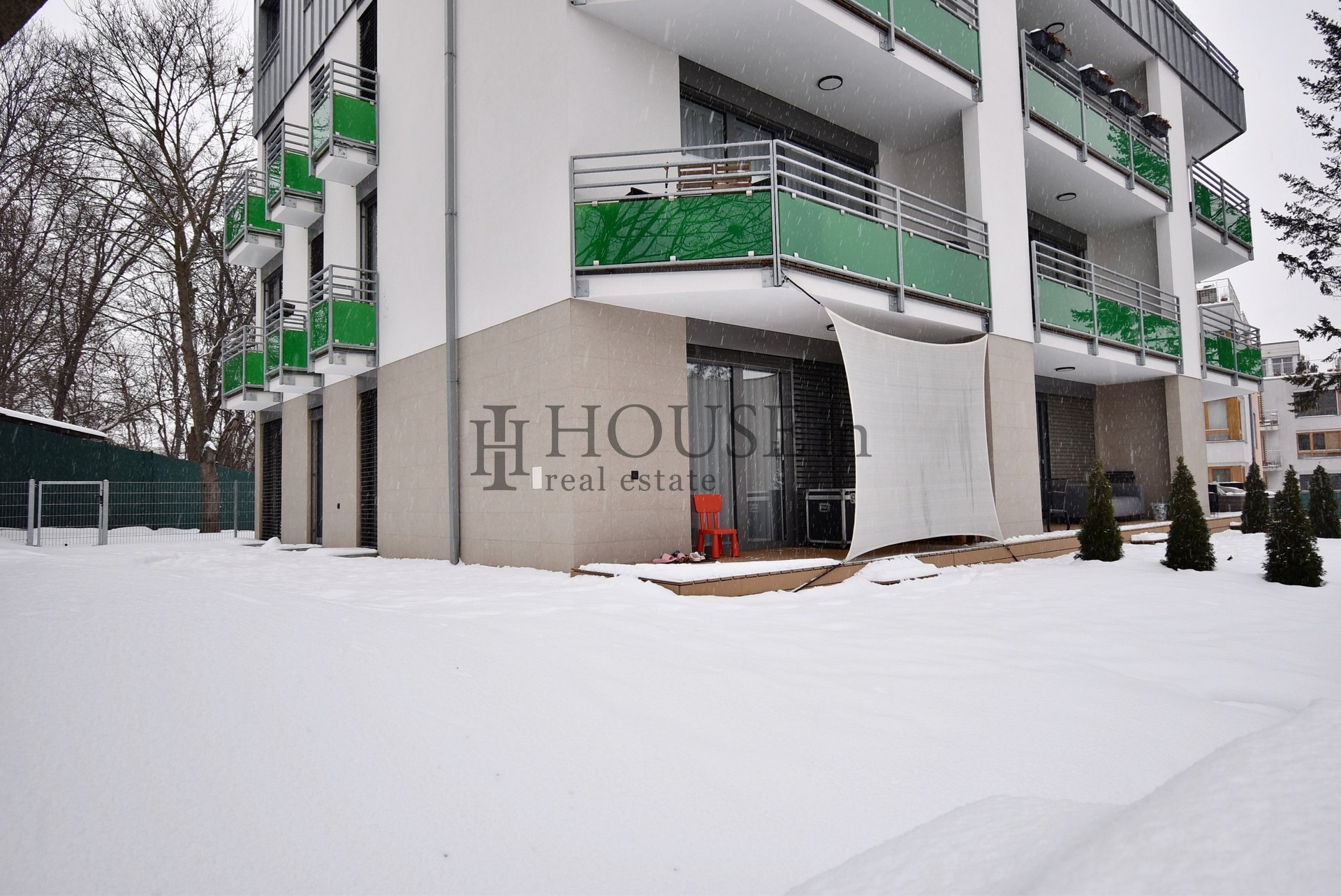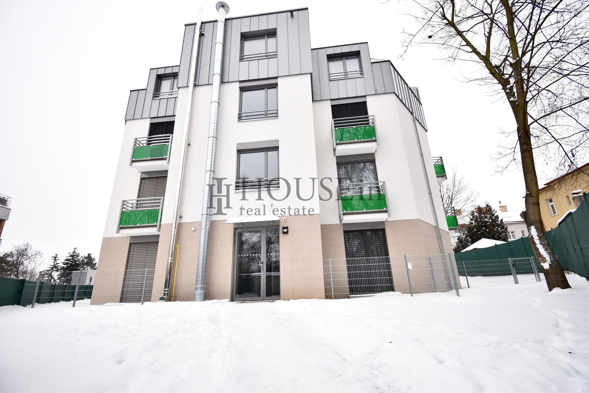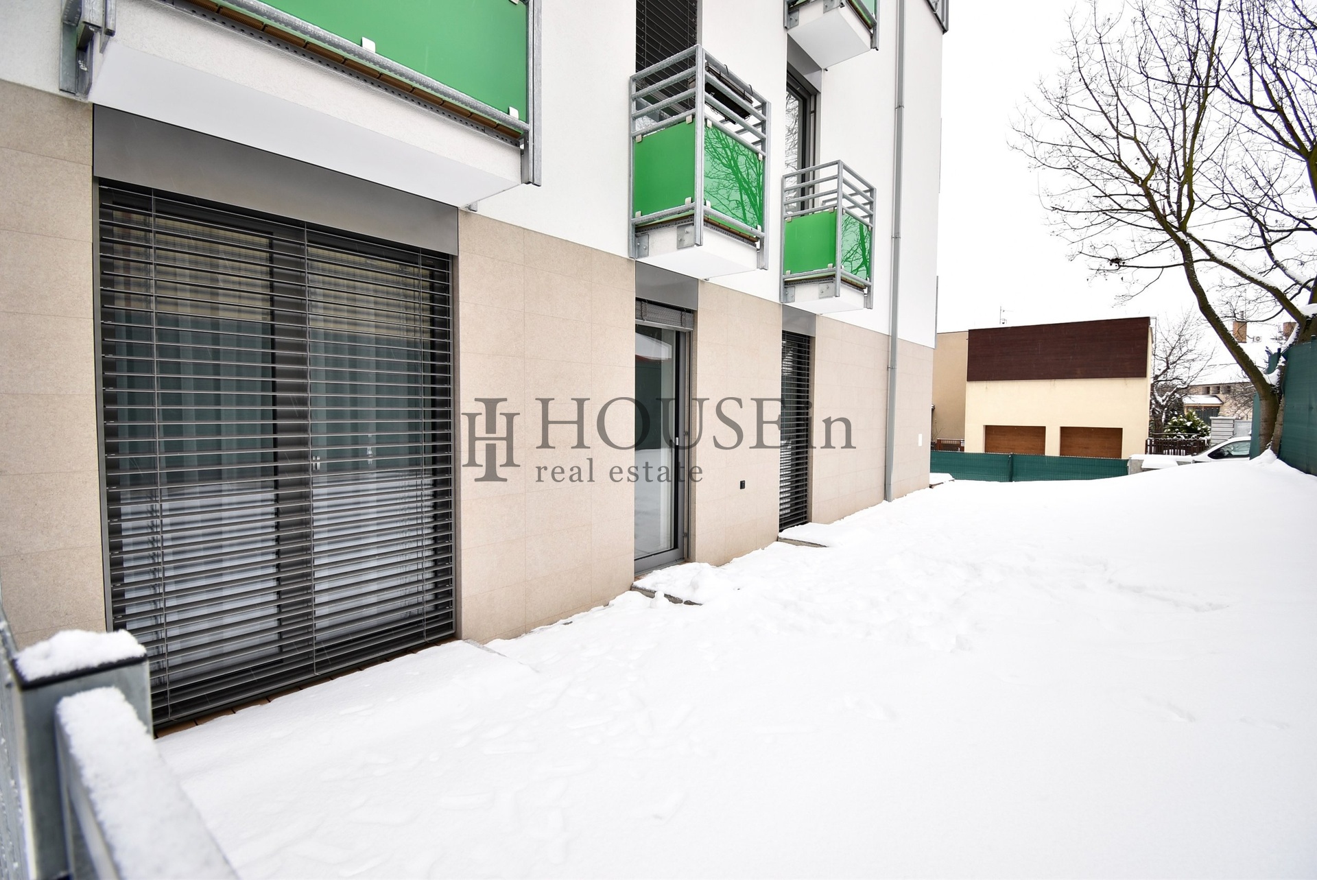 Některé použité fotografie pocházejí z totožného bytu se stejnou dispozicí o patro výše, který má místo teras a vstupů na předzahrádku balkóny.