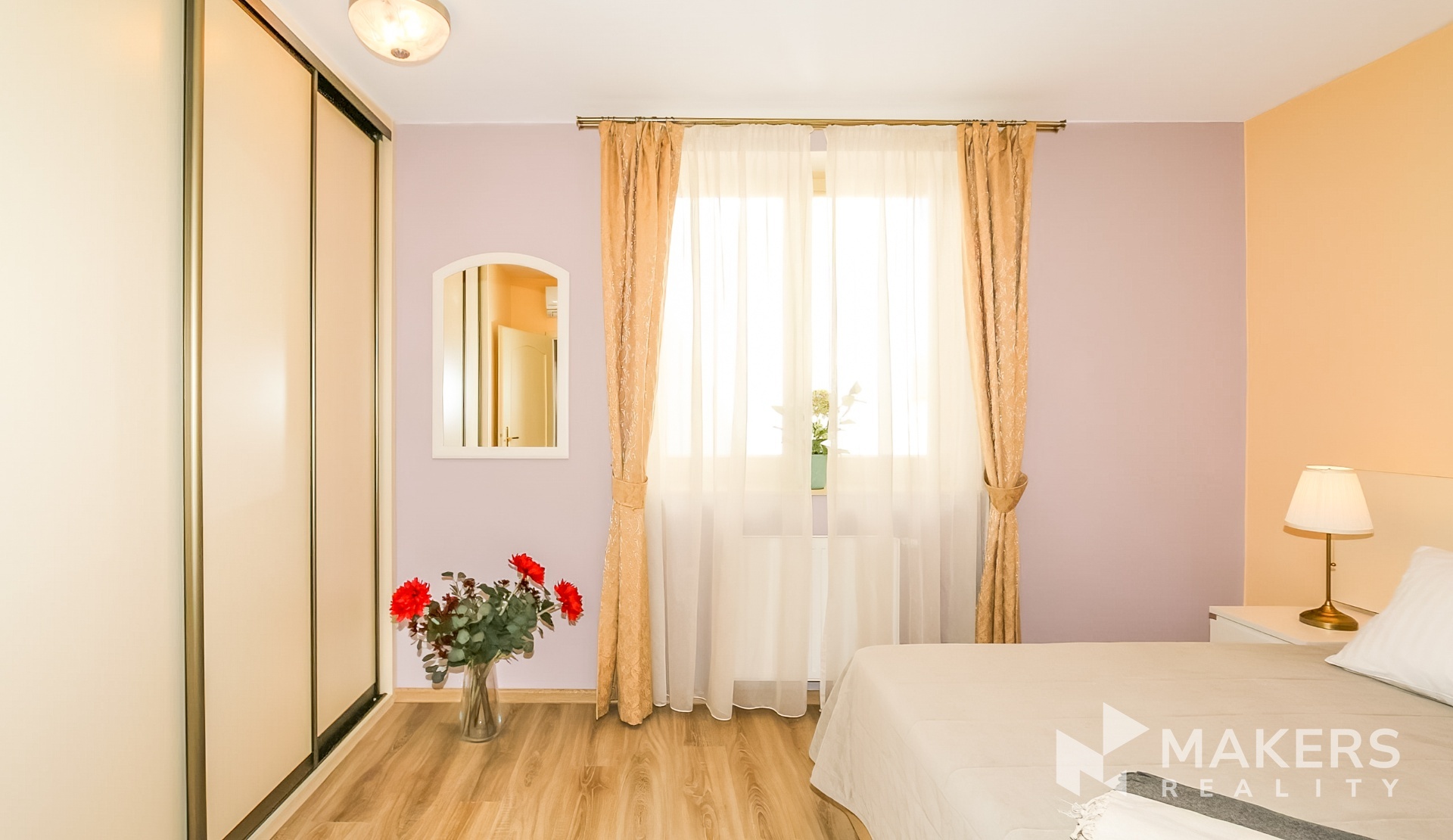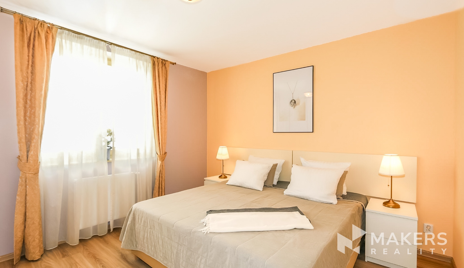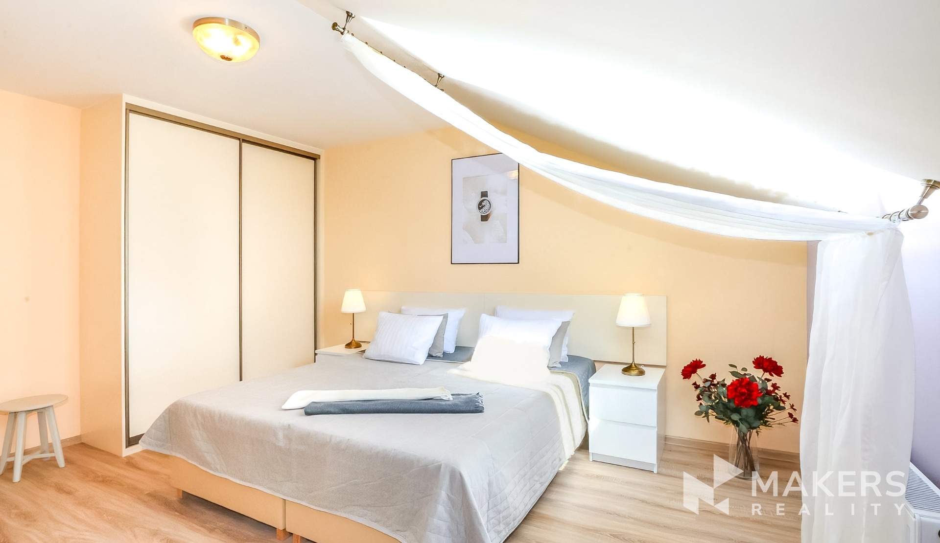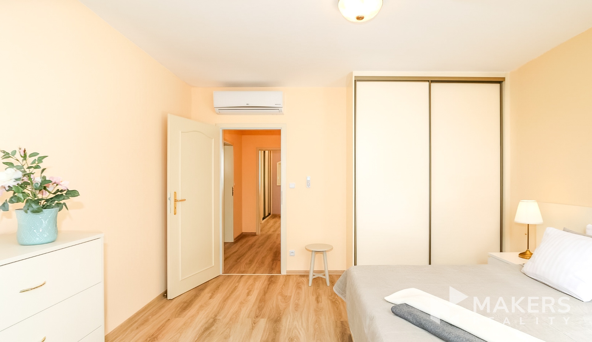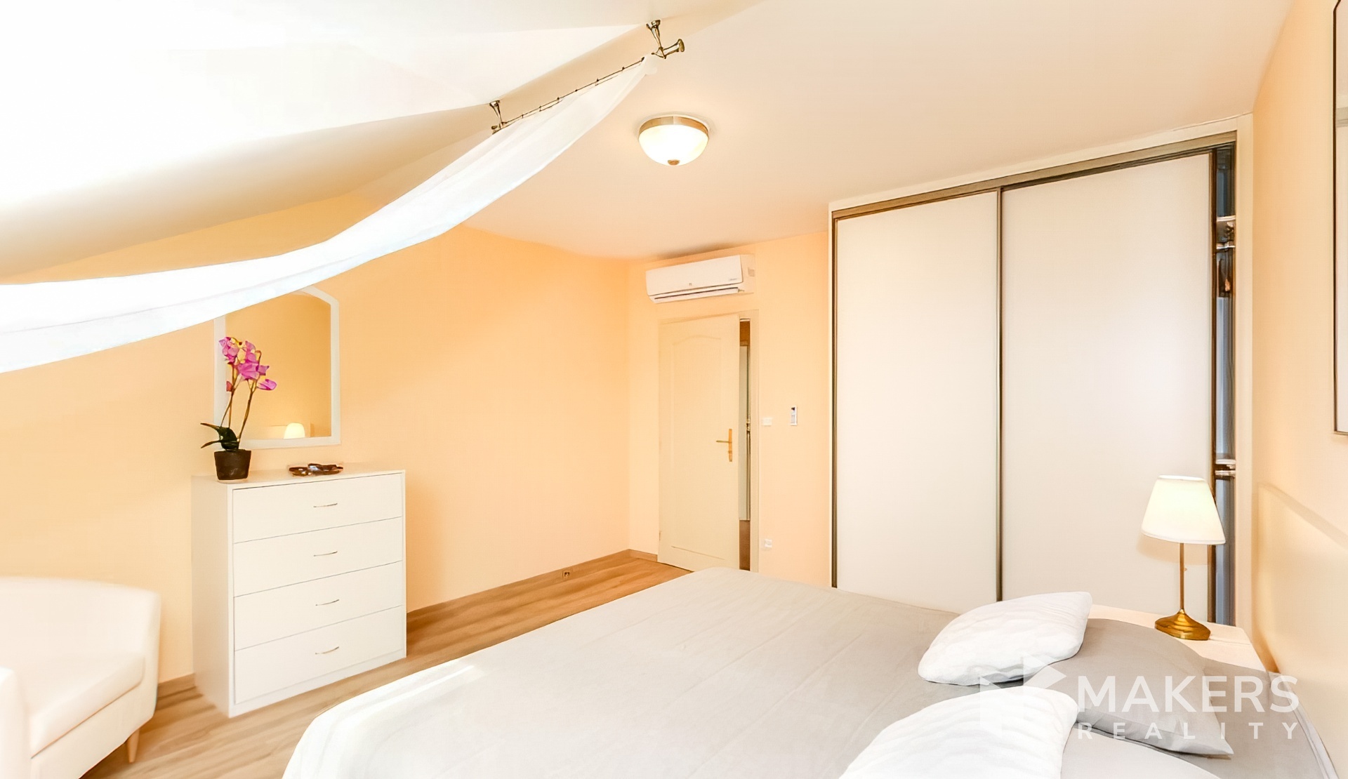 Interiér je tvořen prostorným obývacím pokojem s vybavenou kuchyní, kuchyňským stolem a židlemi, sedací soupravou s TV, konferenčním stolkem a počítačovým stolem. Dále jsou 2 útulné ložnice s manželskými postelemi a šatními skříněmi. Koupelná se sprchou. Na podlahách jsou dřevěné plovoucí podlahy a dlažba.