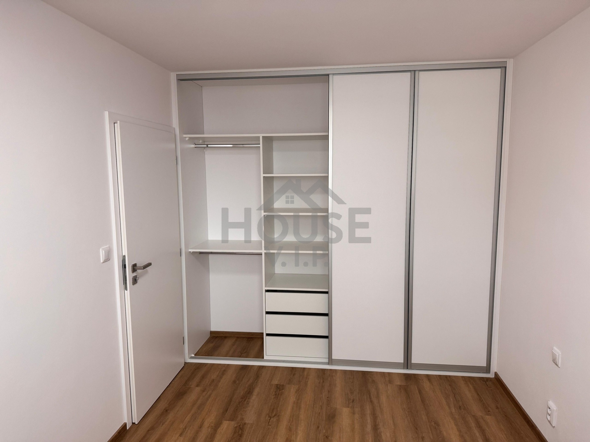 Byt je vybaven vestavěnými skříněmi a moderní kuchyňskou linkou, která zahrnuje indukční varnou desku, horkovzdušnou troubu, digestoř, myčku, chladničku a pračku, což zajišťuje plný komfort každodenního života bez nutnosti dalších investic.