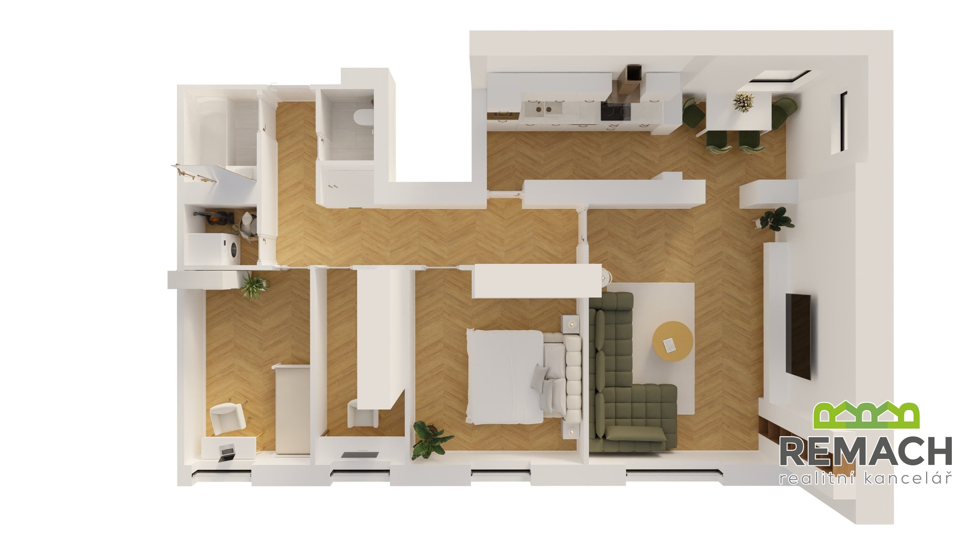 Díky neprůchozím pokojům je byt ideální jak pro rodinné bydlení, tak i pro sdílené či firemní bydlení.