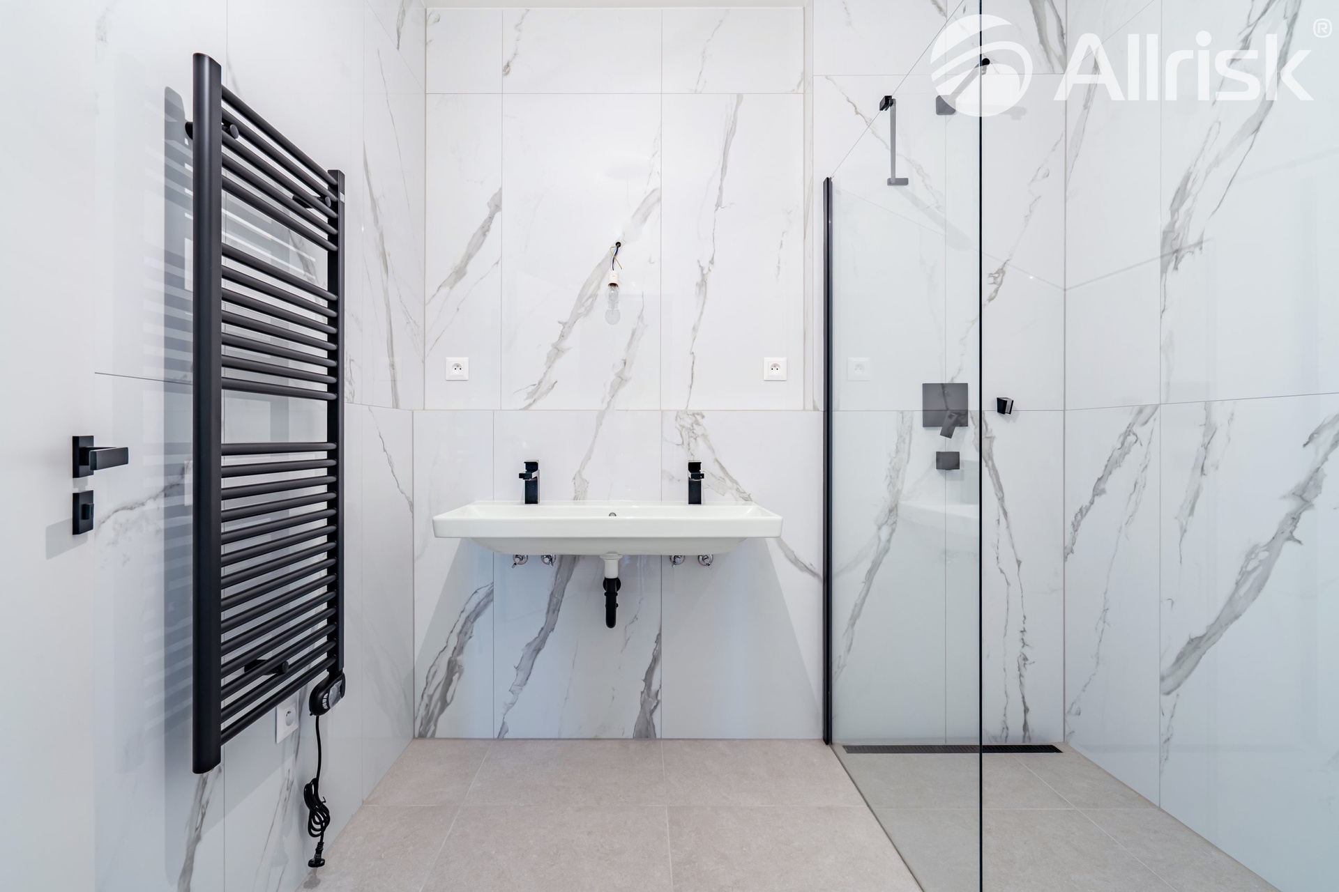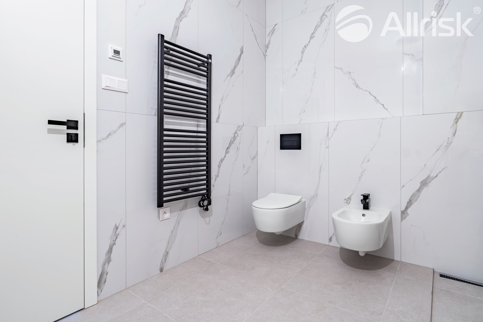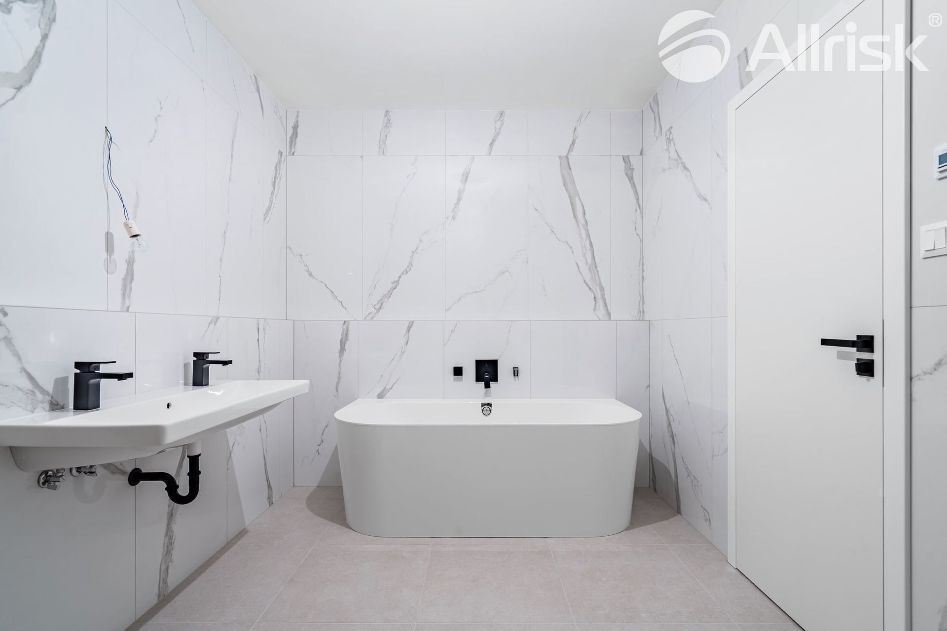 - hlavní ložnice s vlastní šatnou a koupelnou – vybavenou velkoformátovými obklady, vanou, sprchovým koutem, toaletou a designovým zařizovacím vybavením. Použity byly kvalitní materiály a prvky prémiových značek, jako je Villeroy & Boch a Hansgrohe.