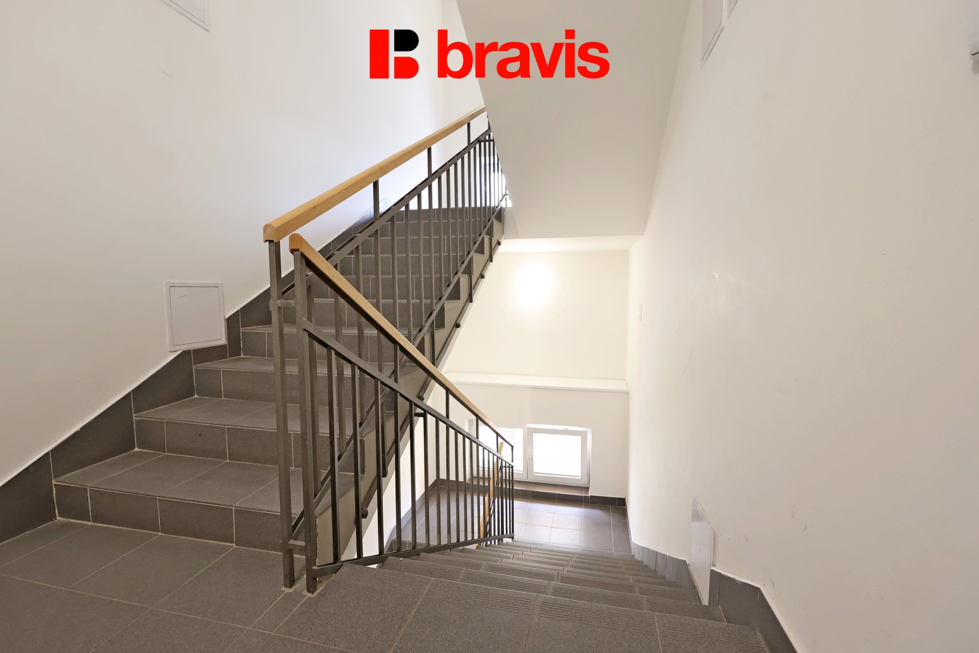 Byt o celkové ploše 100 m² se nachází ve 3. patře zrekonstruovaného cihlového domu bez výtahu.