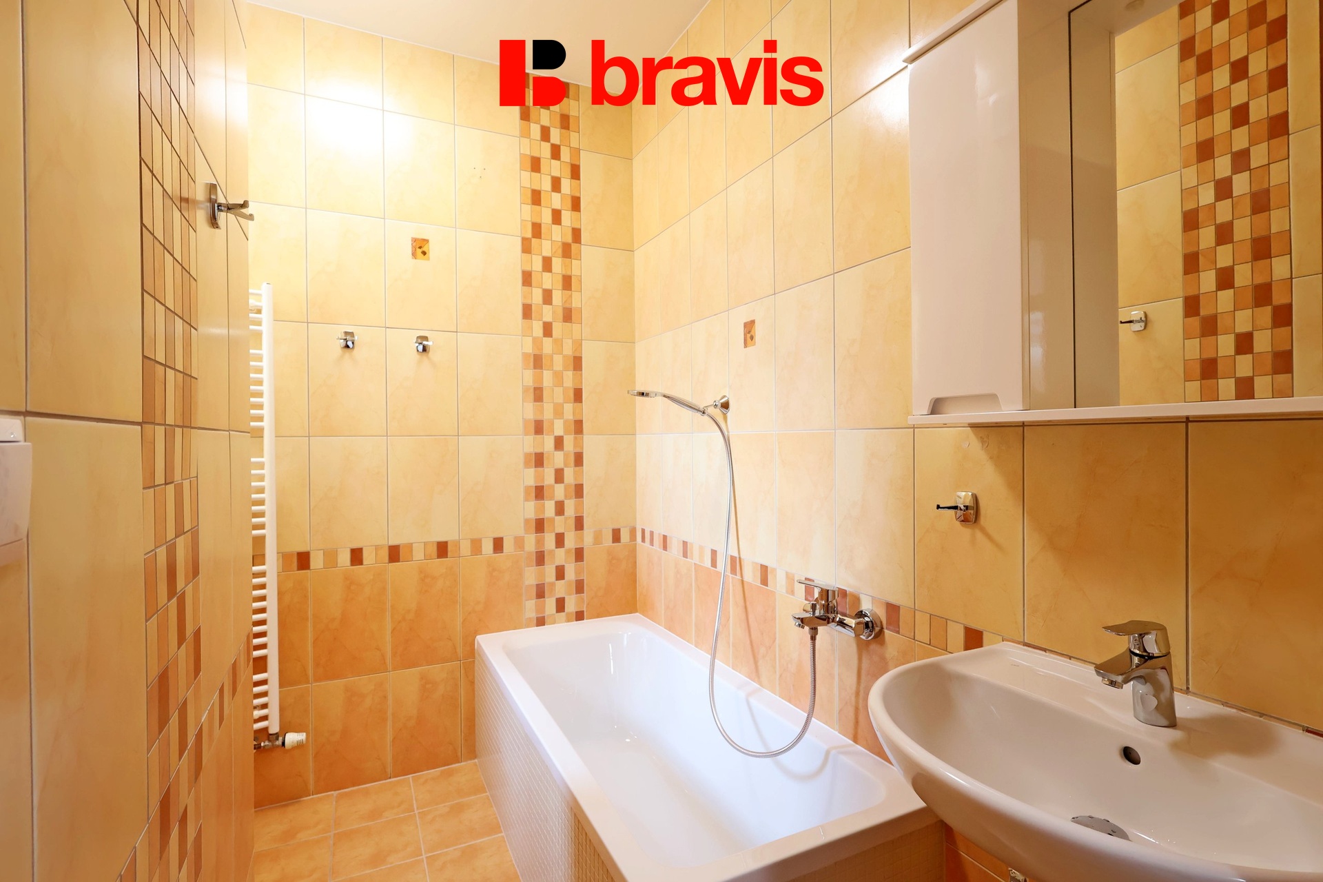Koupelna je zařízena sprchovým koutem, umyvadlem se zrcadlovou skříňkou, záchodem a otopným žebříkem.