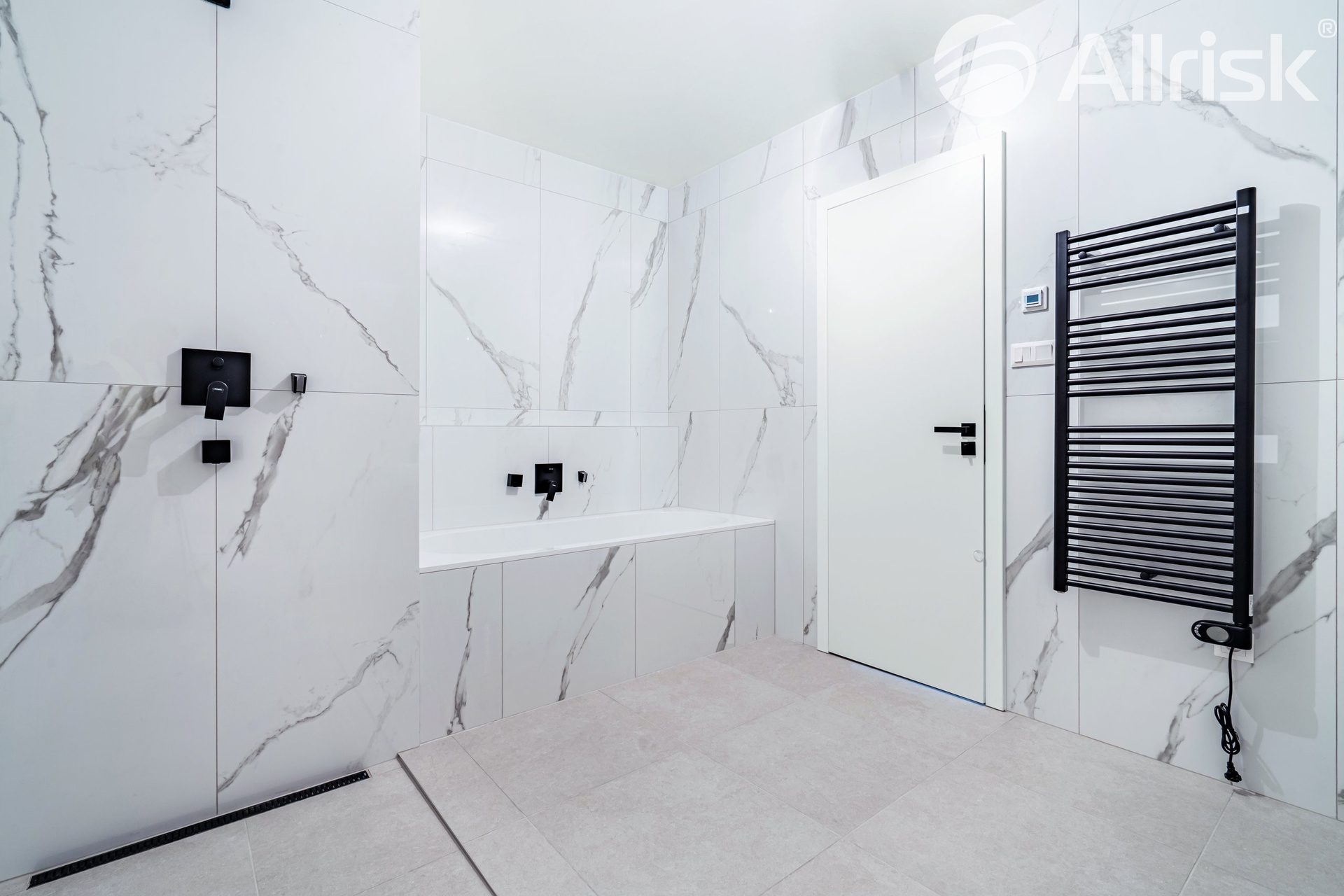 hlavní ložnice s vlastní šatnou a koupelnou vybavenou velkoformátovými obklady, vanou, sprchovým koutem a toaletou; použity byly kvalitní materiály a prvky prémiových značek Villeroy & Boch a Hansgrohe