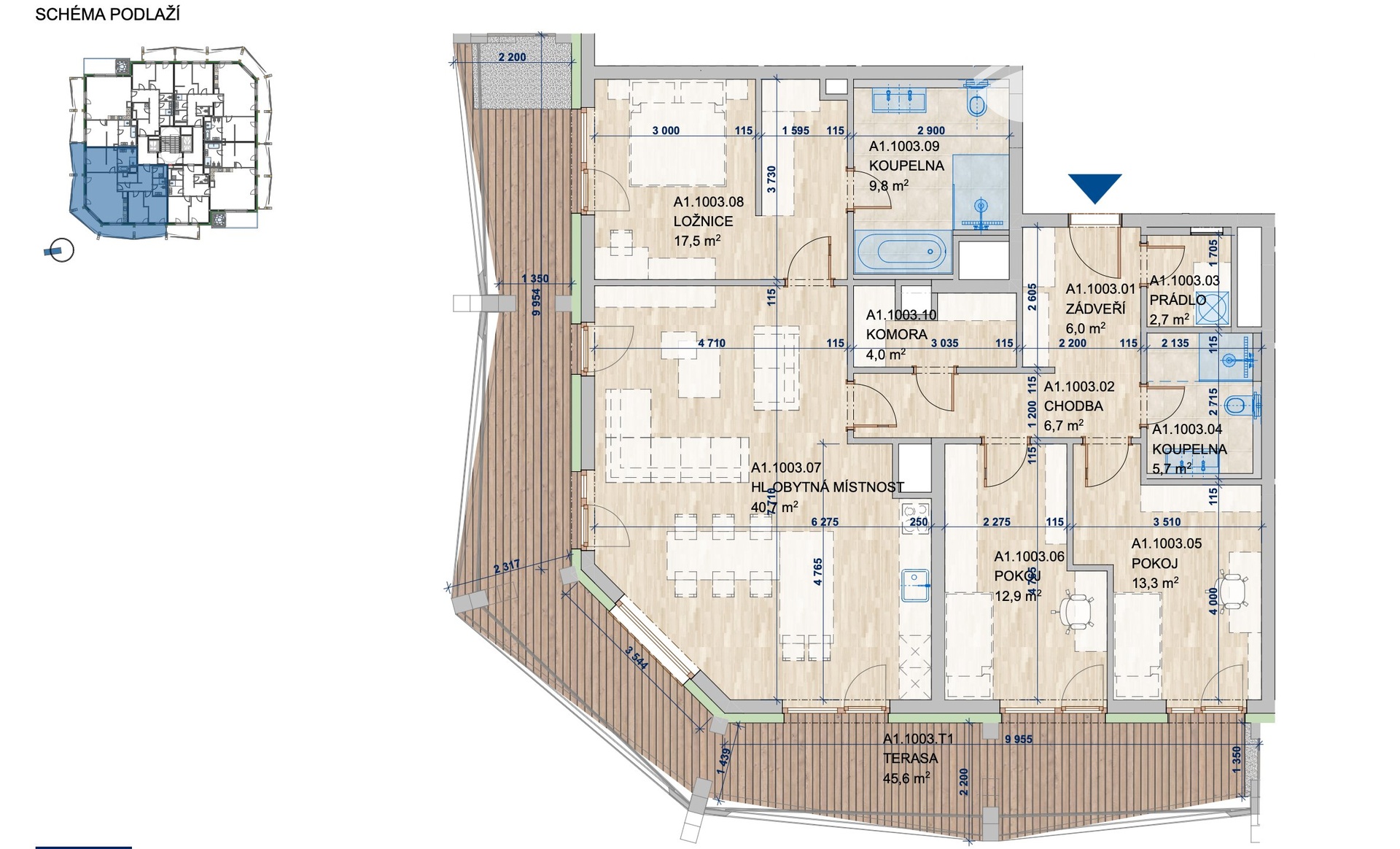 Součástí bytu je také prostorná terasa o celkové ploše 45,6 m², ideální pro relaxaci, slunění nebo setkávání s přáteli.