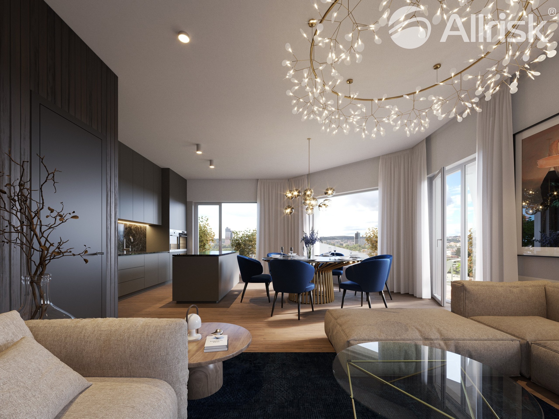 velkorysý obývací prostor (40,8 m²) plynule navazuje na elegantní kuchyňský kout – ideální pro rodinný život i reprezentativní společenské chvíle
