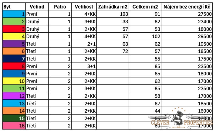 Dispozice a ceny zahrnují byty 2+kk, 2+1, 3+kk, 3+1 a 4+kk o velikostech od 44 do 102 m². Nájemné se pohybuje v rozmezí 16.000,- Kč až 27.500,- Kč měsíčně + zálohy na služby a energie - dle velikosti a umístění bytu. Nastěhování je možné ihned.