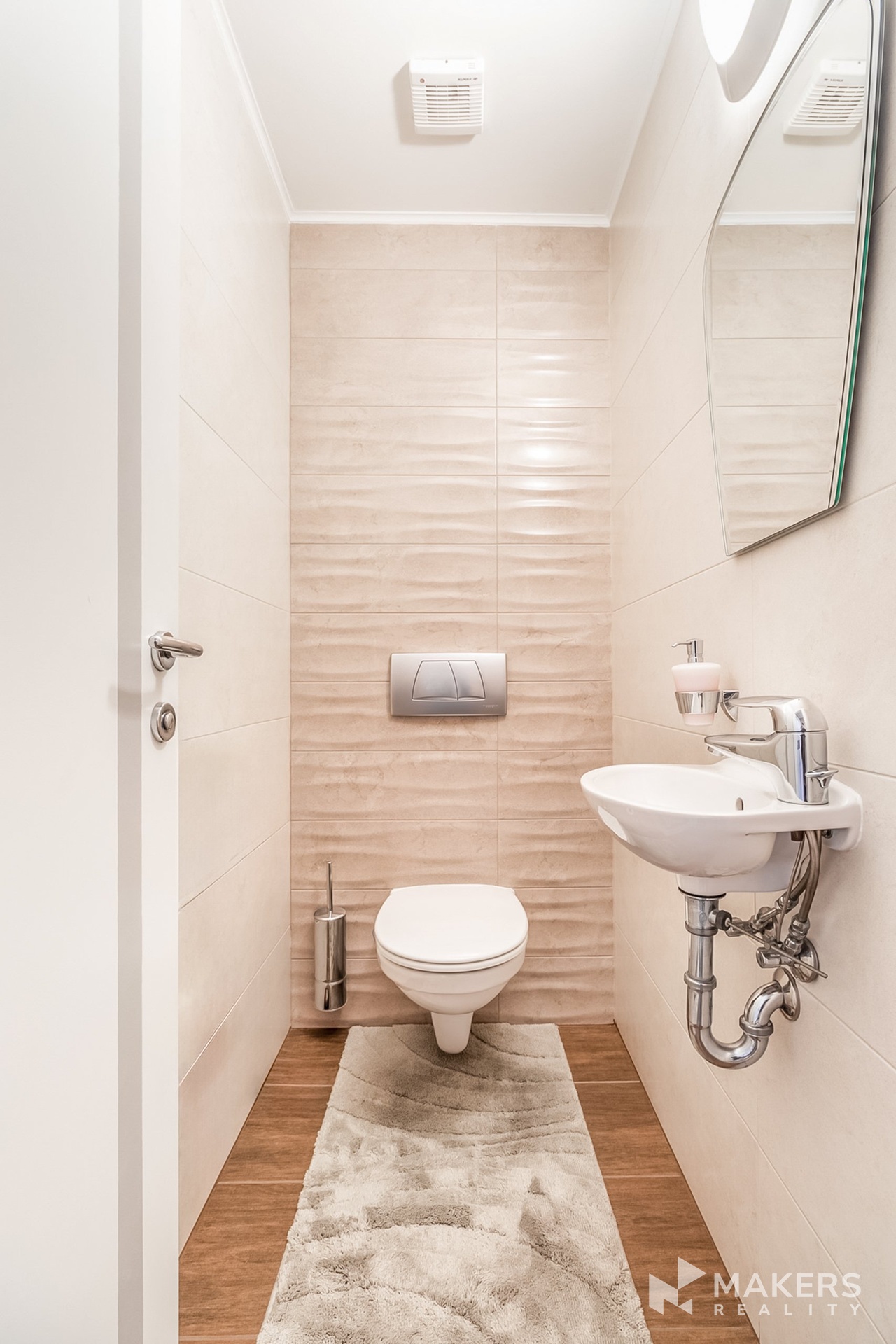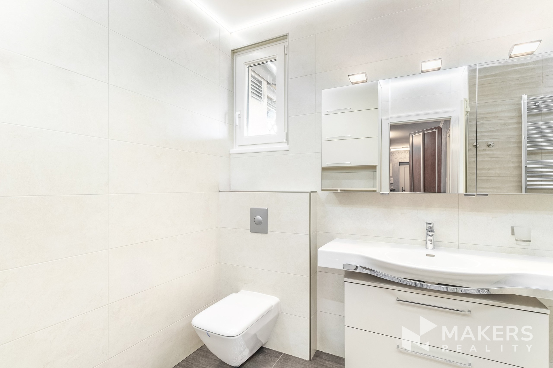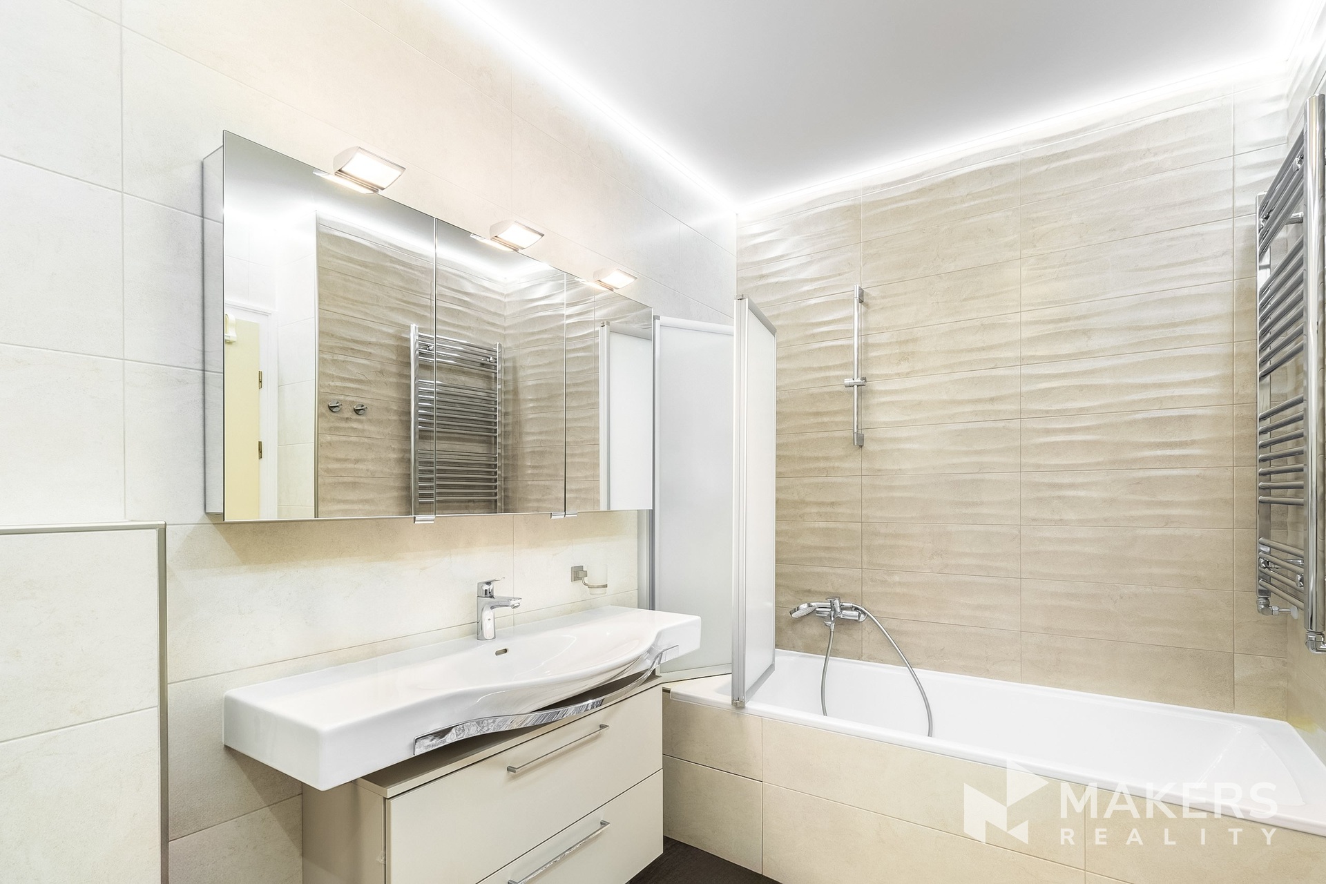V koupelně je vana, toaleta a pračka. Podlahy tvoří kombinace parket a dlažby, obývací pokoj je vybaven elegantní plovoucí podlahou.