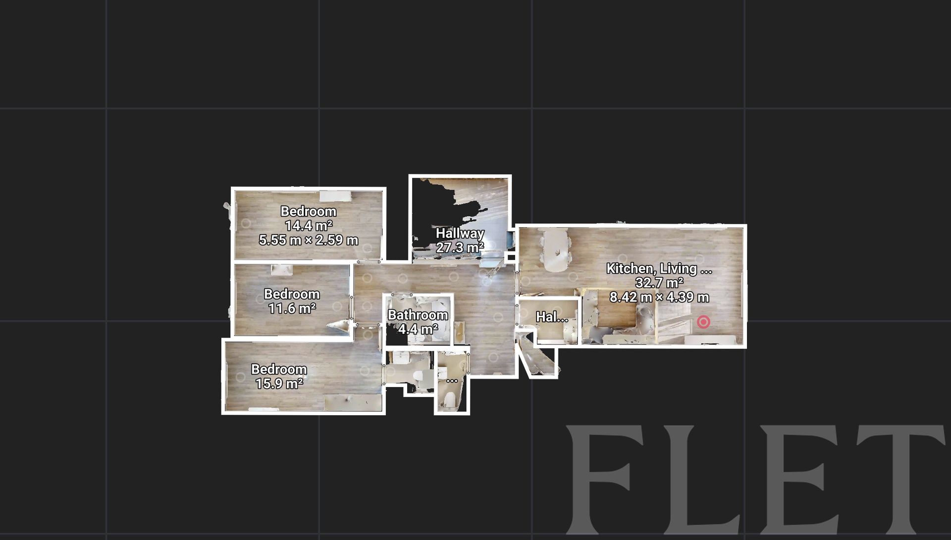 Při vstupu do bytu vás uvítá prostorná chodba, odkud se dostanete do všech pokojů. Světlý obývací pokoj je propojen s moderním kuchyňským koutem, který nabízí všechny nezbytné spotřebiče a dostatek úložného prostoru. Součástí je i jídelní část s jídelním stolem a židlemi. Zbylé tři pokoje můžete využít např. jako ložnici, pracovnu a dětský pokoj. V jednom z pokojů je velká vestavěná šatní skříň, v druhém vás nadchne soukromá toaleta. V druhé koupelně si budete moci užívat relax ve vaně a jistě vás potěší přítomnost pračky a sušičky. Posledními místnostmi jsou oddělená toaleta a praktická komora. Velkou předností bytu je hezká rohová terasa s venkovním nábytkem a s výhledem do klidné zástavby. Jak již bylo zmíněno, s parkováním si starosti dělat nemusíte, k bytu náleží garážové stání přímo v domě.