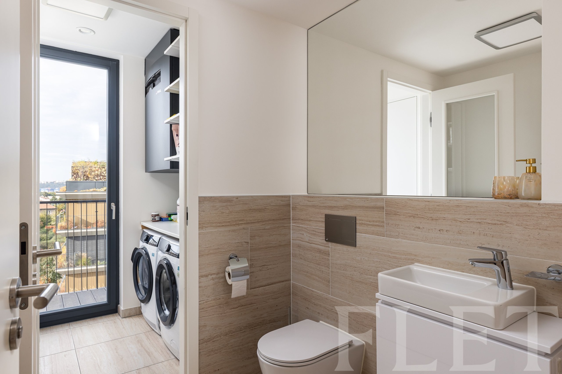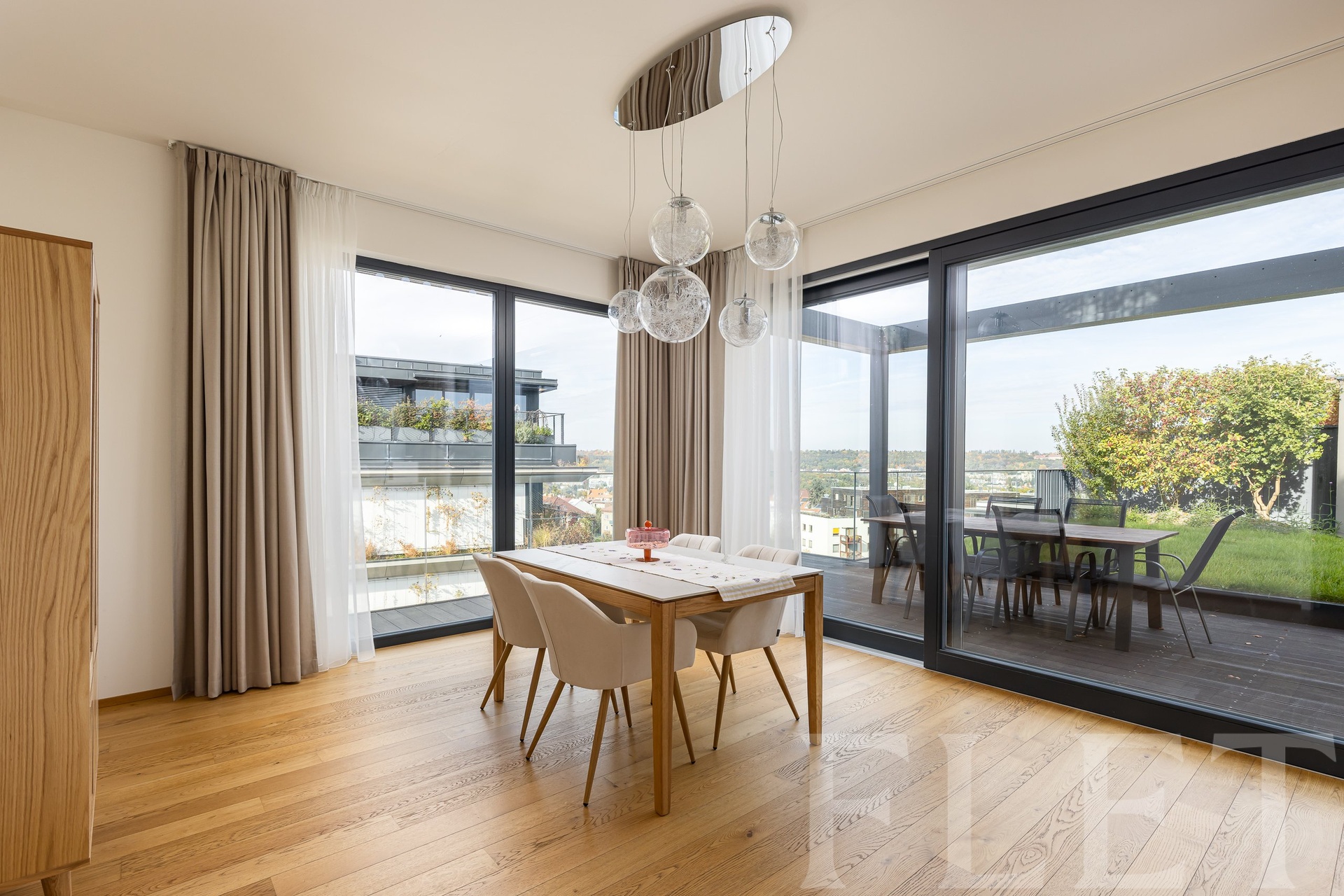 Dominantou bytu je velkorysý obývací prostor s nadčasovou kuchyňskou linkou vybavenou spotřebiči nejvyšší třídy. Odtud je přímý vstup na rozlehlou terasu s panoramatickým výhledem na celou Prahu, která se stane vaším nejoblíbenějším místem k odpočinku i večerním posezením. Hlavní ložnice disponuje soukromým balkónem, zatímco koupelna vyniká luxusními materiály, dvěma umyvadly, vanou i sprchovým koutem. K dispozici je také samostatná toaleta a technická místnost s pračkou a sušičkou. Dřevěné podlahy, velkoformátová okna, klimatizace a špičkové úložné prostory dotvářejí atmosféru moderního městského luxusu. Součástí nájmu jsou dvě garážová stání a dva sklepy.