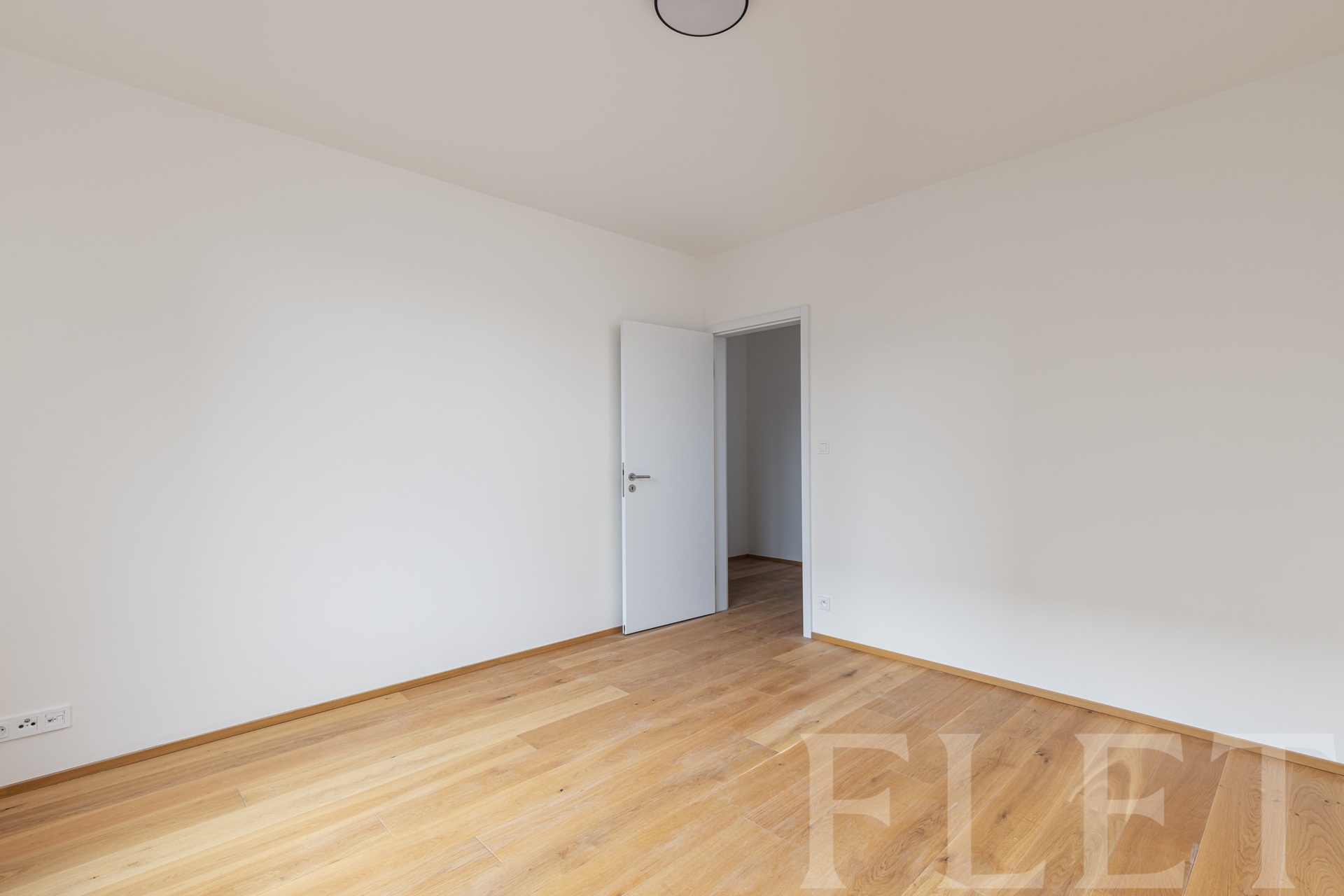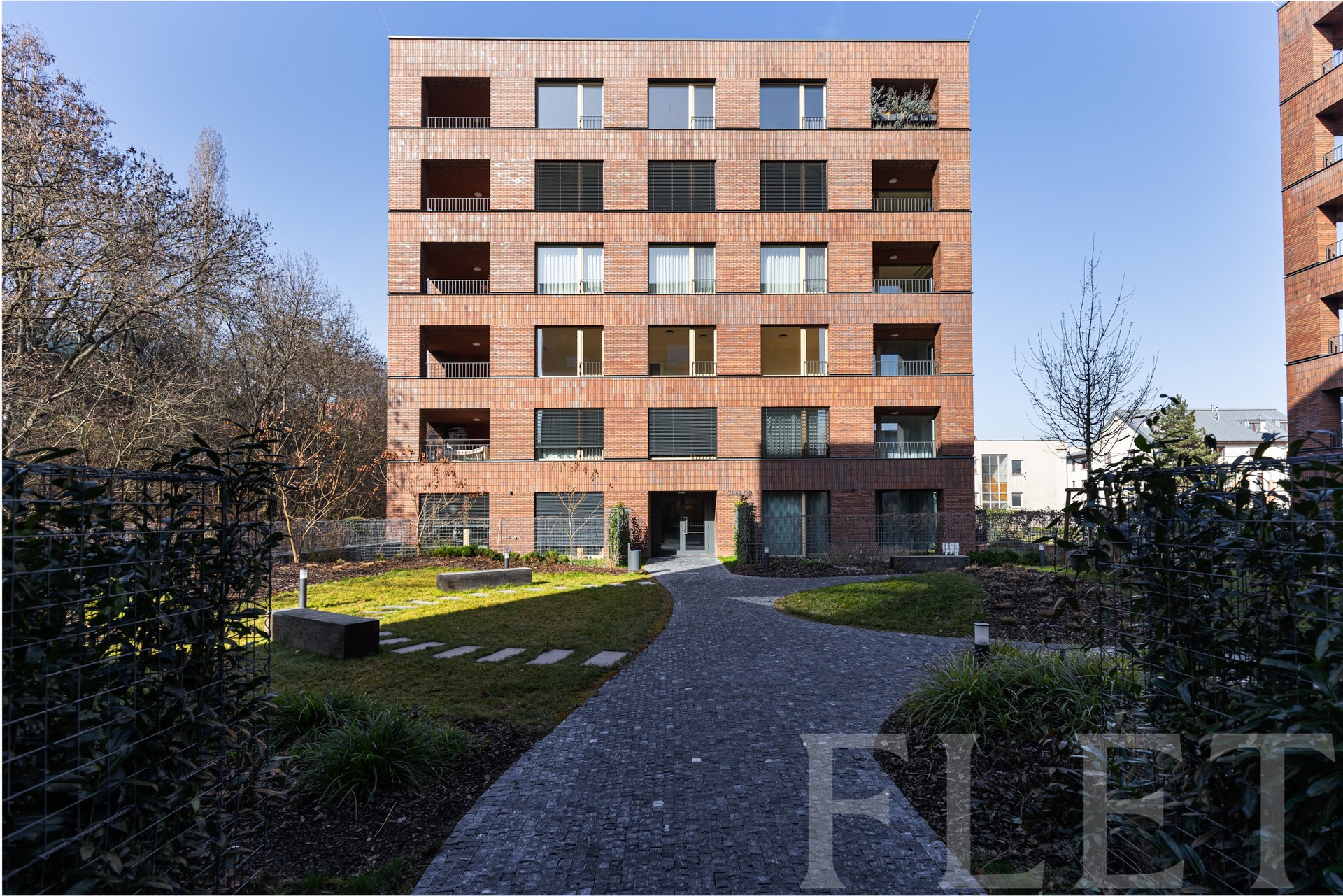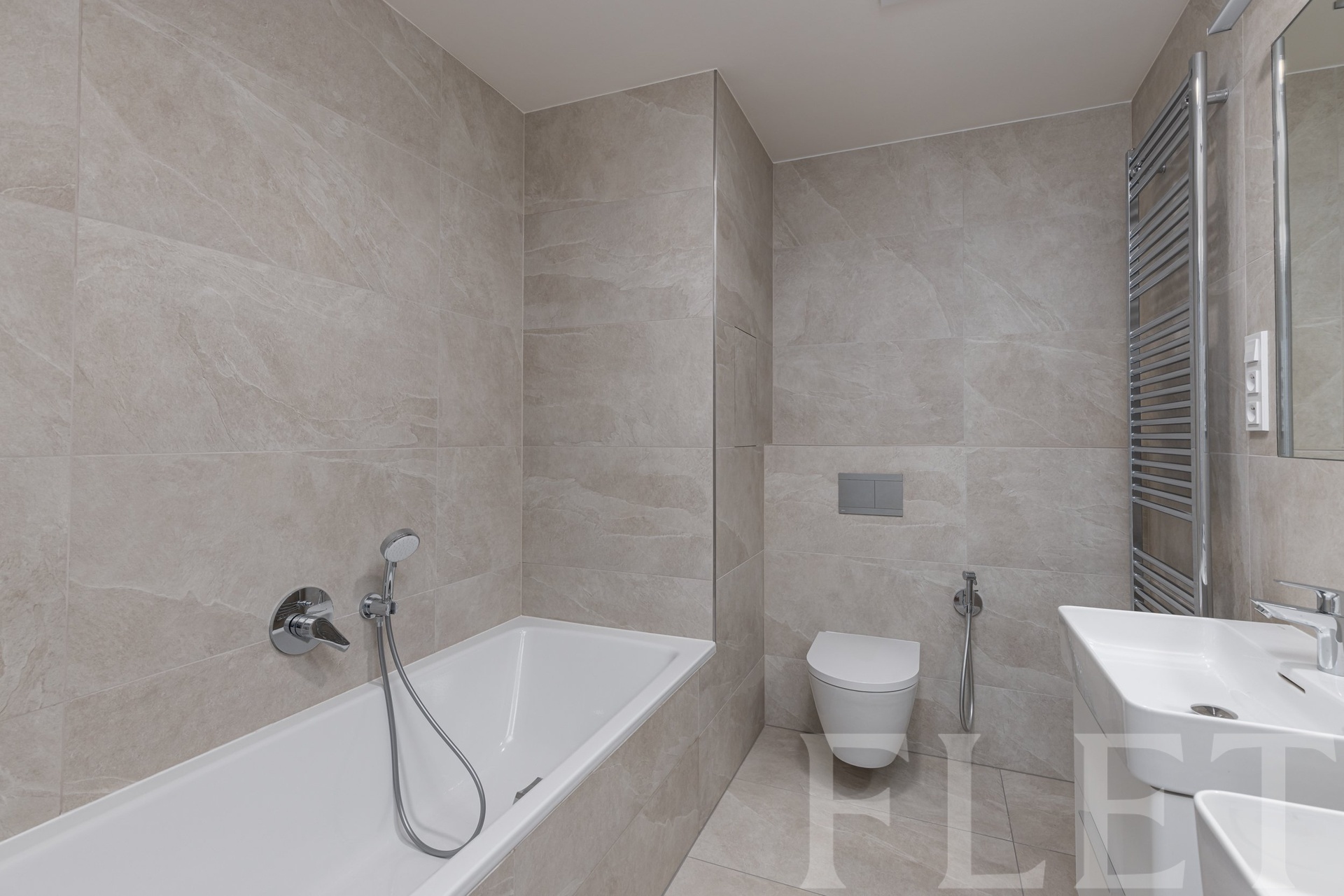 Dominantou bytu je prostorný obývací pokoj s kuchyňským koutem, který tvoří přirozené centrum celého bytu. Kuchyňská linka je vybavena moderními spotřebiči – indukční varnou deskou, troubou, digestoří, myčkou a lednicí s mrazákem. Dispozici dále doplňují tři samostatné pokoje, které mohou sloužit jako ložnice, dětské pokoje nebo pracovna. Velkým benefitem jsou dvě plnohodnotné koupelny – jedna se sprchovým koutem a toaletou, druhá s vanou, dvěma umyvadly a toaletou. Komfort každodenního fungování zvyšuje ještě samostatná toaleta a praktická technická místnost s pračkou. V domě je navíc k dispozici kočárkárna.
