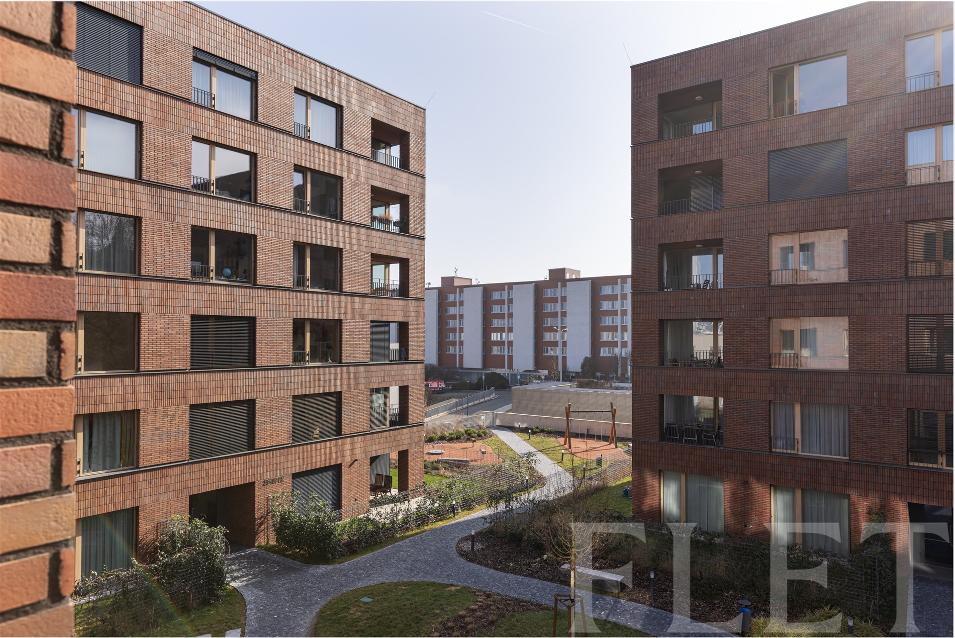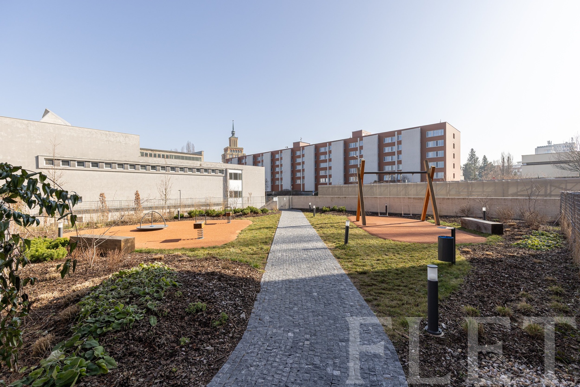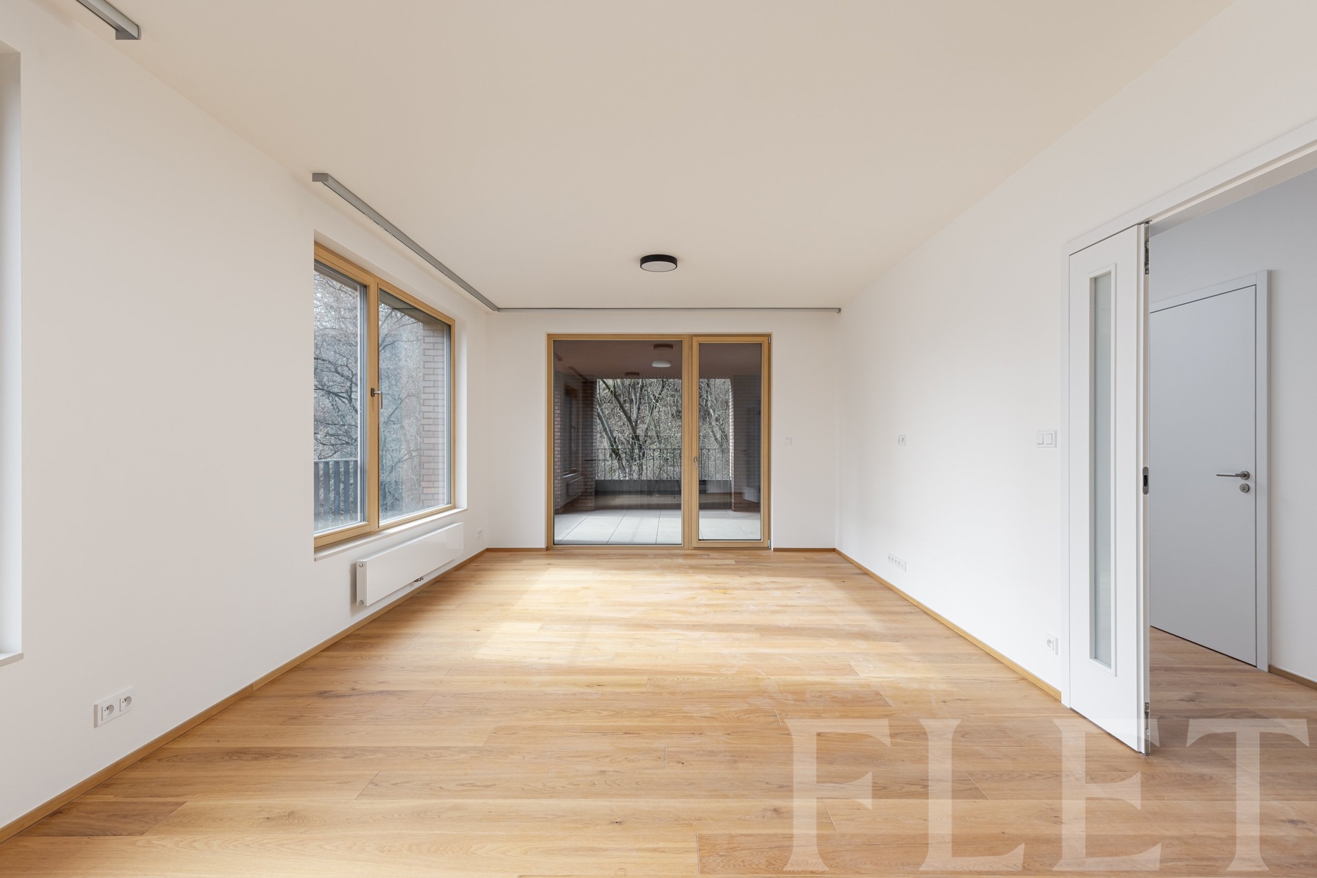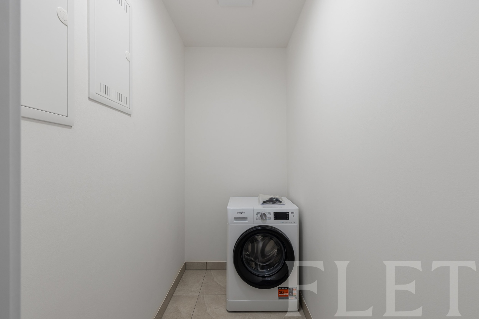 Dominantou bytu je prostorný obývací pokoj s kuchyňským koutem, který tvoří přirozené centrum celého bytu. Kuchyňská linka je vybavena moderními spotřebiči – indukční varnou deskou, troubou, digestoří, myčkou a lednicí s mrazákem. Dispozici dále doplňují tři samostatné pokoje, které mohou sloužit jako ložnice, dětské pokoje nebo pracovna. Velkým benefitem jsou dvě plnohodnotné koupelny – jedna se sprchovým koutem a toaletou, druhá s vanou, dvěma umyvadly a toaletou. Komfort každodenního fungování zvyšuje ještě samostatná toaleta a praktická technická místnost s pračkou. V domě je navíc k dispozici kočárkárna.