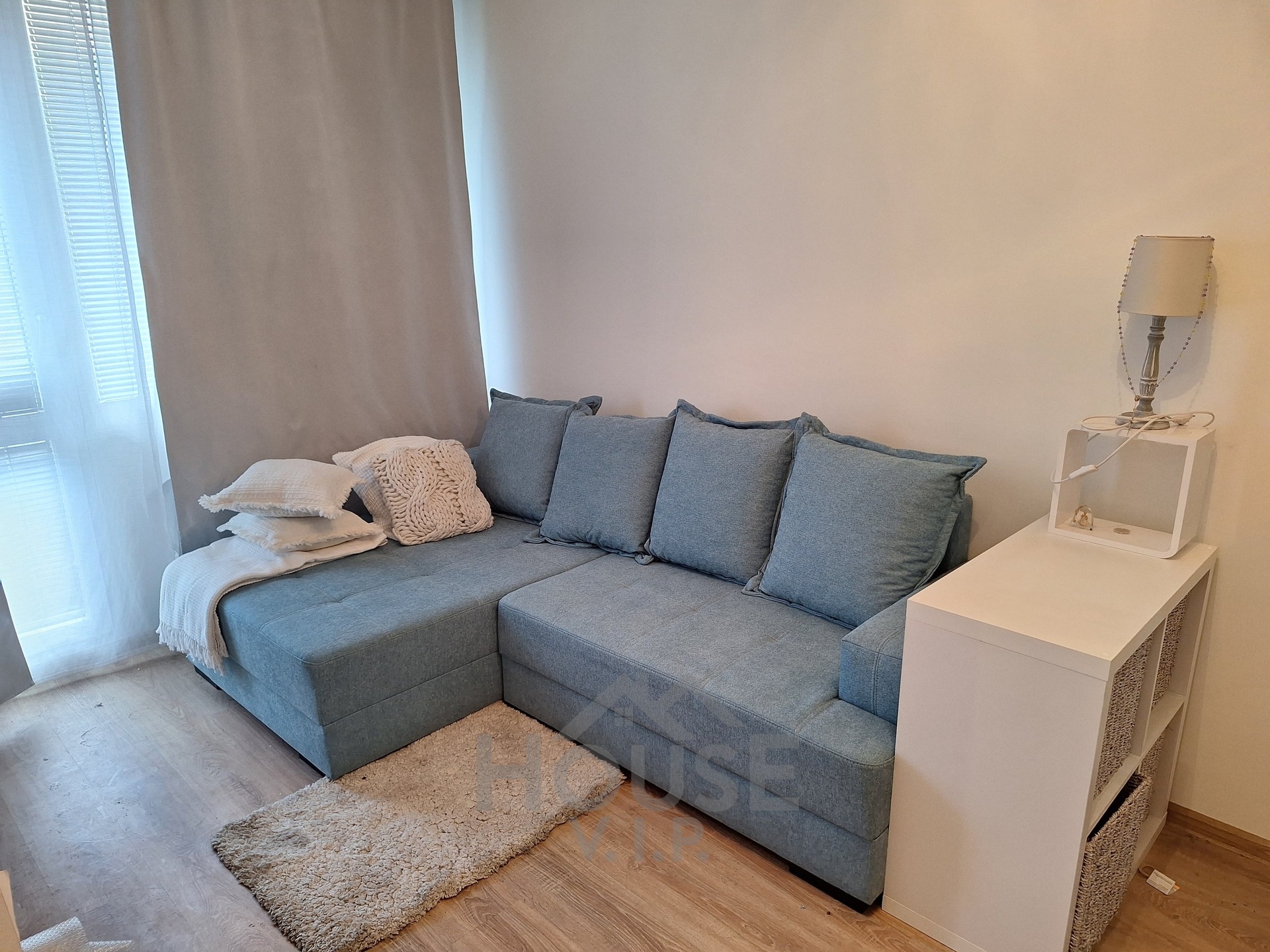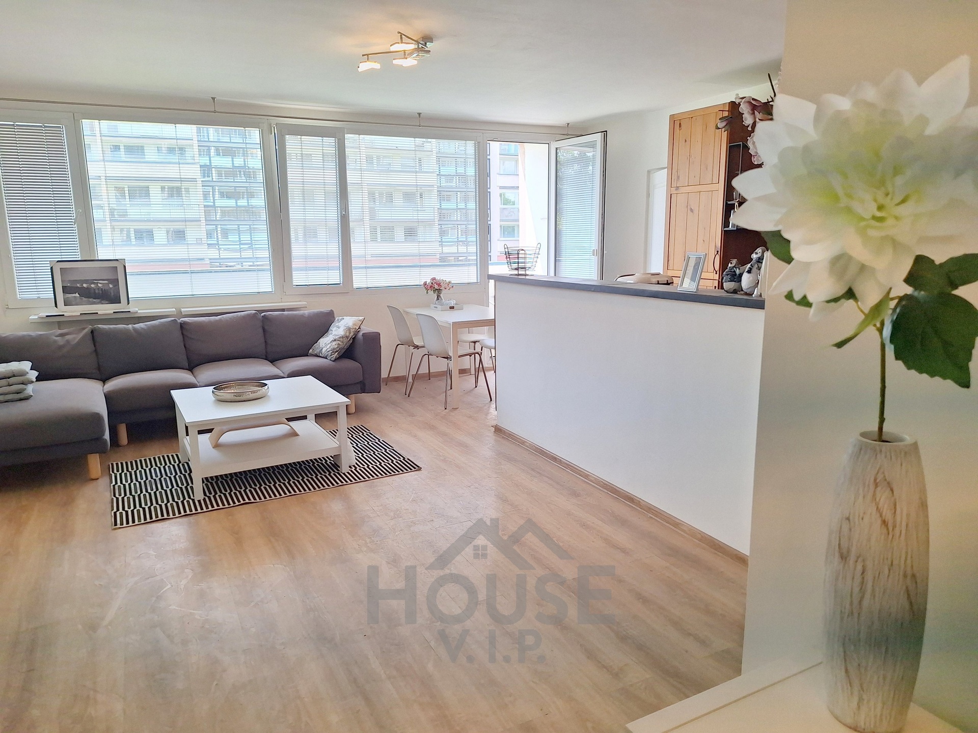 Okna jsou doplněná žaluziemi, na podlahách jsou plovoucí podlahy a dlažby, v koupelně pračka a žebříkové topení.
