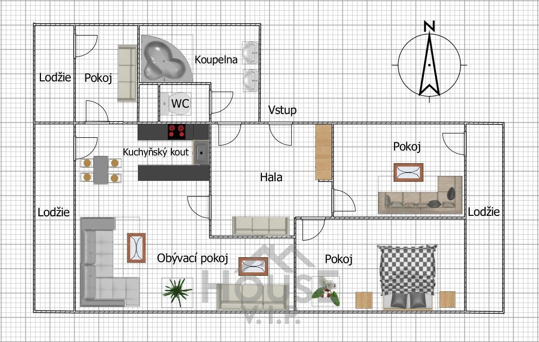 Byt tvoří prostorný obývací pokoj s kuchyňským koutem, tři samostatné ložnice, koupelna s vanou a s dvěma umyvadly, samostatná toaleta, prostorná vstupní hala a tři lodžie s výhledem do klidného okolí. Moderní kuchyňská linka je vybavena spotřebiči (el.trouba, plynová varná deska, lednice s mrazákem, myčka, mikrovlnná trouba) a kuchyňským nádobím. V obývací části a ložnicích je k dispozici nábytek (sedací soupravy, jídelní stůl, postele, vestavěné skříně atd.), který poskytuje dostatek úložného prostoru a prostoru na spaní.
