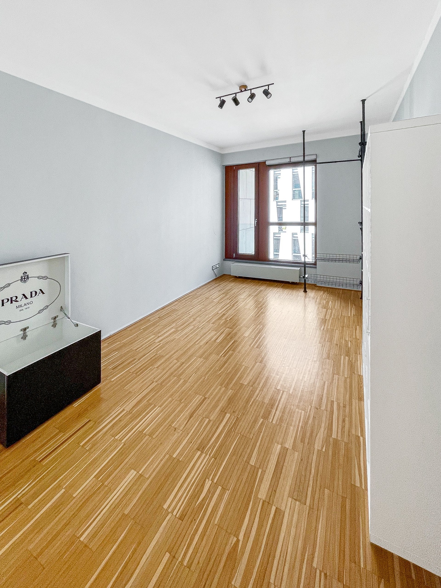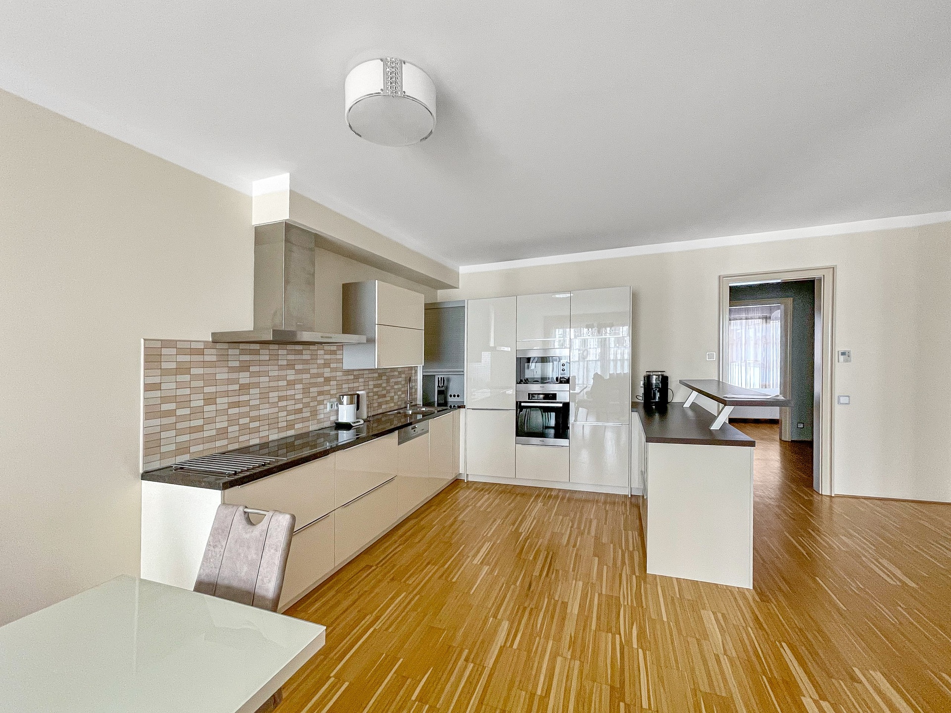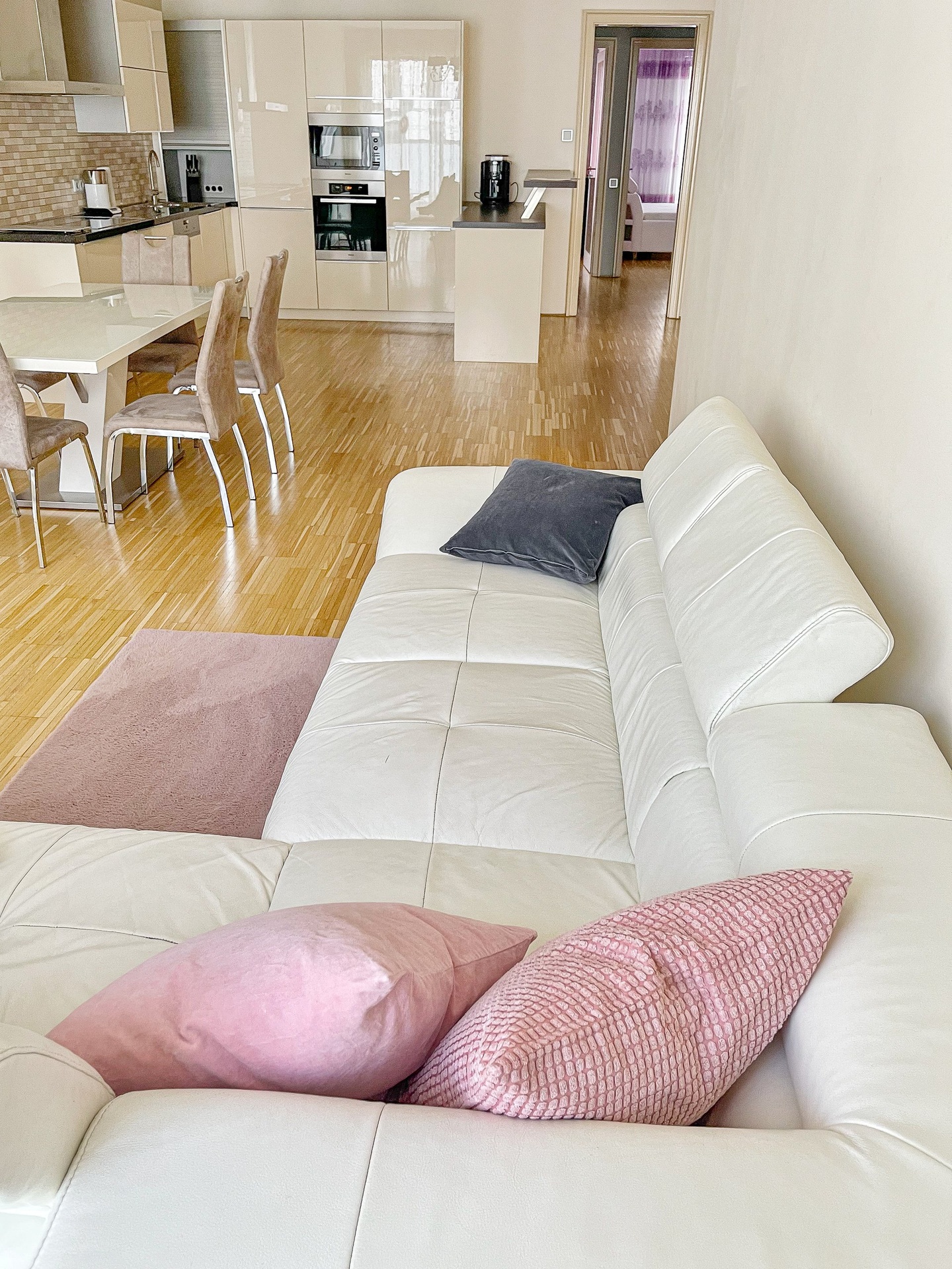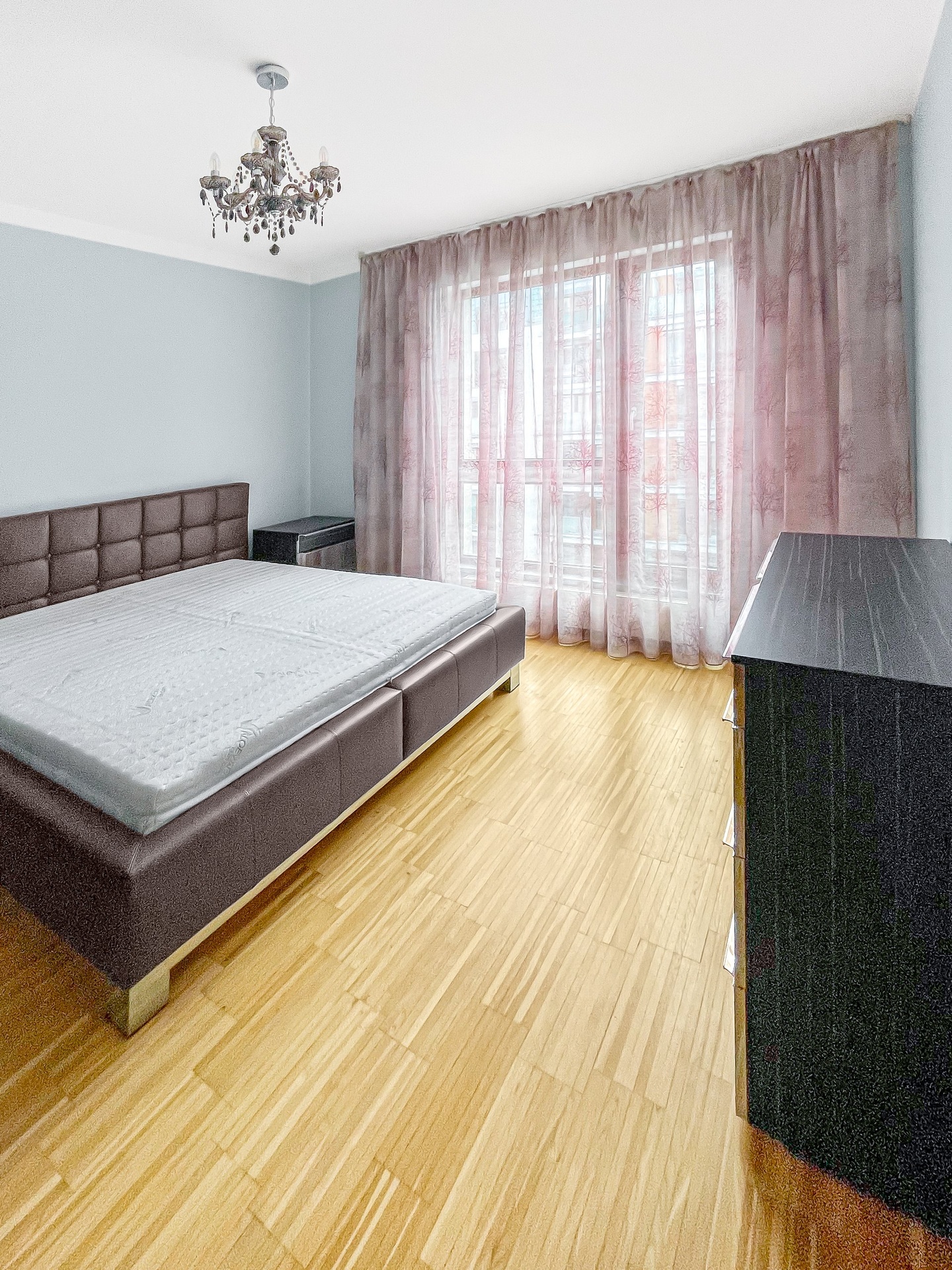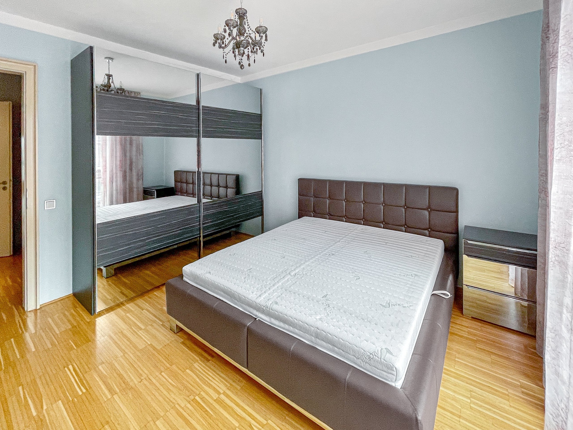Dispozice bytu tvoří velký obývací pokoj s kuchyní, dvě samostatné ložnice, šatna a prostorná terasa s výhledem na město. Podlahy jsou v celém bytě dřevěné.