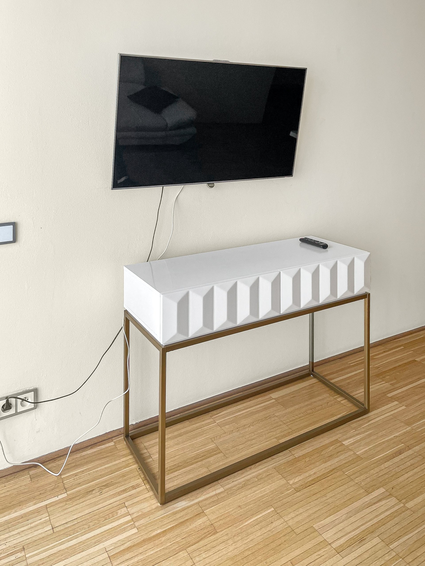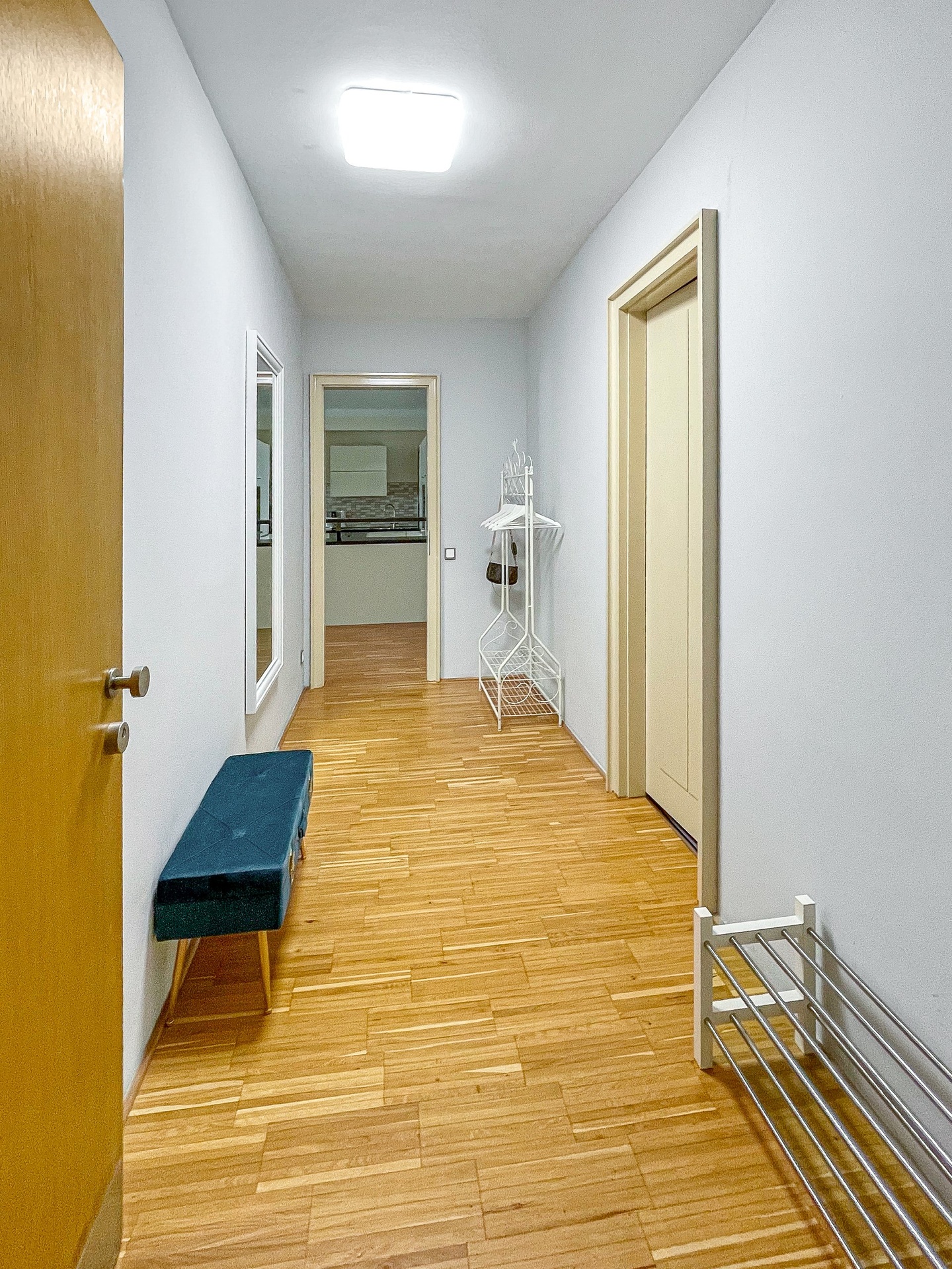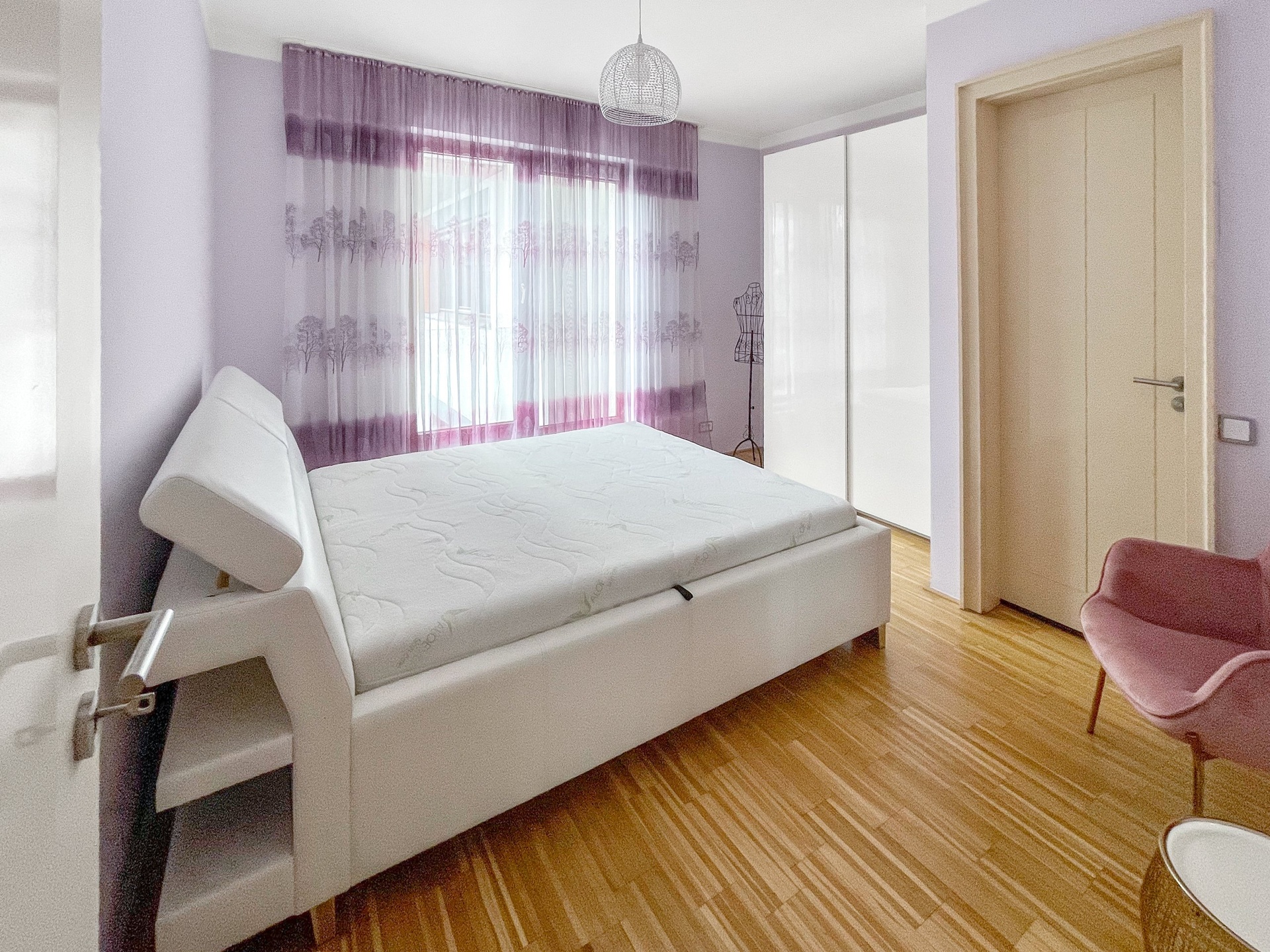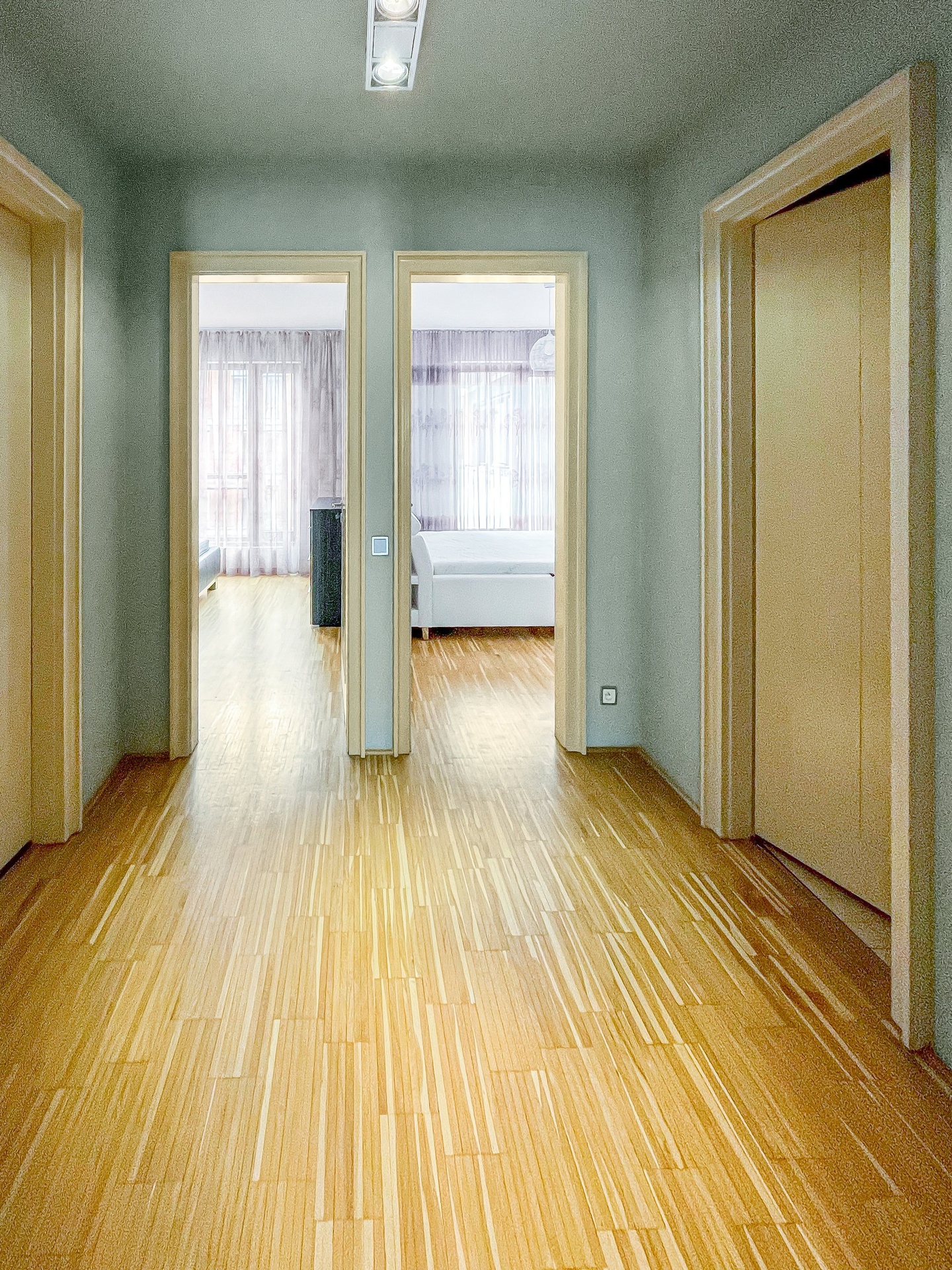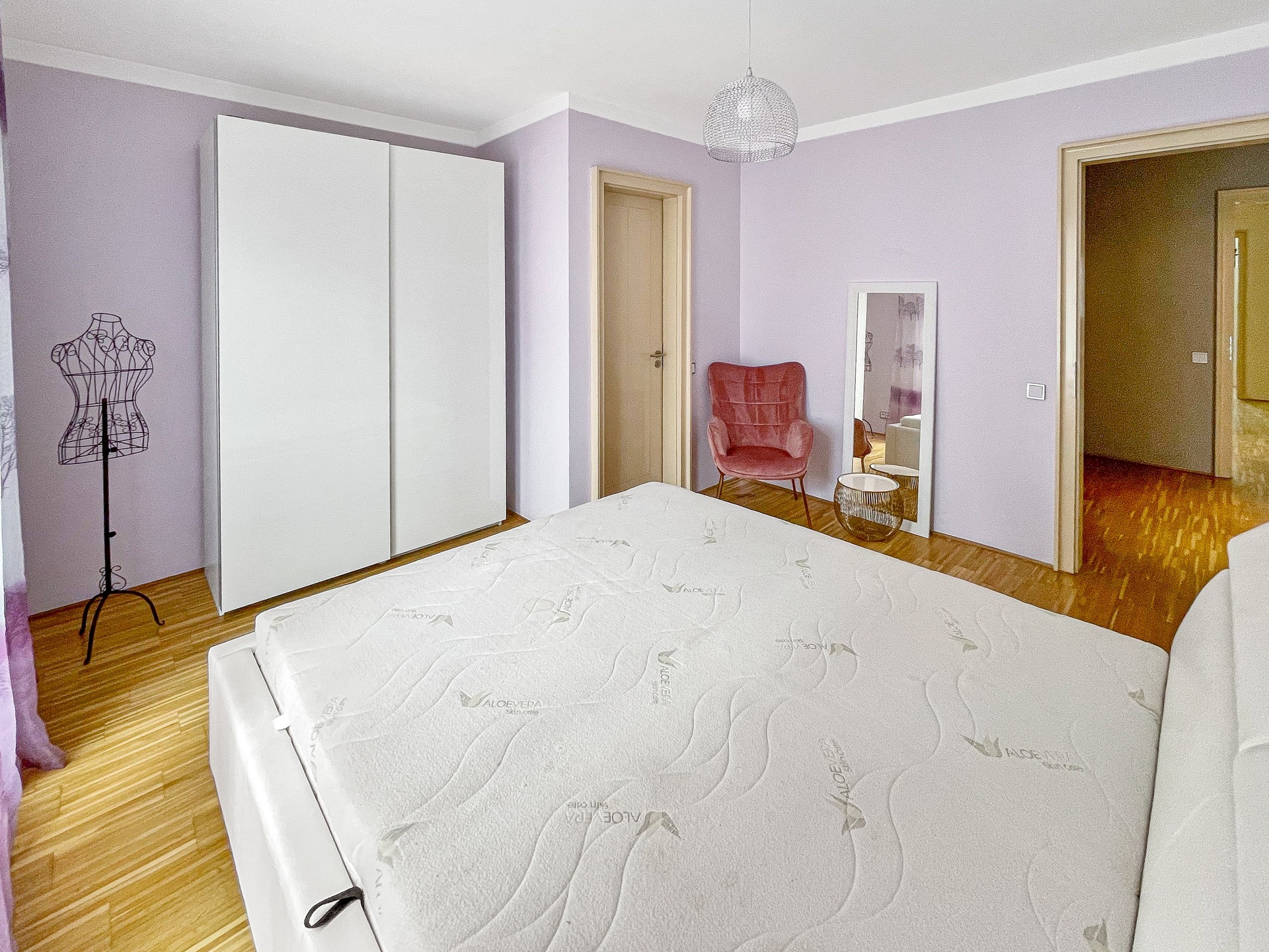 Dispozice bytu tvoří velký obývací pokoj s kuchyní, dvě samostatné ložnice, šatna a prostorná terasa s výhledem na město. Podlahy jsou v celém bytě dřevěné.