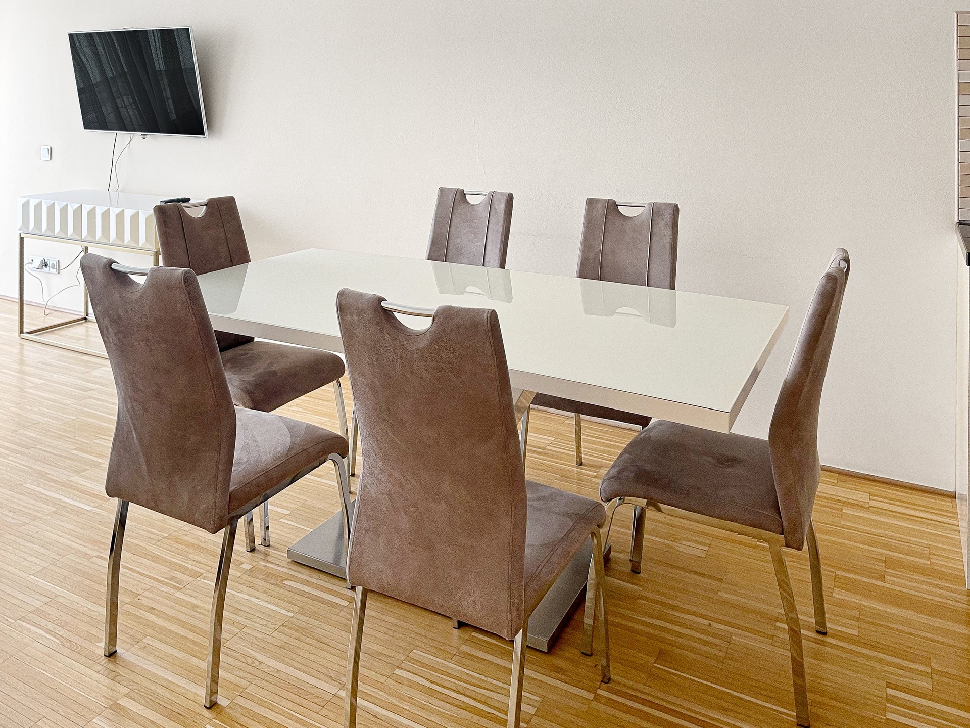 Kuchyň je plně vybavena vestavěnými spotřebiči, ostrůvkem s pracovní deskou a jídelním stolem pro 6 osob. V obývacím pokoji se nachází rohová pohovka a TV.