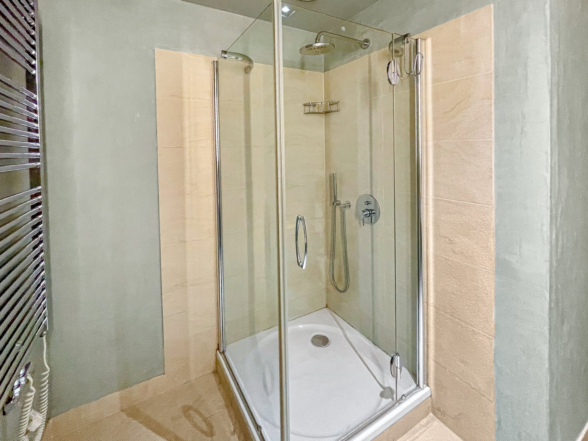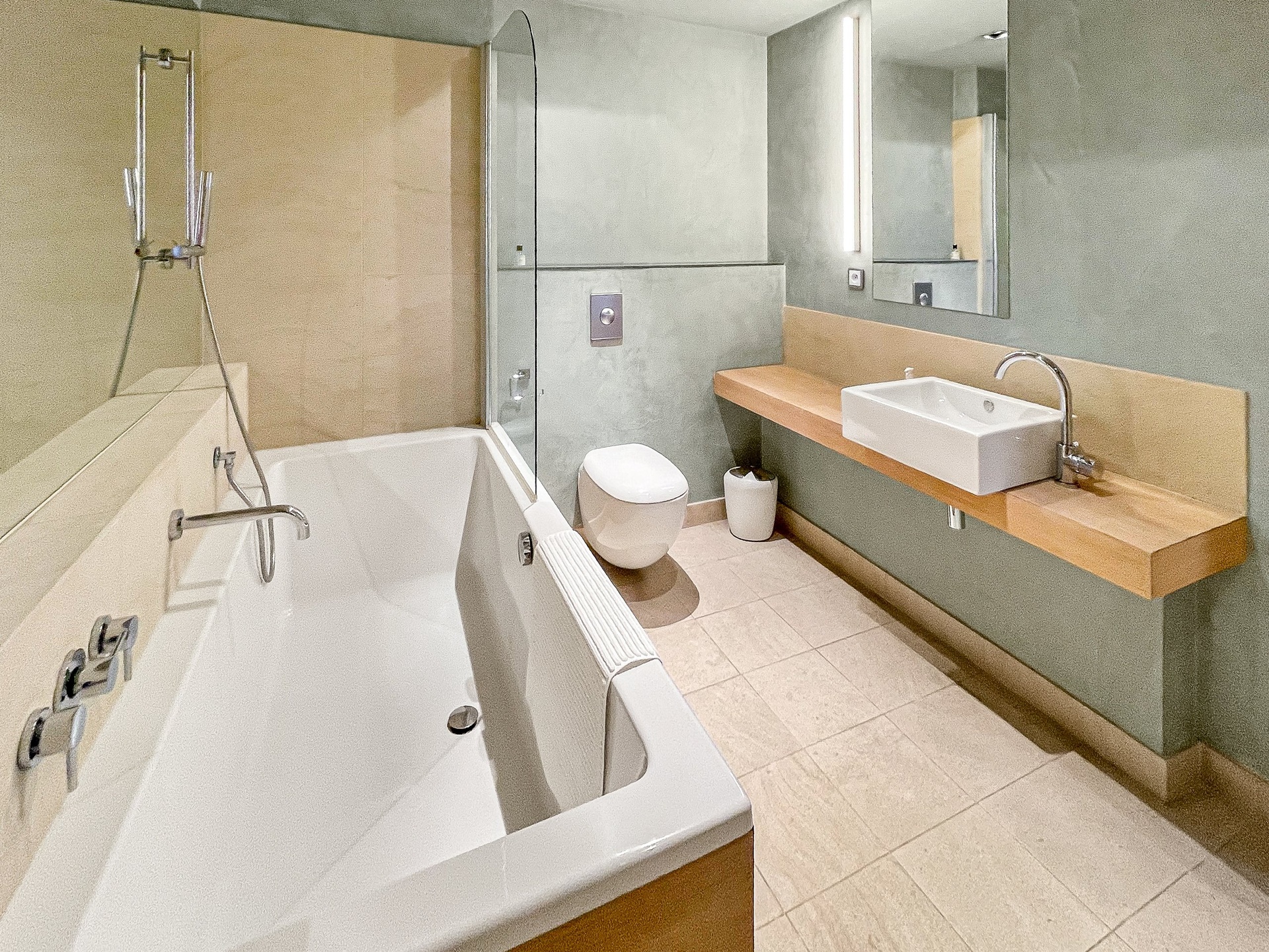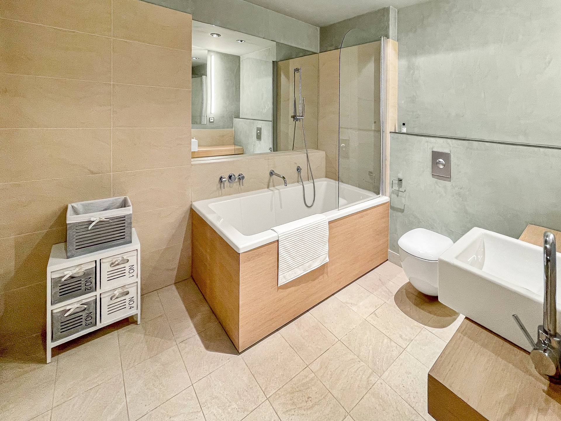 Byt disponuje dvěma koupelnami a samostatným WC. Hlavní koupelna je vybavena vanou, druhá sprchovým koutem. Nechybí ani technická místnost s pračkou a sušičkou Miele.