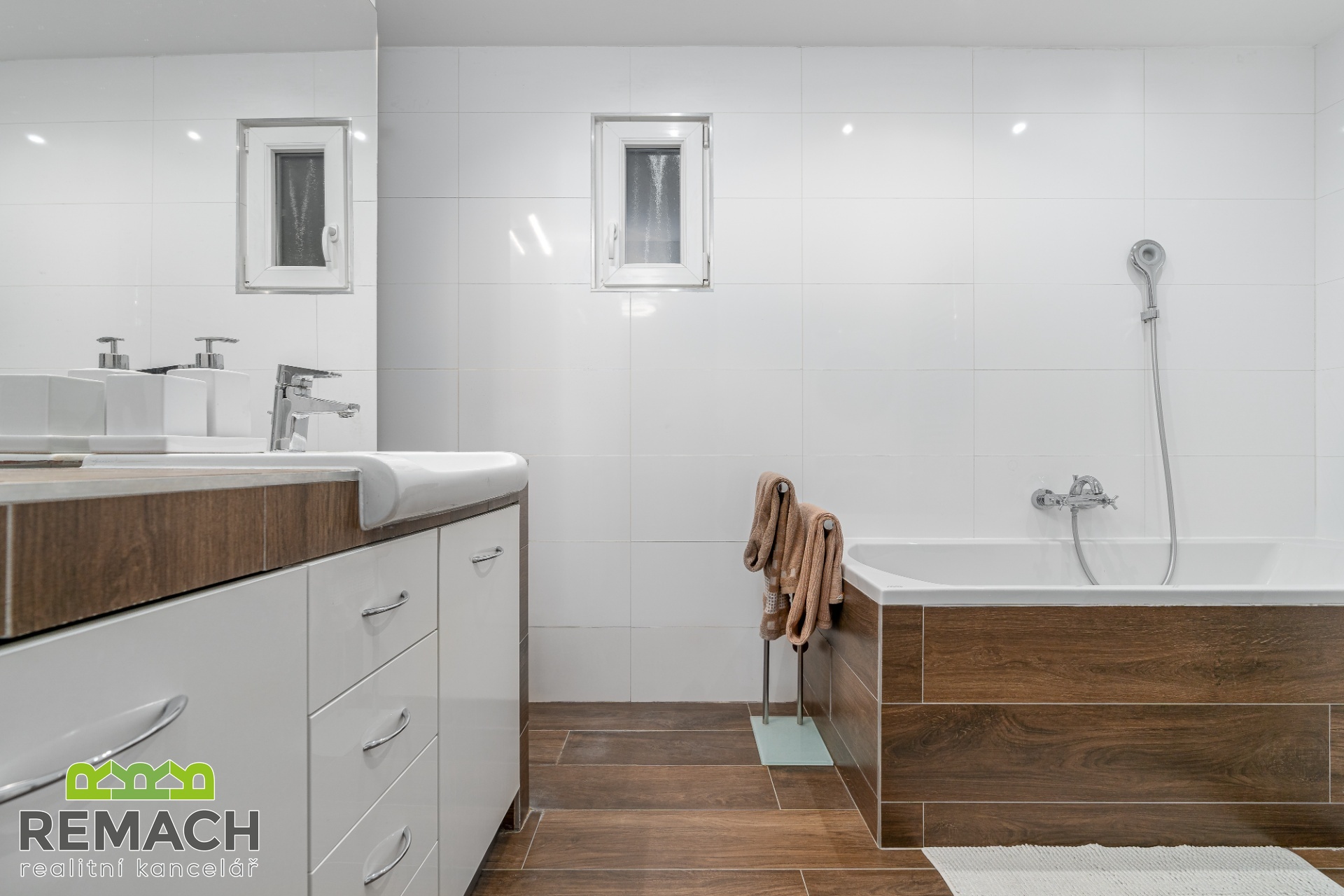 V přízemí se nachází obývací pokoj propojený s kuchyňským koutem a jídelním stolem, ložnice s vestavěnou skříní a komodou a samostatný nevybavený dětský pokoj. Koupelna je vybavena vanou i sprchovým koutem, toaleta je oddělená.