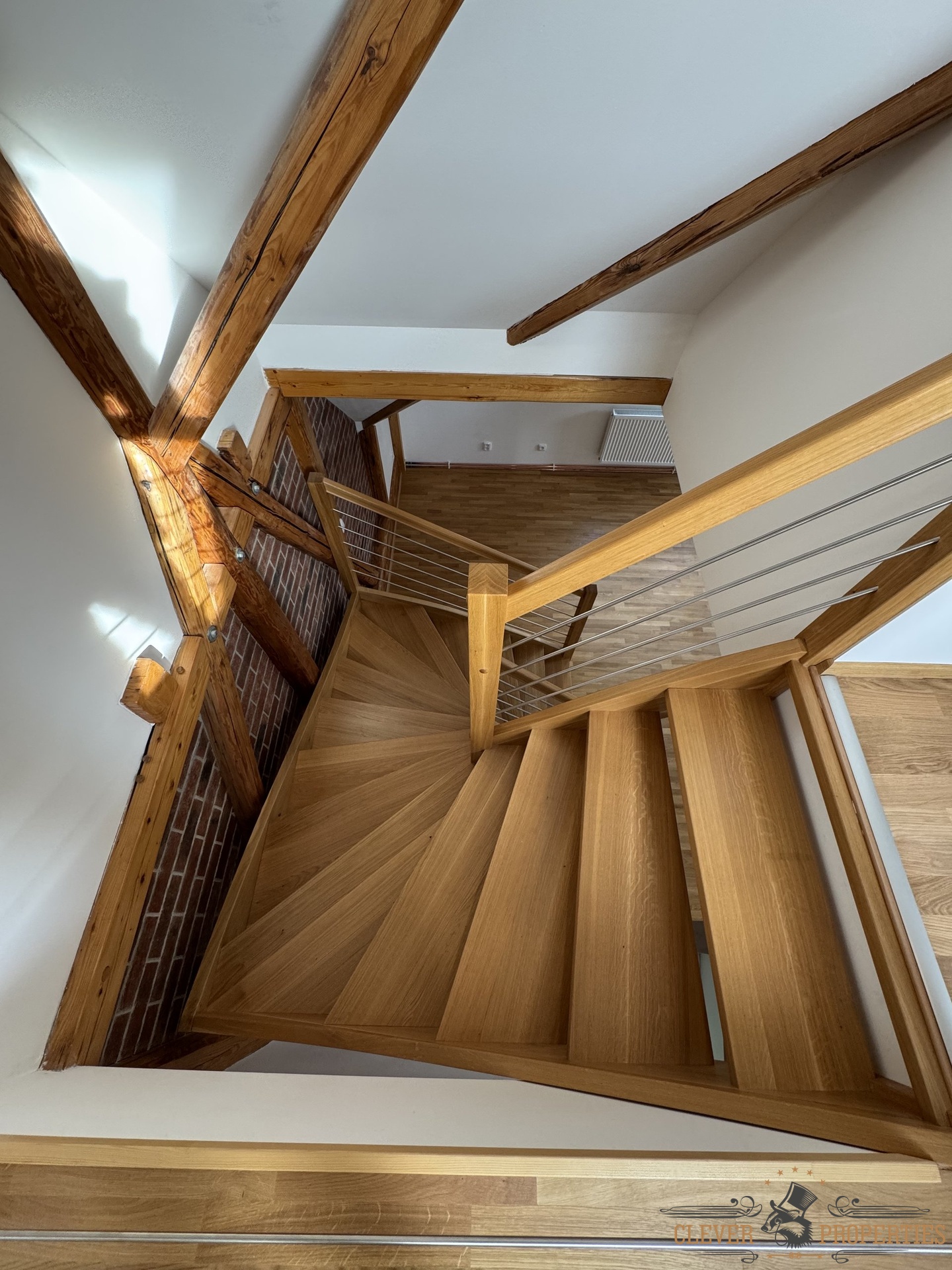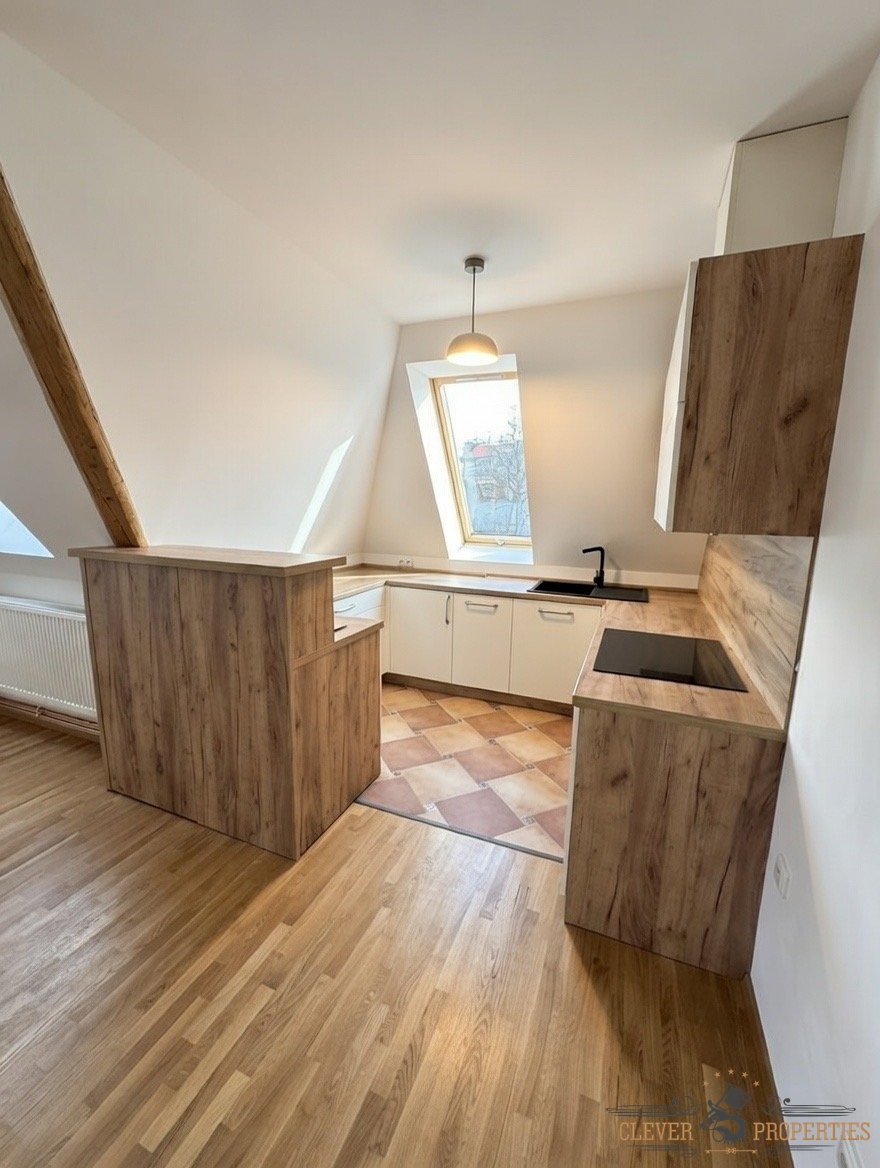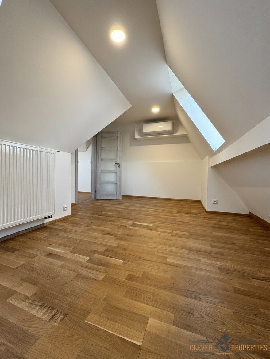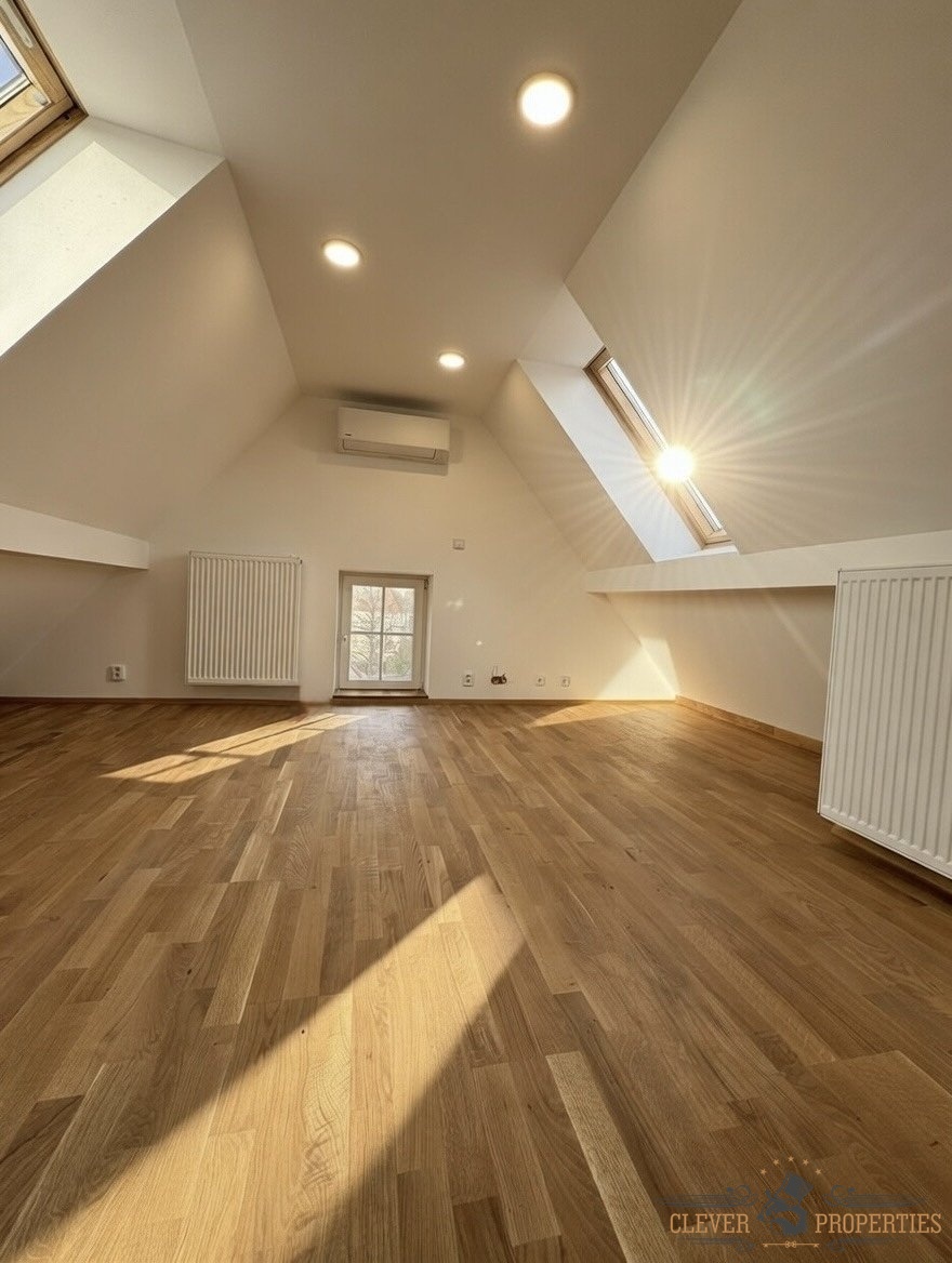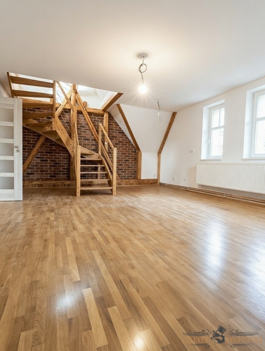Velkorysá plocha 140 m² rozložená do dvou podlaží nabízí vzdušnost, soukromí i přirozené oddělení denní a klidové části bytu. Autentické architektonické prvky a atmosféra domu dodávají interiéru jedinečný charakter.