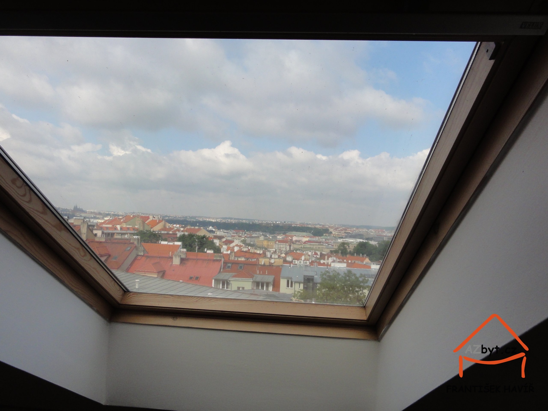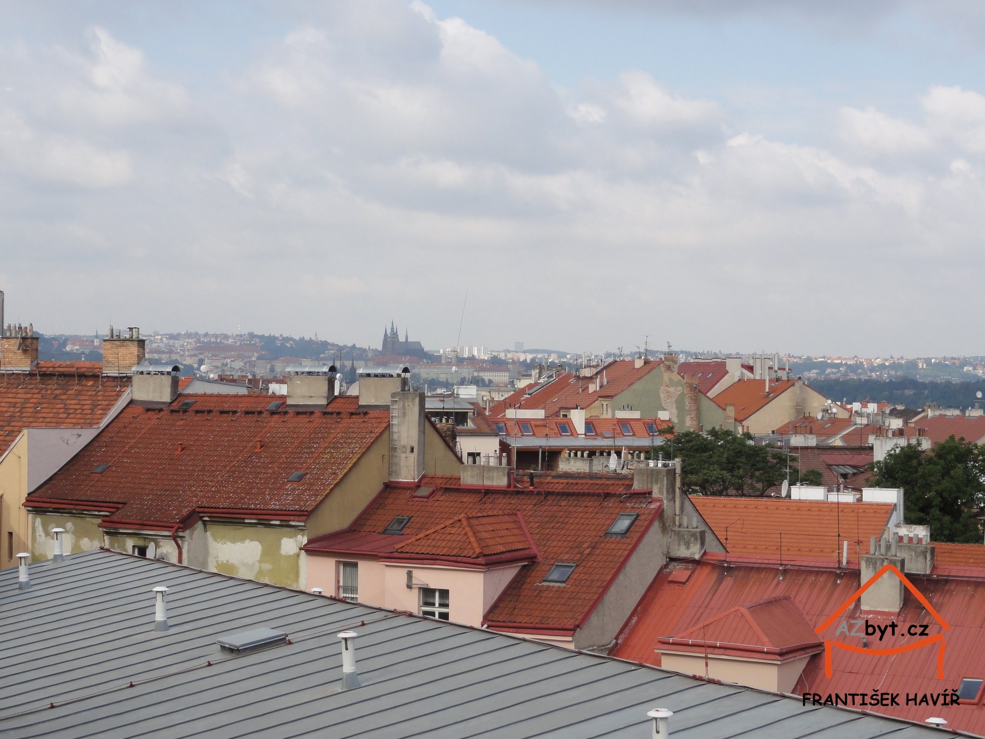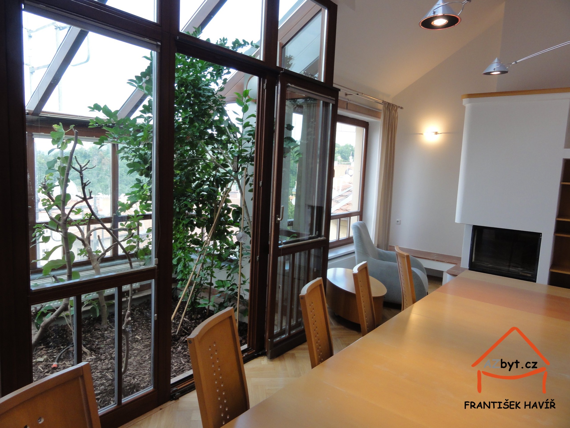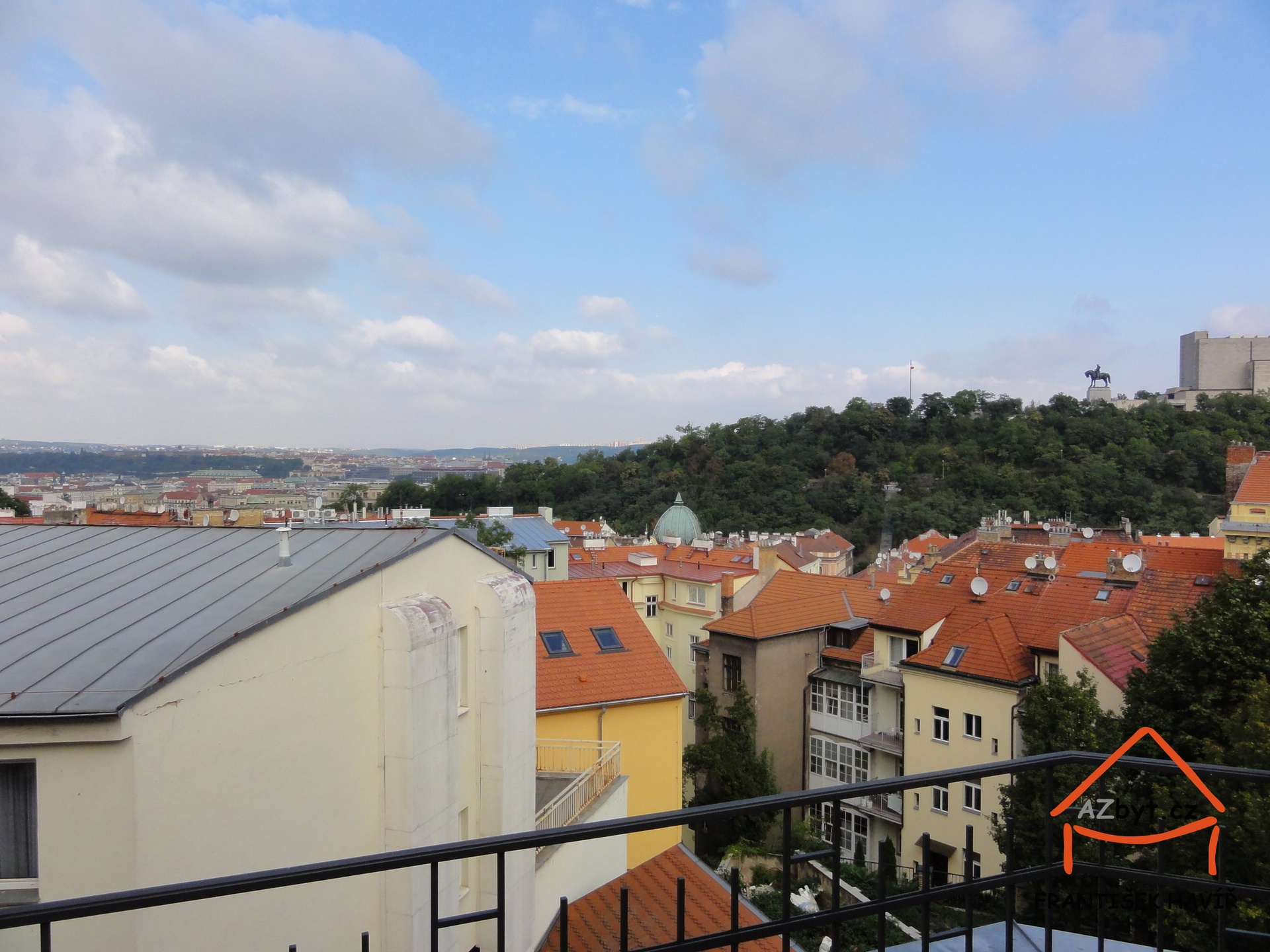 Byt se zimní zahradou a terasou s panoramatickým výhledem (Pražský hrad, Vítkov) je kompletně zařízen (fotografie) včetně nově vybavené kuchyně a nových matrací.